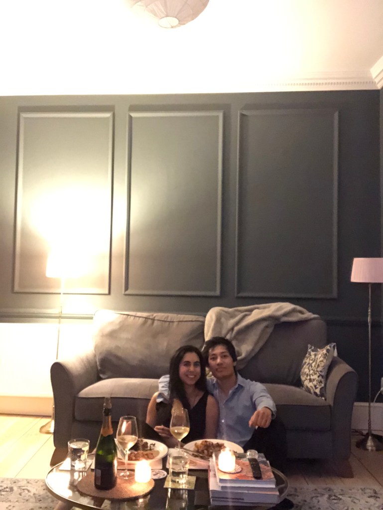 Alex told Leila to put make-up on and we dressed up for a date-night indoors. Alex ironed a shirt, Leila put on a black summer dress. The potatoes took exactly 1.5 hours to Leila’s chagrin. We opened a bottle of champagne and celebrated being stuck together in a house and making everything work out. The dinner was delicious, we had candles, a Spotify playlist and the Netflix fire playing over the top. We chatted about not knowing anything about multi-lateral institutions, how policy might play out (universal basic income etc.) and how we could make the best out of the situation and help the wider community. Then we took this photo on self-timer because otherwise every photo you will ever see on this this blog will be of Alex (Leila is self-appointed photographer).