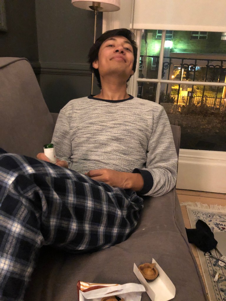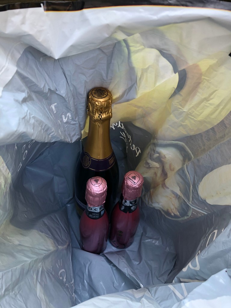 Alex was super energised and awake in the morning, while Leila was half asleep and feeling very unproductive. Alex spent the whole morning and afternoon (with a couple of zoom sections) working on his final digital transformation project. However, when we walked outside with coffee there was a M&S bag with champagne and two mini-bottles, we asked Kay and Tony who gave them and they said it was Andrea who we got the cigarettes for. Leila feels bad about complaining about getting the cigarettes.