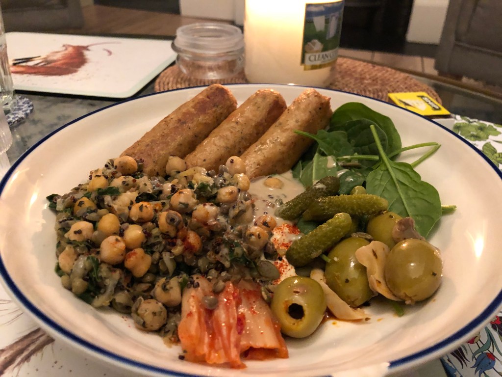 After getting back we cooked a mix of Alex and Leila cooking with Linda McCartney sausages, Kimchi, olives, chickpeas and leeks and some G&Ts on the side. We watched Sherlock which Leila actually liked. It was a super nice evening and we had dinner in our pyjamas which was weird for Alex but normal for Leila.