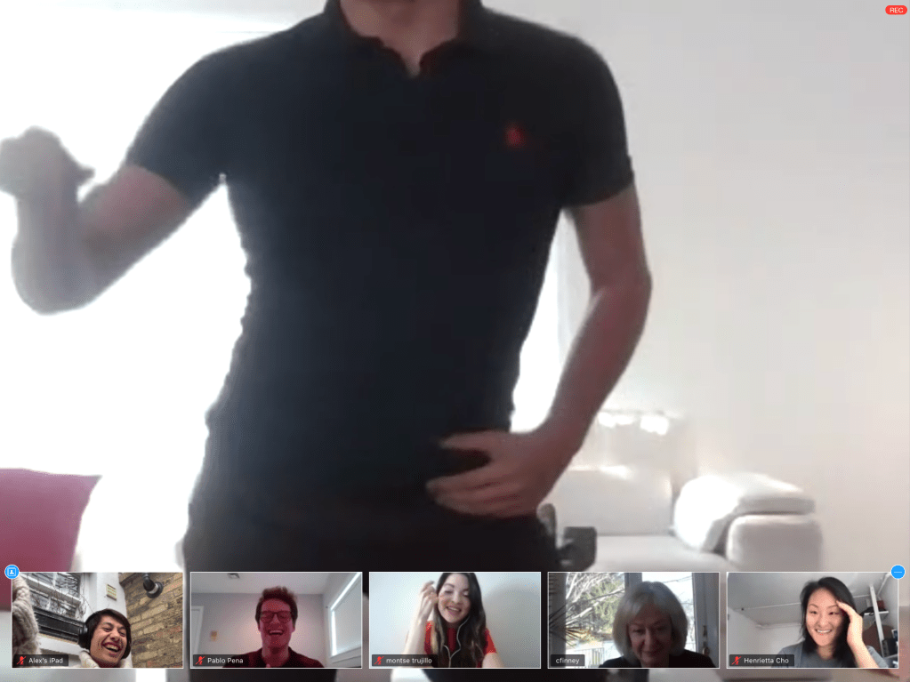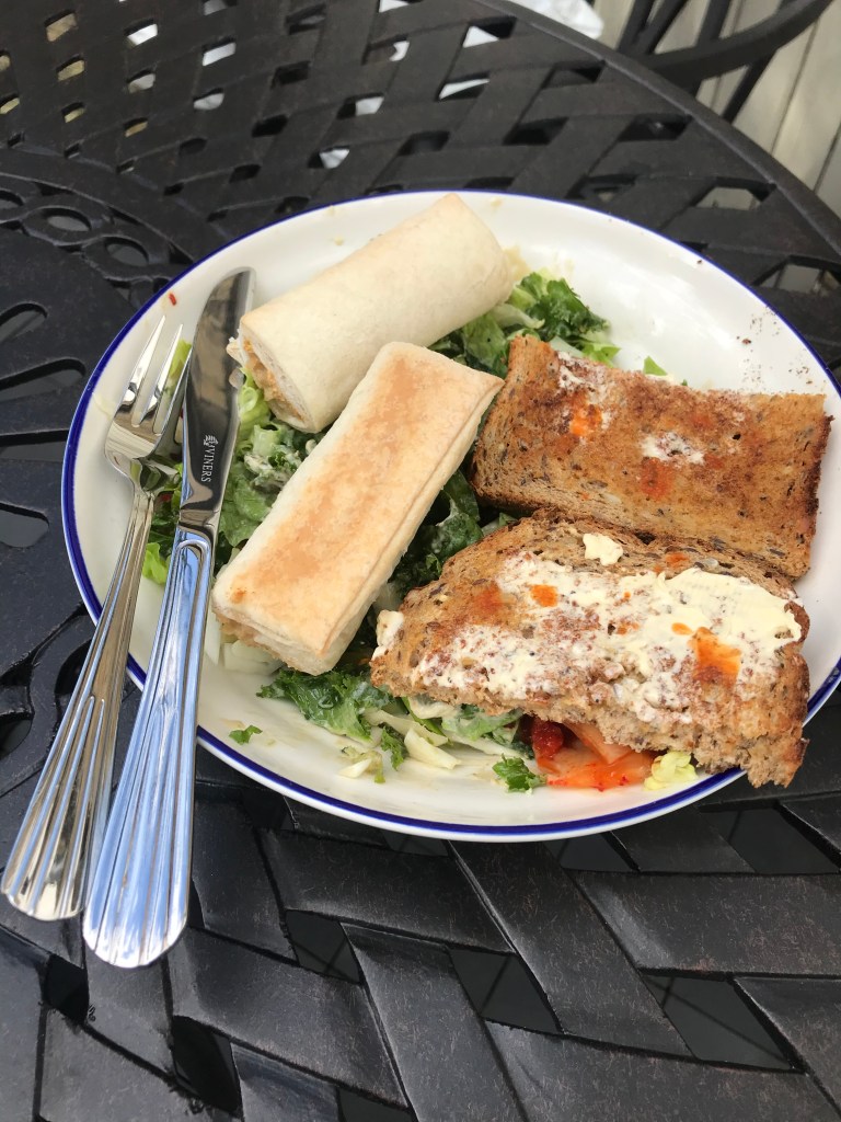 Leila started to feel a bit more awake so began working more productively, before breaking to make them both salads for lunch (with 2 sausage rolls and Tabasco bread added for Alex). Alex ate lunch outside whilst on his weekly Forum call with the MPAID class where his Brazilian friend Bea cooked dessert on camera and Berto and Christian taught the class Reggeaton dance moves. He was laughing super loudly and Leila’s work colleague asked what was going in the background. The course supervisor promptly logged off in the middle of the dancing.