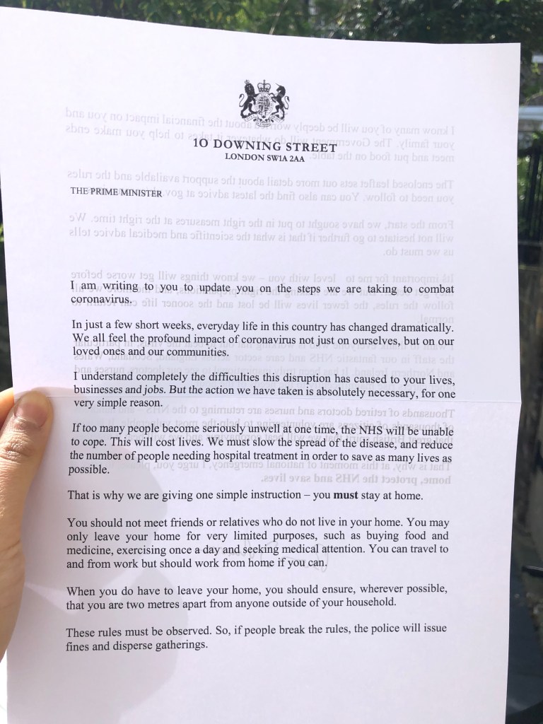 We both woke up tired having not slept well because our brain’s were active. Leila was up at night thinking about direct transfers to people as a way to help with Coronavirus. Alex was thinking about this Coronavirus policy memo. It really is consuming our minds albeit not in a personal stress way. Alex woke up first and showered, playing his sci fi lecture really loudly which woke Leila up. She had already overslept by 10mins so it was acceptable. Leila began “working” (reading lots of articles) and chatted to Freddie on Zoom who had just shaved his head. Alex listened to his lecture and then went out to Lidl whilst reading The Astronaut, a tale of Russian space exploration. He returned with everything on the shopping last apart from Oatly and avoided everyone in the store (quite dramatically). We then sat outside and read the letter delivered from the British government advising everyone to stay at home. It felt very official and real.