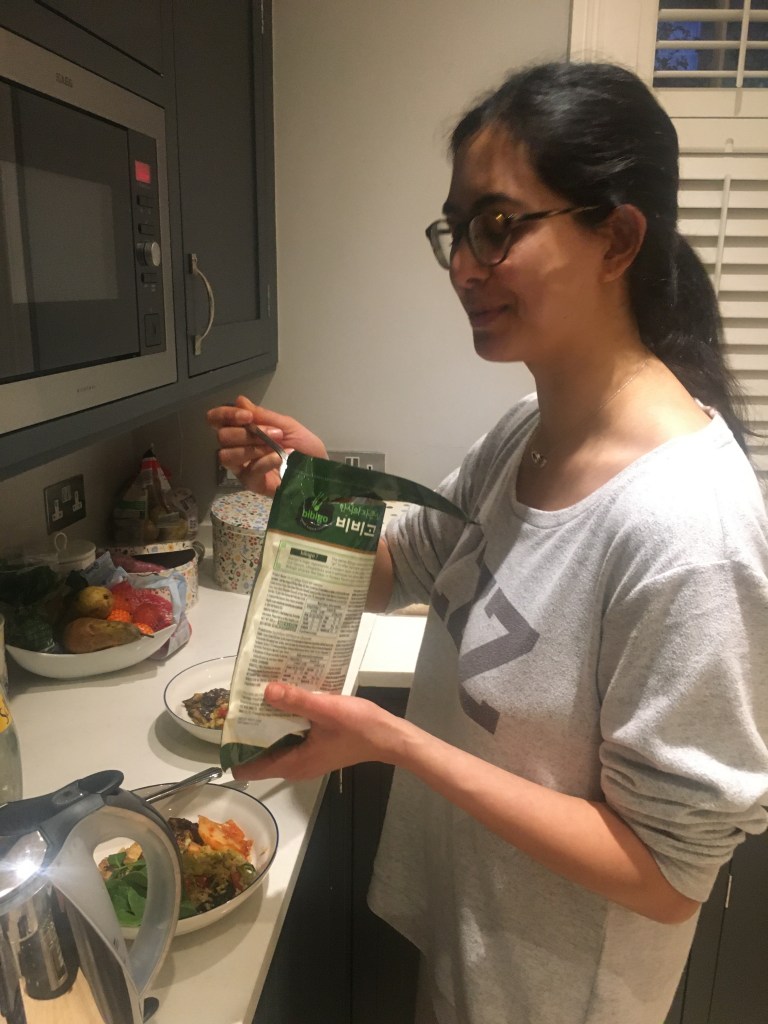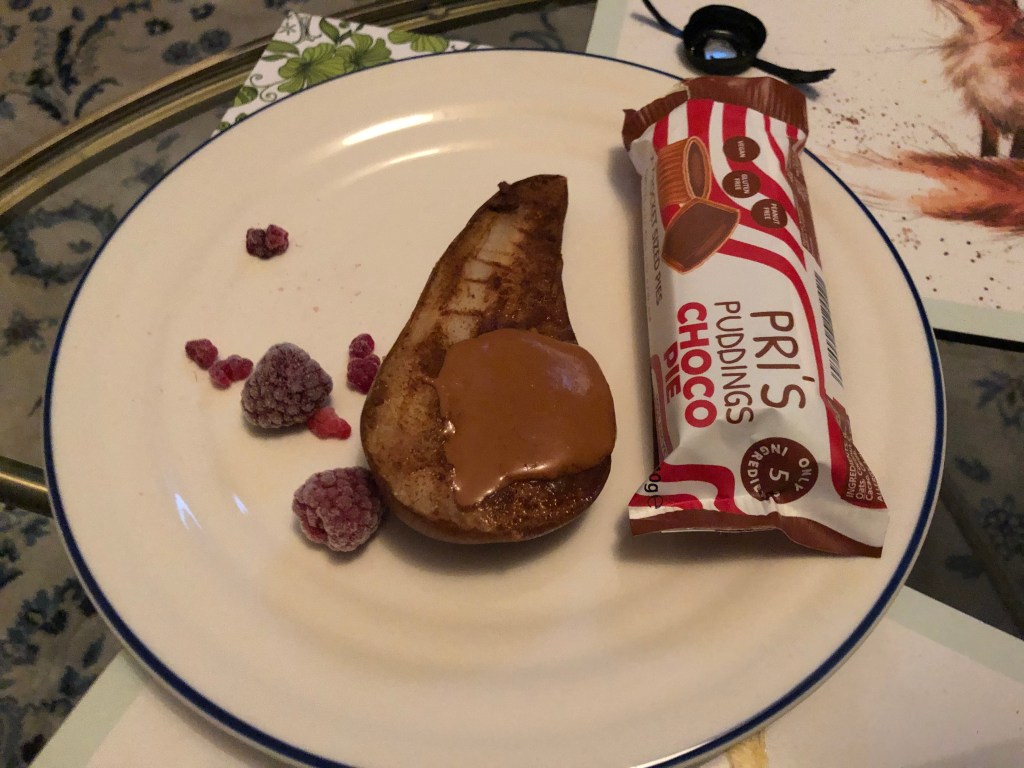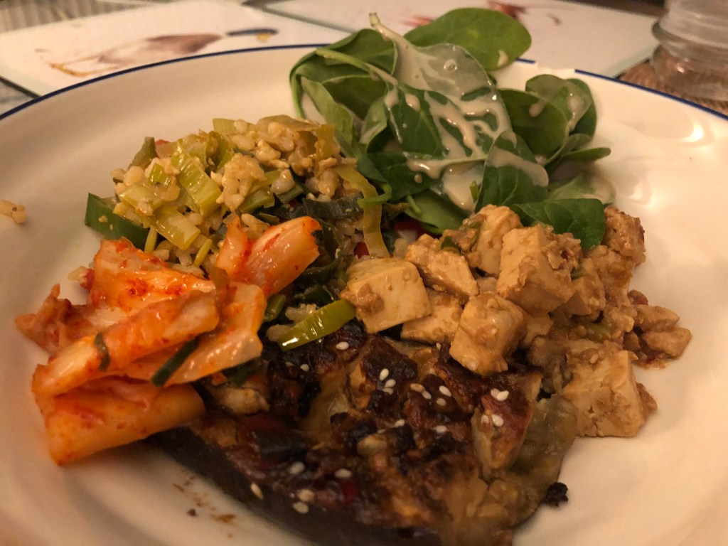 Alex had his macro lecture and some micro work (and lecture) in the living room whilst Leila continued working downstairs. She had a kick-off call for her new project with Helen and did 20mins of stretching as her break. She also marinaded the tofu and chopped some veg whilst on a call. We both finished work at around 7.30pm and Leila made the miso-ginger tofu, egg fried vegetable rice (the brown rice was significantly improved vs her first attempt) and miso glazed aubergine. We ate in pyjamas and whilst watching Sherlock, episode 2, which Alex’s aunt appears in. We paused to make a baked pear with ginger and cinnamon topped with peanut butter for dessert, and to grab a glass of the Lidl wine which was impressive for £6. Leila’s attention was fading 2/3 into the programme so decided to call it a night and head to bed before 10pm. We then started talking about Cambridge because Anish sent us old photos (apparently we hung out a few times) before falling asleep.