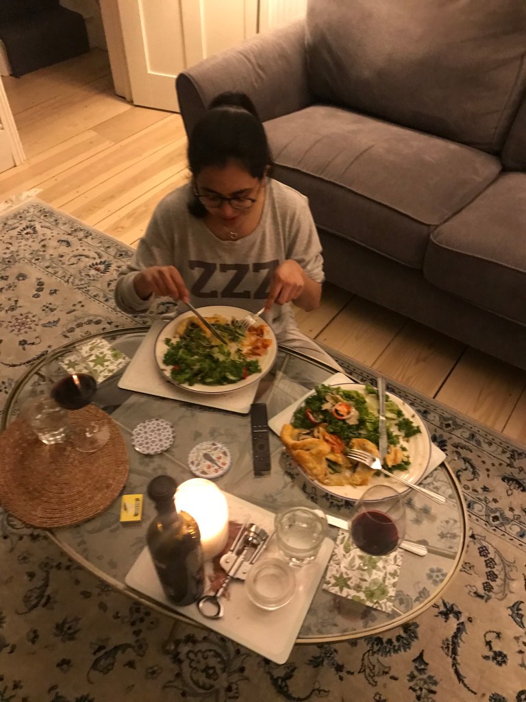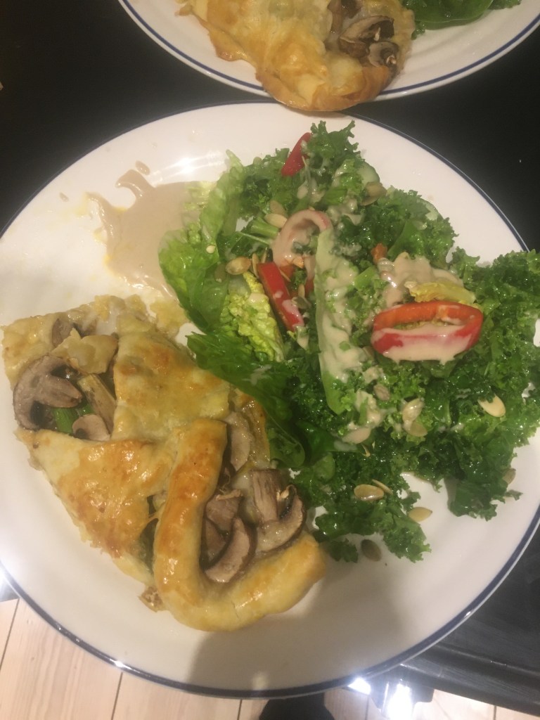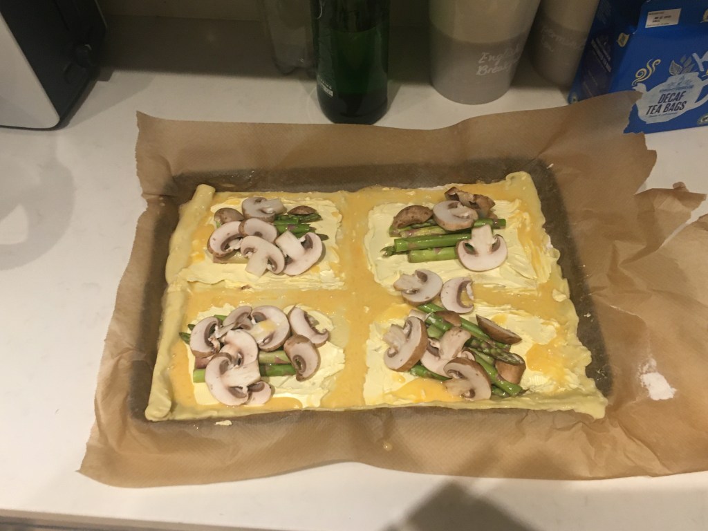 The walk was really nice, and she listened to her audiobook most of the way, without it being particularly eventful or being told off by the police. When she got back, the internet was working again and she dived into work until the evening. Alex had back to back lectures from 1.45pm and he was pretty vacant throughout without being able to concentrate on any of the questions. He thinks he’s had enough of lectures for the week. He was super dead when he came downstairs so he read his book to re-charge. Leila seemed stressed by work so Alex made asparagus and mushroom pastries and salad in a bid to separate dinner from work stress.