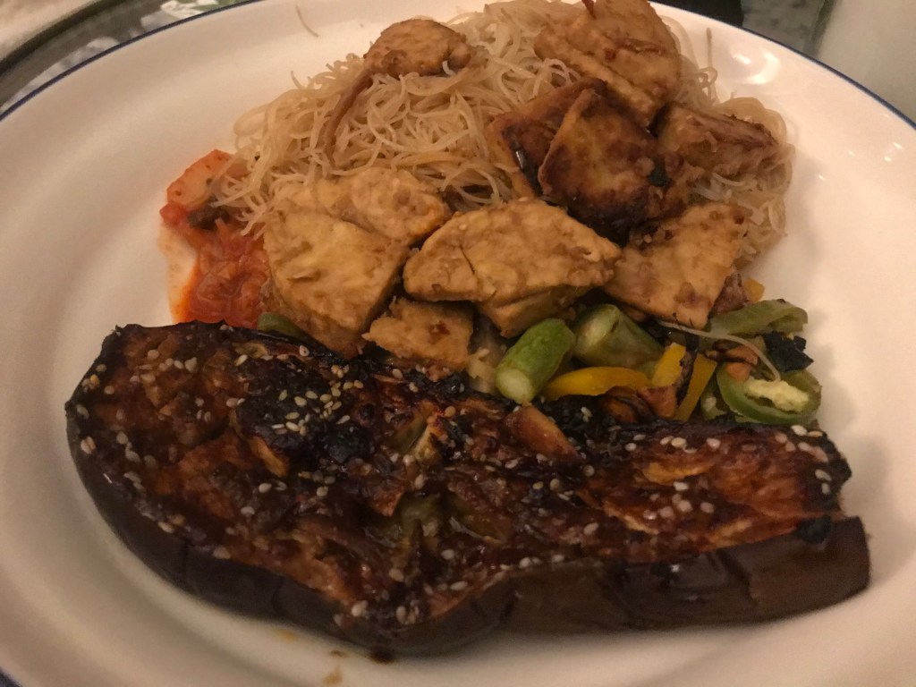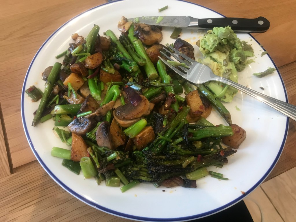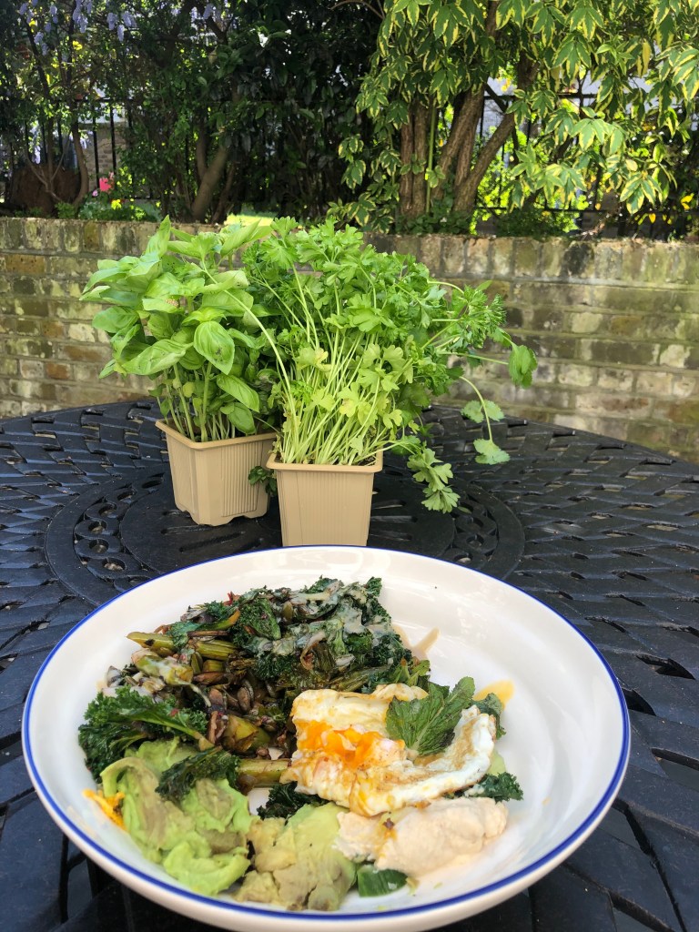 Leila had a nice quiet morning of work and a 10 min breakfast on the bench in the sun. She waited for Alex to wake up before making coffee, using the last of the Press beans. She then worked all morning. Alex spent the morning flitting between his microeconomic problem set and doing research for his discussion at 5pm with a Togo professor of Epidemology. It was a extremely sunny morning and when we made coffee (Leila was hugging the Oatly below), we sat outside in the sun and it was super nice. Alex had a really enjoyable break reading ‘Nine Lives’ by Ursula Le Guin which was an awesome sci-fi short story about clones. he read in the sun and it was super warm and lovely. For lunch he had a large plate of veggies (including coriander stems) and it was super good. They went out to try to start planting but got side-tracked by a socially distant tour of the communal garden given by Kay, our neighbour. She is cute but loves to talk. We saw the asparagus coming up as well as the purple broccoli, wild garlic and Swiss chard which are ready to eat. Leila then made lunch after her team call which was similar to Alex’s but plus an egg.