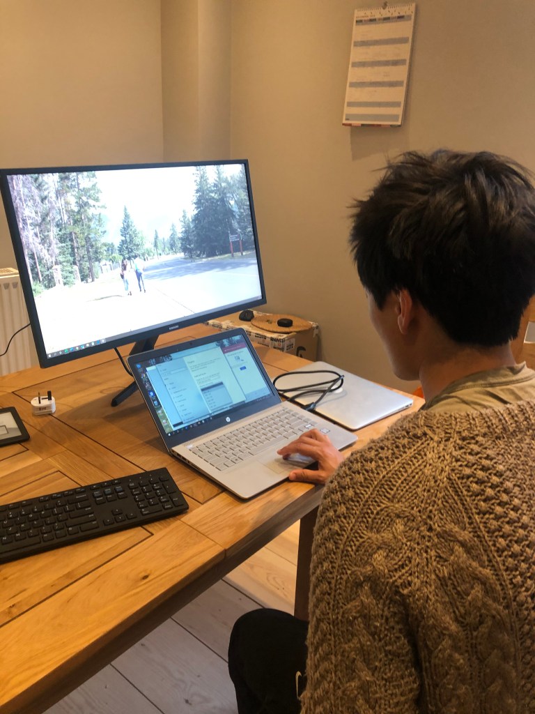 Leila checked on Alex again later on and brought him crackers and cheese. He seemed to be a bit better and ploughed on through lectures, although he was less vocal than usual especially in Sci-fi. He came downstairs for his last few lectures of the day. Leila finished work around 7pm and then started setting up her screen. Alex helped her after finishing lectures which sped up the process massively as Leila is not good at building. The screen was huge and they moved it around a few times because they want to see each other across the desk and the screen takes up a huge amount of space. They decided on an easy dinner of roasted vegetables – Alex marinaded the potatoes, carrots, parsnips whilst Leila did broccoli and onions. It then sat in the oven whilst Alex chatted to Chris about life and the Togo project, whilst Leila joined a 1 hour call on the Ismaili work she was doing.