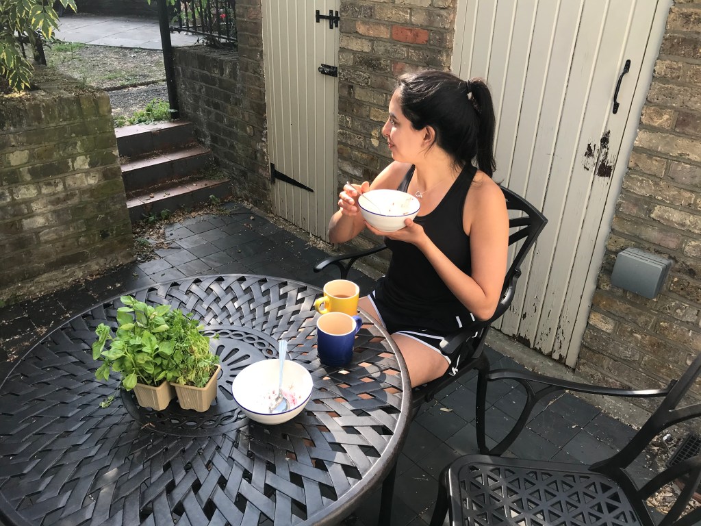 Alex spent the morning doing some metrics and then made lunch of vegetables, eggs and vegan cheese (which he regrets adding) but it was still nice. He then started reading on the bench. Leila decided to go get some rhubarb from the communal garden to make a rhubarb crumble. On her way, Katy (one of the neighbours), she passed Katy who was sitting in the garden sketching. They hadn’t really spoken much before but she’s in the gardening crew so they know each other a little. She had a really nice conversation with her and Alex joined. Turns out they have a lot in common – Zanzibar, Ismailis and Joe Hazel being her nephew and also one of Alex and Leila’s former classmates at Cambridge who then worked at Goldman and now lives in Cambridge MA. It was a nice conversation and it made Leila happy and for some reason made her feel better about the last 24 hours. She dialled into her 2pm call and started making the rhubarb crumble whilst she waited for Helen to open the line, using no recipe and weird ingredients. She then joined a 1hour call whilst Alex sat opposite researching West African countries’ response to COVID and their testing strategies – Ghana had done really well in testing but Nigeria was the opposite. After the call, the crumble was ready and they sat outside eating it in the sun together with some decaf tea. They then did a little more work and took a break to do yoga outside on AloMoves. Alex didn’t enjoy her motivational and sensual chat and kept laughing but she was a good teacher (recommended by Misha). After 30mins, a baby from next door spotted them and then immediately started crying on sight of the poor yoga techniques on show. They giggled and then stopped and went back to work for a bit before realising both of them were flagging and really tired. At 7pm, Alex called Ali and Leila took a long shower (for fun but also to give him space) and then he started cooking dinner which was a repeat of his marinaded chilli tofu from a few weeks ago. Leila finished off the cooking whilst he showered and then they ate outside with a candle and a beer.