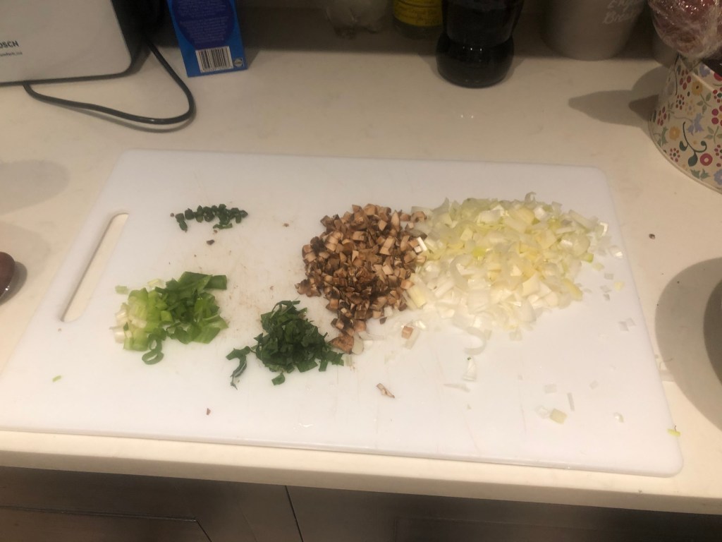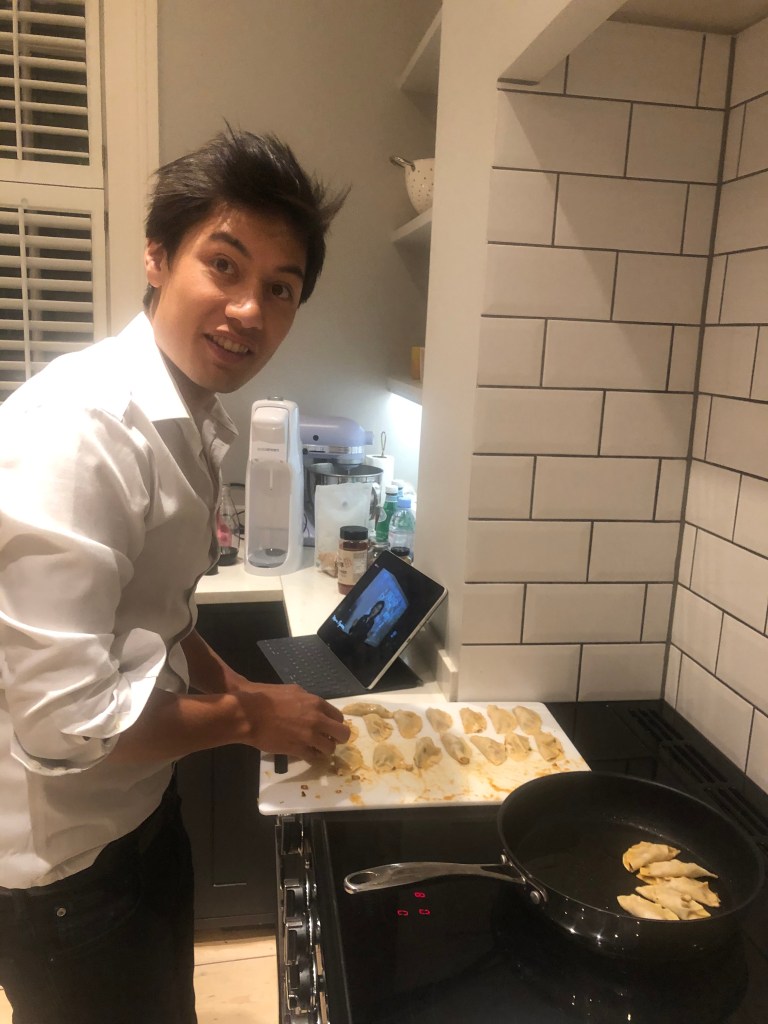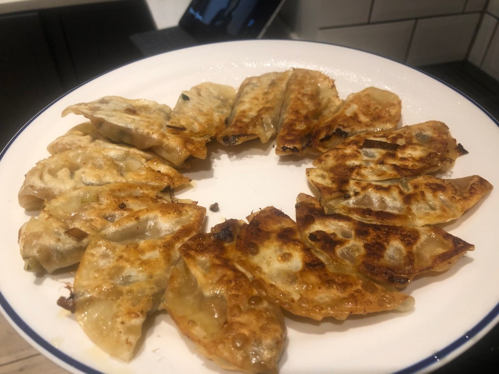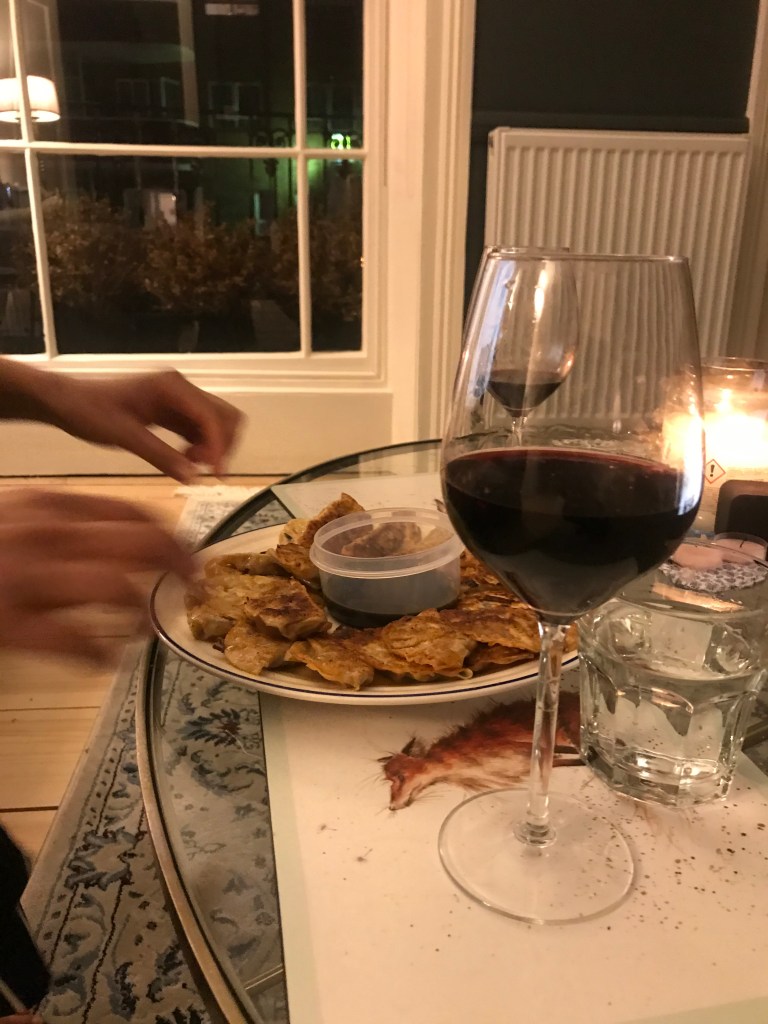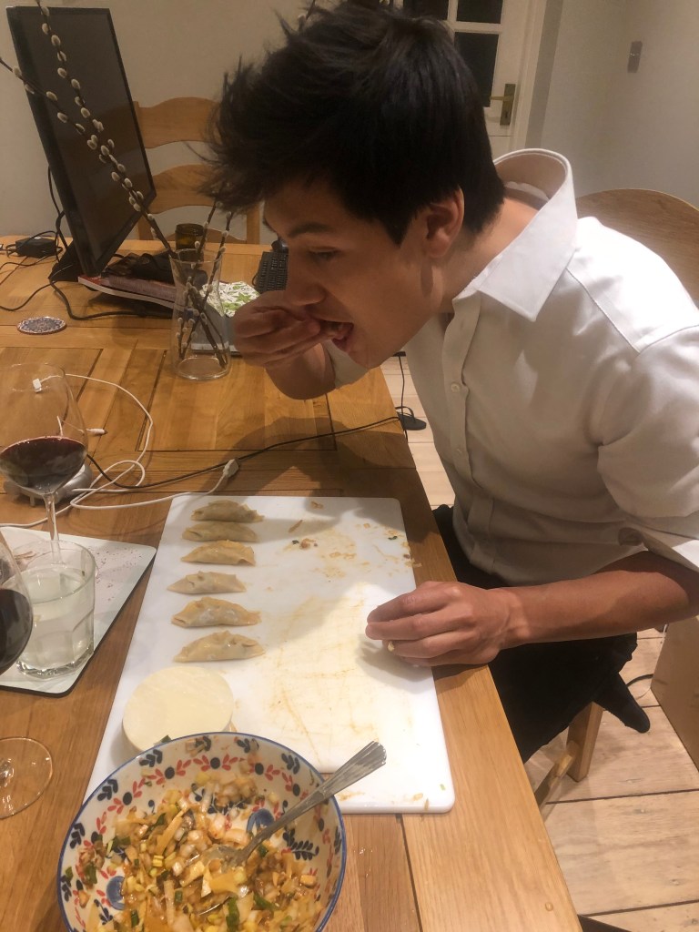 Leila carried on reading and Alex rejoined the call on Togo, Leila had read 150 pages of The Handmaid’s Tale, which was the subject of her book club early the next day. She was racing through and by the eve, she set herself the challenge of another 50 pages in 2 hours, she went way past that and nearly finished the book by the time the alarm went and Alex came upstairs to grab her. They dressed up in shirts and jumpsuit and had some cheese and crackers as they prepared for their date night task: making gyoza. They also listened to a live universe poetry night that mostly Alex enjoyed. The gyoza was super successful though and they followed the video on the shops website, it was a dude dancing and then being super casual about making gyoza, he’d often pause to point out that he’d forgotten to take the label off his plate, etc. They didn’t have the ingredients in the video which was mostly meat, instead they had wild garlic from the communal garden and lots of other veg chopped up mini. They gyoza turned out really well (Despite difficulty creating the required folds) and they had a glass of wine and ate them together upstairs in the sitting room while listening to music. It was an excellent date night and they were really happy eating gyoza and listening to music, Leila kept repeating how impressed she was with the gyoza making ability.