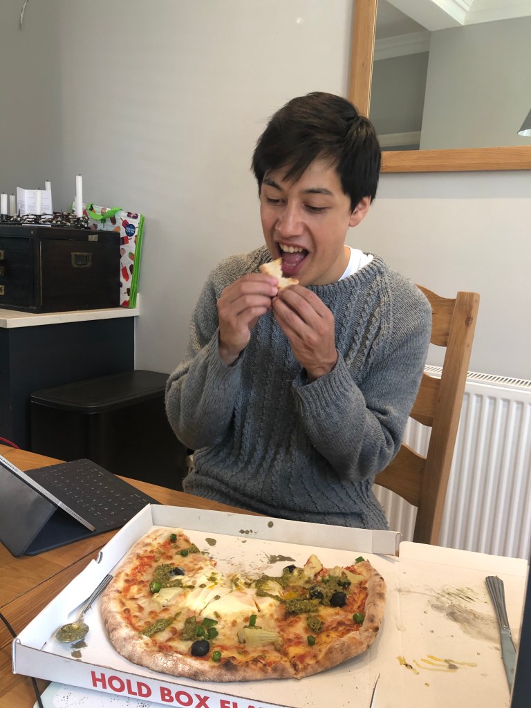 After the break in the sun (which was really nice), L got back to work and someone had used the ongoing feedback tool to tell Leila that she was amazing and loved how she’s engaged in the data process redesign. Thoroughly deserved as she’s been working really hard on it, and engaged with new people all over the company (really hard compared to everyone else at GS). Alex went shopping to M&S (he struggled putting on gloves because he has MASSIVE HANDS). There were massive queues everywhere so it took him ages to gather the shopping list, as a treat on the way home (and to celebrate his first day out in 9 days) he bought himself a pizza which was tepid and ok (not as nice as the ones they made themselves) – Leila only liked the egg bit.
