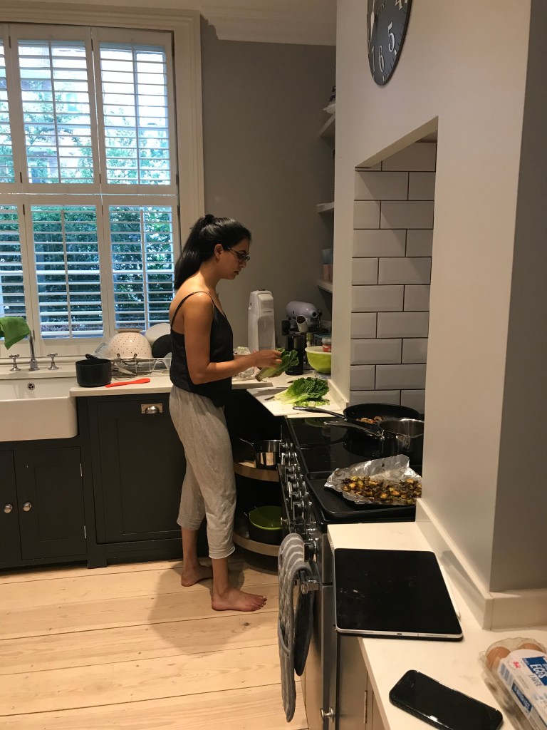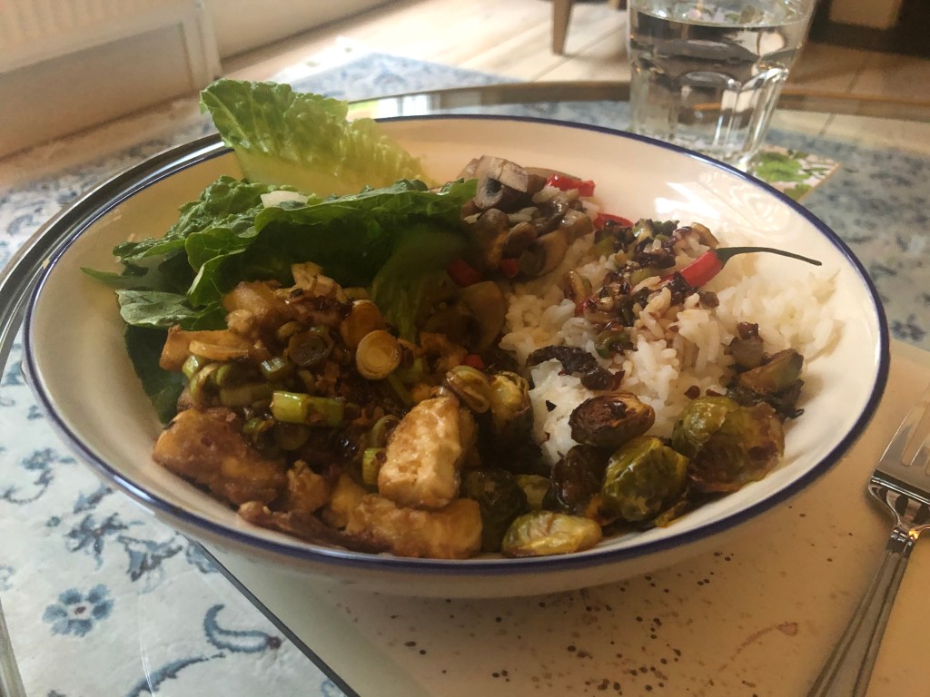 After lunch, A was super focused but took a break to watch Rick and Morty – 2 new episodes he hadnt seen before, but weren’t that good. L finished work and then went out to read The Three Body Problem in the garden, but found Katy and Kay there who had just watered some of the plants. She offered to water the remaining plants with Kay and used the outdoor tap for the first time which resulted in water all over the patio and her. They chatted about Iraq for a while (one of the neighbours is from there) and then Kay gave her a little Wallflower plant she had been growing in an Oatly carton. It was a really nice 30min way to relax after work. A was still working indoors, and it was the one day he didnt have a chat with friends or anything to break up his afternoon. L tuned into The Infatuation’s quiz night. She was really bad and hadnt seen a single one of the 6 movies they asked questions about in the first round. A was much better. We both had a Muswell Hillbilly Beer together and then L started making dinner – baked tofu, chilli brussels, mushrooms, rice and a soy ginger chilli glaze.
