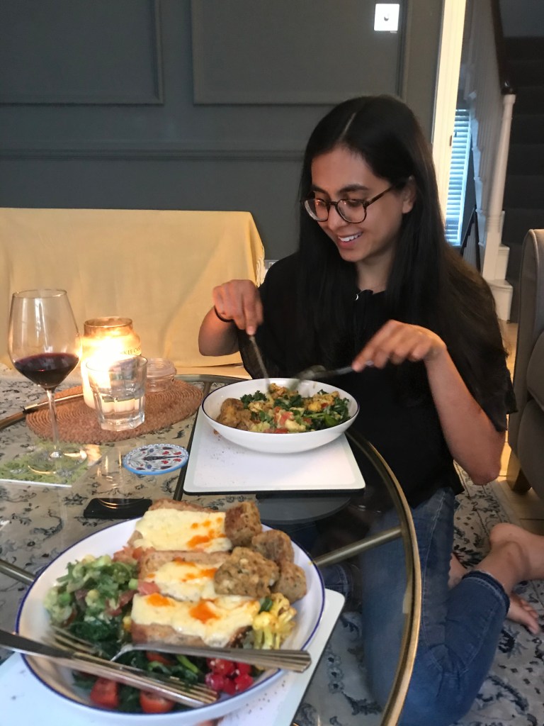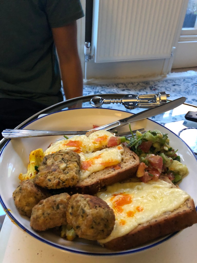 Meanwhile, L was in hyper productive mode and worked continuously breaking only for 30mins during which time she cleaned the kitchen, and then again for 15mins later to finish hoovering. She had a nice call with Freddie who introduced a new project to her, which they’d be working on together. She finished just before 7pm, showered quickly and went out for a walk. She planned to listen to Spanish podcasts but was quite mentally overwhelmed and needed chill after work so she listened to music instead and called her grandma. She picked up more cleaning supplies and headed back home to cook dinner, which was a super easy tumeric roasted cauli, guacamole and falafels. She also made cheese on toast for A to supplement. Whilst it was cooking, she sat outside with a glass of red wine and watched Cable Girls at which point A returned home.