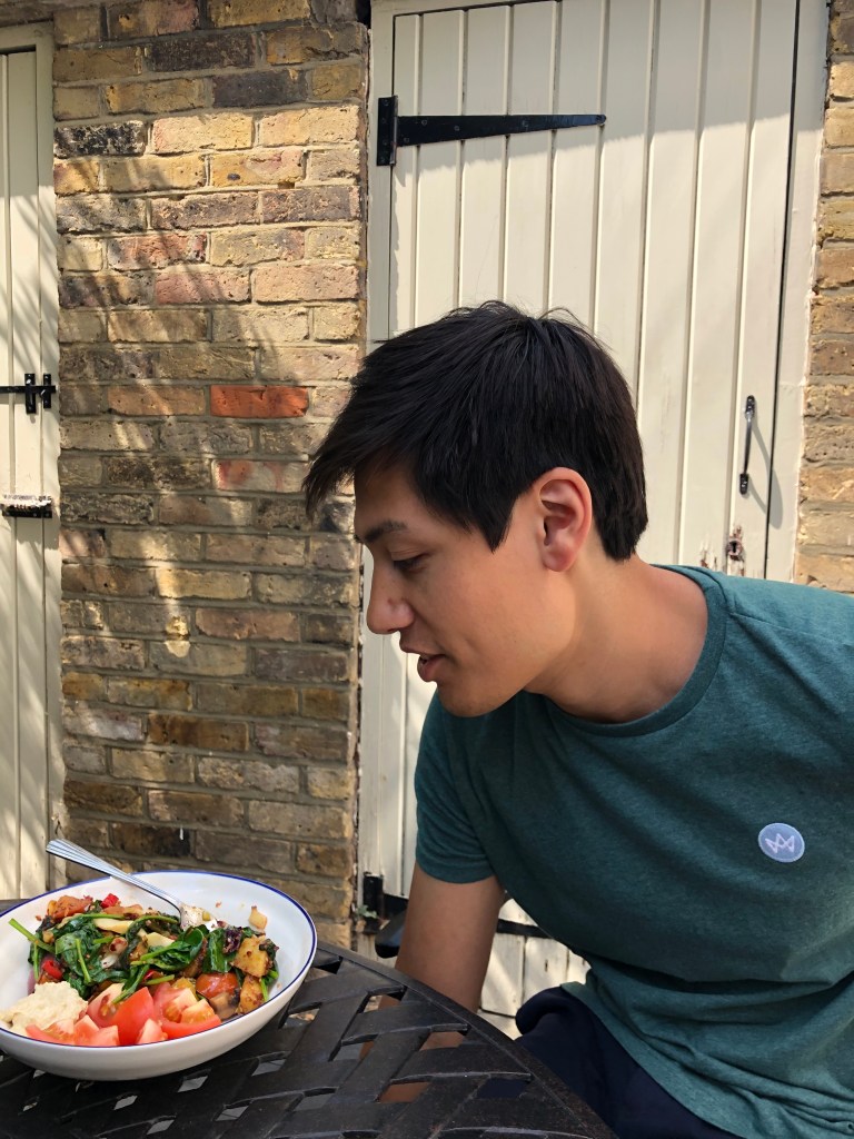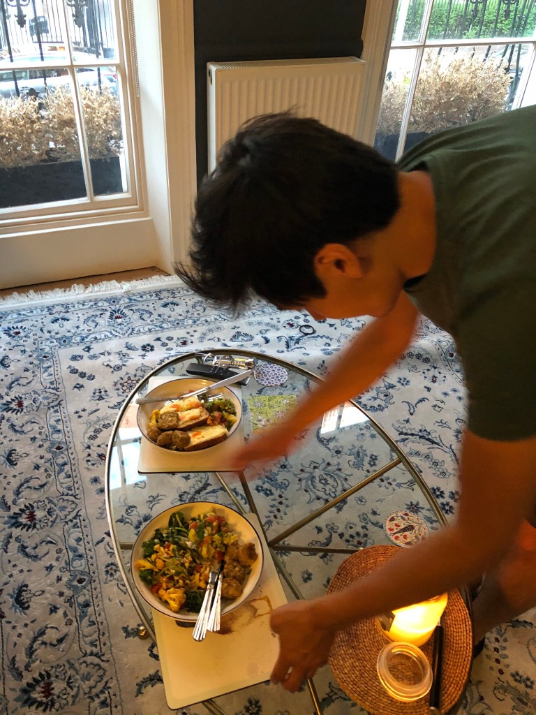 L didn’t sleep well again, so A headed downstairs to her (overnight moved to) bed early morning. L got up quickly and headed downstairs for work, while A took a bit longer to get up and down, and L was already in place with her coffee, breaking only to do the blog They both worked through the morning with L and A in their respective zones, L dragged A out of his, as she made him a lovely lunch. They ate lunch together in the sun and L pointed out a grey hair and picked it off A’s head. L then went on to join a bunch of calls, and A headed out to meet Sam near the flat.