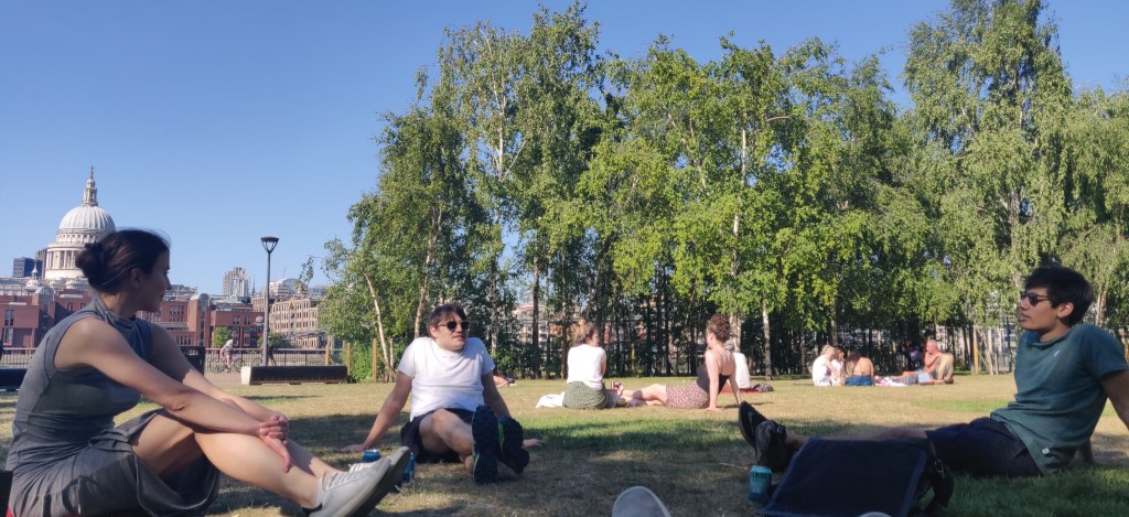 He listened to episodes of the Daily on the way over, he enjoyed listening about QAnon as well as the tensions between active vs. peaceful protests. He had a nice chill with Sam in the sun and they chatted about the NHS and working in medicine at this time, then Olesya and Joe joined, and they carried on chatting way past when they expected. A jumped away to chat to Alice for an hour, and came back and Joe was still there and they kept going to about 8pm (after meeting up at 3).