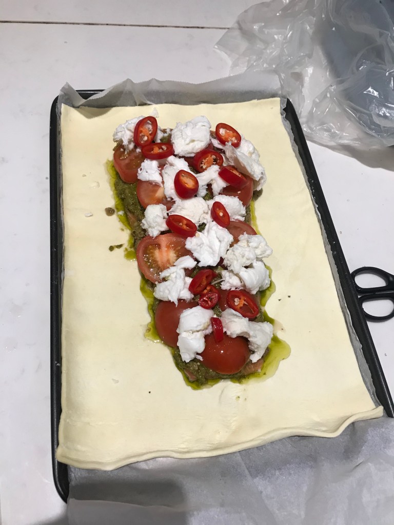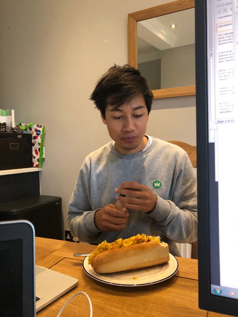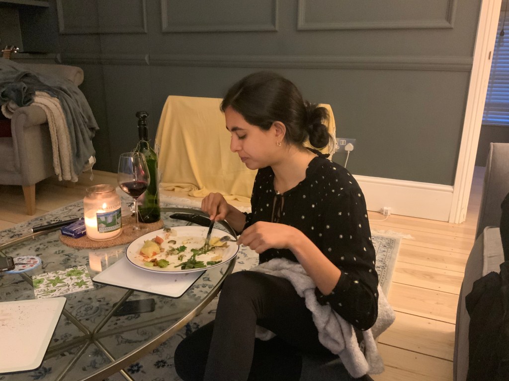 Leila doesn’t recall anything exciting happening in the morning other than work. Alex made a bit potato-filled baguette for lunch using the Ethiopian curry leftovers. He then headed upstairs to join the Harvard remotee catch-up he had set up on Zoom which was really nice, especially as it was at a more friendly hour for his classmates in India. Leila worked through the afternoon until Liyana arrived on her way back from Sheffield at 6pm. She gave Liyana some cheese and crackers and tried to chat to her a bit, but was still trying to work at the same time and was a bit stressed. Alex tried to chat to Liyana too as he knew Leila was a bit overwhelmed with work at that moment. He was also simultaneously making the biggest Salmon en croute Leila had ever seen. Leila forgot she had told her friend Rumi they would go for a walk that evening, and even though she wanted a break after work, she decided seeing the dog and her friend might cheer her up. She left Alex and Liyana at home and headed to Barnsbury to meet Rumi and Mango (his dog) in the park. They walked to Highbury fields together which was really nice as Leila hadn’t seen him since December and had never been to Highbury fields. However, sadly Mango was a bit overexcited and less cuddly than Leila hoped. She learnt that Rumi’s team makes him stay on a Zoom call throughout the day at work which feels a bit invasive, and was glad her team doesn’t do that. Meanwhile, in Kings Cross, Liyana had left not long after Leila did and Alex logged on to chat to Diego who is living in his room in Harvard. They had a really nice chat and A had some beers. He had the dinner ready when L got back and they had a yummy dinner of Salmon En Croute with potatoes, leeks and broccoli.