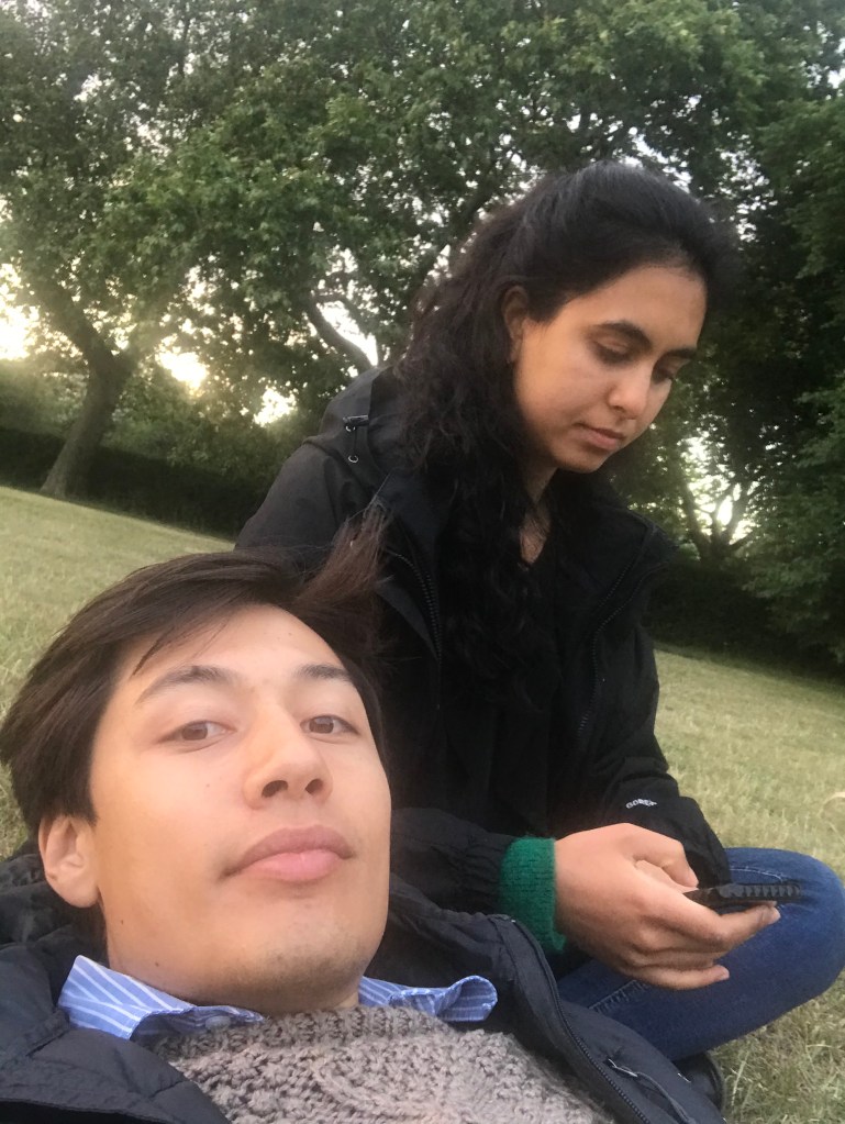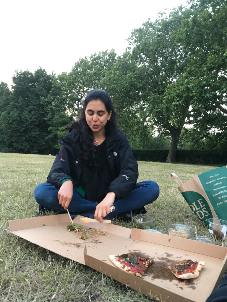 Leila woke up ahead of her alarm as usual and came downstairs to start work. She did quite a bit in the morning and chatted to Mony, Krystle and TDG about her diversity sessions during the day. Although it has been a bit of a frustrating few weeks, she’s happy that the work her team has done to organise diversity sessions has inspired others to do the same with their teams – she worked with Krystle to email a partner in IBD to suggest a similar structure, and she told TDG they should also set up a diversity council within CExp too. Alex came down a little later. He did some WB work and they had lunch together outside – A had pad thai and L had a tuna salad. A went for a run in the afternoon and ended up by Chapel Market where he picked up some oysters from a man who catches them daily. L worked all afternoon and had calls until 6pm. Then at around 7pm A opened some nice sparkling white wine from Lidl and they sat outside with the oysters. They chatted about whether they spend enough quality time together as L was feeling a bit down. They oysters were yummy and reminded them of New York, and A also put jazz on in the background. Then it started raining which put a dampener on A’s plans to go to a pub for pizza (which was actually Gordon Ramsay’s restaurant) but L convinced them to go anyways as she hadn’t left the house. They went to Wholefoods to pick up weird snacks for L (she took ages to pick) and then got the vegan pizza with aubergine and pesto and sat in Regents Park to eat. The pizza was yummy and it was nice, though a bit grey. Then they headed back and Leila ate half a cookie which tipped her over the edge despite Alex telling her not to. They watched United v Spurs and L was getting super annoyed by Mourinho’s moods and much preferred watching football with no fans when there were fake fan noises. Then her stomach was hurting post dinner and cookie so she squatted for a bit. Alex started looking for potential staycation locations and they headed to bed, and chatted for a bit before going to bed.
