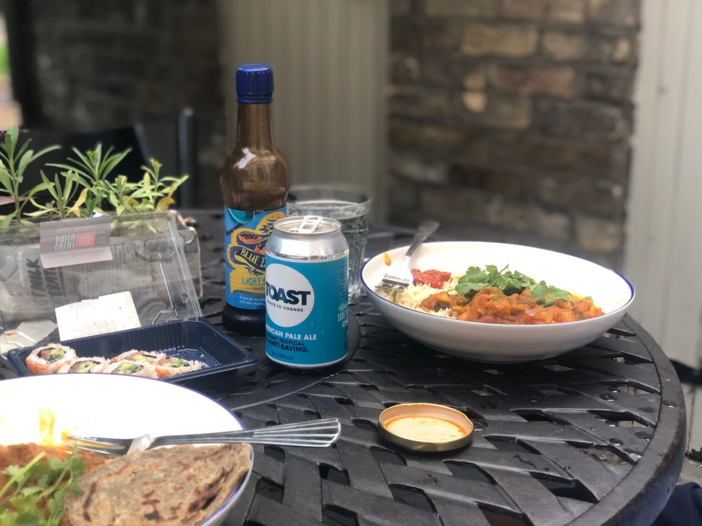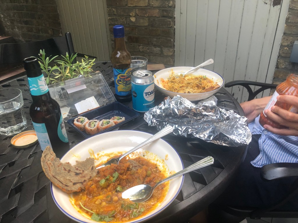 They kept working until late in the afternoon and A taught L how to use Index match and SumifS as she realised all the Excel stuff she knows how to do is really hacky. A also joined a call with some Harvard people to discuss LOA and realized that he could come back in January if he wanted to but that most people were not deferring the full year. They headed outside while L dialled into her final call. A claimed that he wanted a beer but he was on a non-alcohol day. After L’s final call, (and A had finished some of his work on the ADB project), they decided to walk instead of cycle to Namaste Holborn where L had picked up some too-good-to-go Indian food that would otherwise have gone to waste. It was a slow journey and by this point their bags were pretty heavy and full (beans and other goodies) but they made it and the food looked great. They also picked up a couple of beers from a mini Waitrose they passed, alcoholic despite their initial look for non-al (they also picked up some reduced to clear sushi). They looked for a park but they were all closed or a bit rubbish, so they made it the whole way home. They opened up their boxes and reheated them in the microwave making an enjoyable quick dinner.