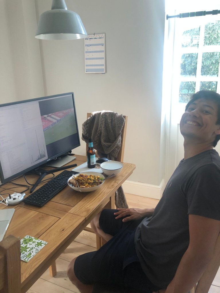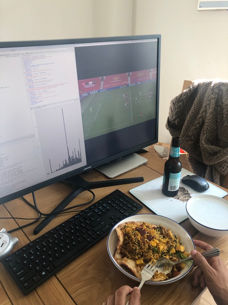 In the afternoon, they both kept working, with A trying to improve his ADB submission, while L trundled through the days work. L made crumble and a beautiful dinner whilst on the phone, and she found that her productivity actually improved whilst doing other things and listening in. She then headed off to see Rumi and Mira at Rumee’s place and was all prepped to do her first Boris Bike cycle by herself. She left A with food and watching the Man Utd match (it was already 1-0 at this point, thanks to Martial)