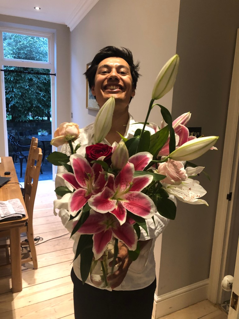 A had gone out to Coal Drops Yard and searched out a flower stall and selected some roses and lillies to bring back for L. They celebrated with a couple of glasses of chilled white wine, some sad Ludovico in the background and dressing up in their fancy clothes. A had also stopped by Hoppers and confirmed that they could eat there if they ordered initially online to click and collect. They had a search through the menu and decided on the veggie tasting menu for 2, and spent 30-40 minutes going through the very first photos of their lockdown and remembering all the things that they’ve done – they’ve done a lot. Highlights of the photos were: We’ve eaten like kings and queens, how quickly we’ve got into our routine (coffee and dinner on the table) and how 100 days later, we’re still doing the same things.