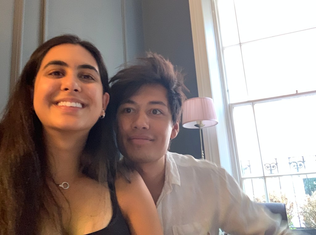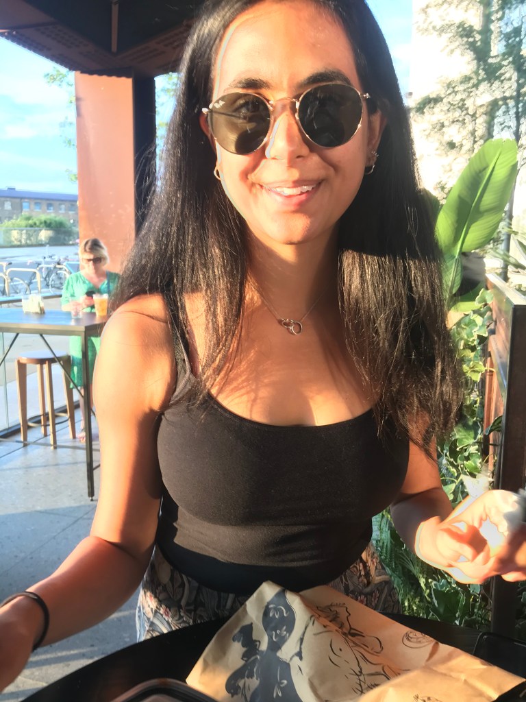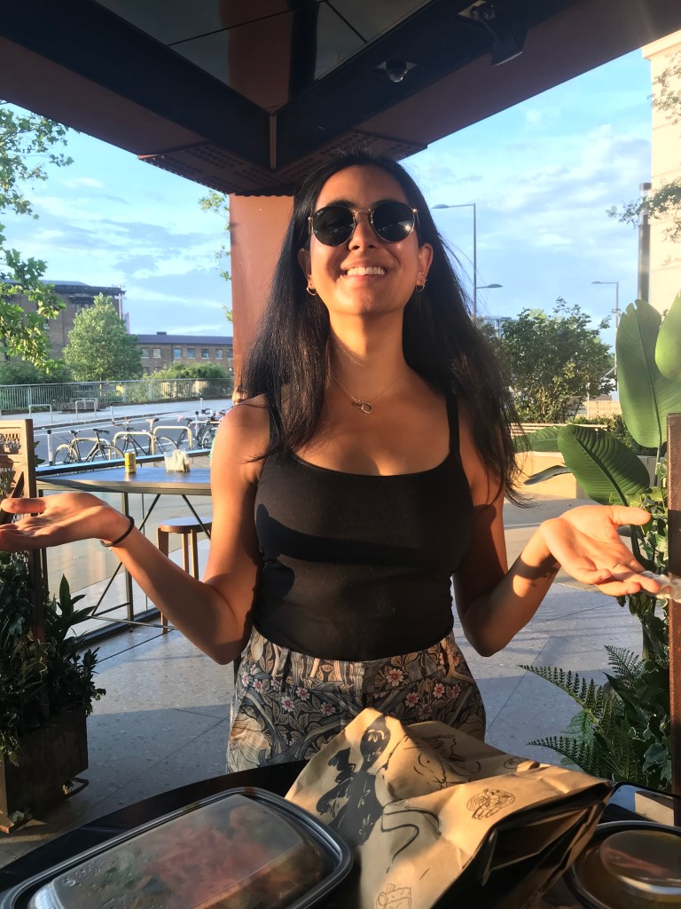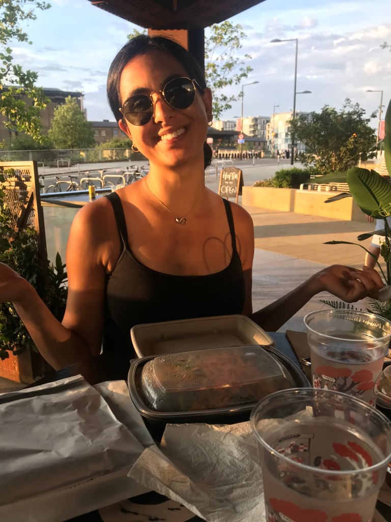 They headed out to hoppers and A waited for a table while L looked into CDY, they eventually got one and had their first restaurant experience in a while (despite it technically being take-away). They brought their own cutlery and L was thankful but it had the same vibe as eating out – they even had wooden plates and got tap water. The sun was setting so L looked super golden. They ate a mushroom and jackfruit kottu (stir fry with roti), string hoppers (basically just noodles), plain roti, aubergine kari, dhal, and some pickles. They chatted about their favourite days over the 100 but L couldn’t really pinpoint just one.
