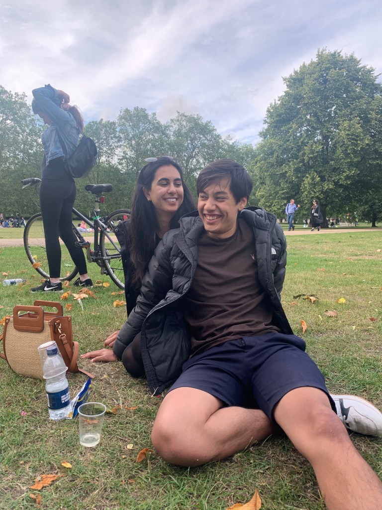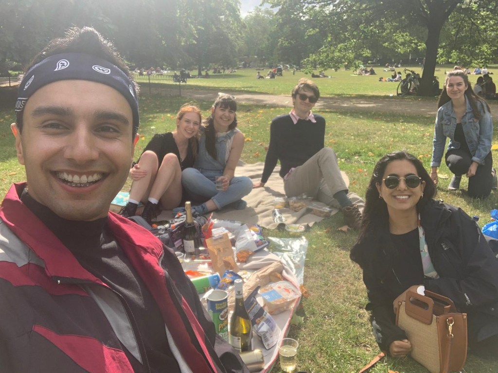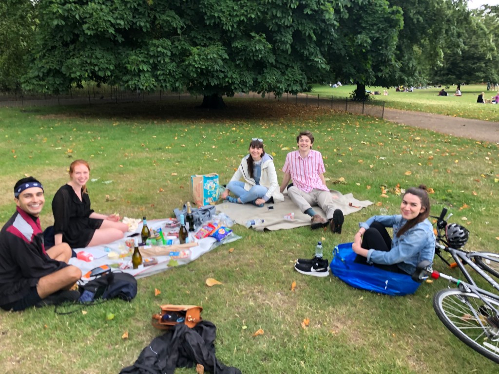 In the afternoon L and A cycled to St James Park for Abi’s birthday picnic. L led the way for the first time on bikes and did not enjoy it that much, and took them on all the main roads. When they ran into the BLM protests in Trafalgar Sq, A took over and made them cycle around on the pavement with about 20 police cars watching (L felt weird breaking the rules like that but was glad A was directing). L headed to join Abi and Rosie whilst A listened to Unfiltered in the park separately – Mayra gave a super open telling of her childhood, the people important to her and her fiancée. Then Emily, Joe and Anish joined and they had some strawberries, falafels, and prosecco. L had missed them loads, despite not remembering that Emily lived on the same corridor as her which was super awkward and embarrassing for her. A joined after a bit, and had some glasses of wine and they listened to Joe talk about lawyering and it was a nice afternoon / evening. L wondered how people switch off from emotional work at night (e.g. criminal barristers / probation officers) as she knows she finds it difficult, and is currently struggling to read a fiction book about slavery before bed. A joined in the conversation really naturally and all L’s friends mentioned after that he seemed really nice and they looked happy.
