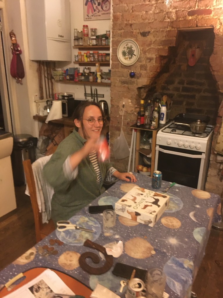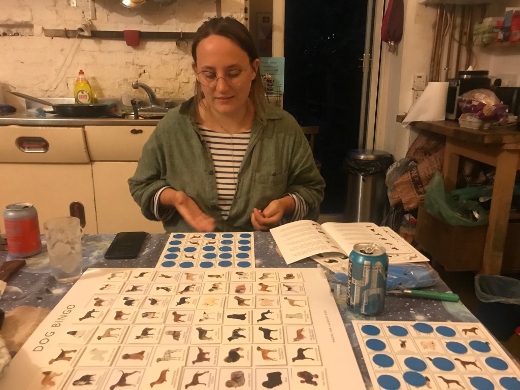 L’s friend Sinar came to visit at 7ish, they chatted and walked to CDY together, they had some deep chats and it was super nice to catch up. A cycled to Krook’s house in Hackney for beer and dumplings. He initially messed up by not realising that Boris Bikes did not extend that far, and so had to turn back and walk the last half-hour. It was a super nice catch up and then they played dog bingo and watched chelsea lose in the background. A was upset about the loss but enjoyed the bingo.