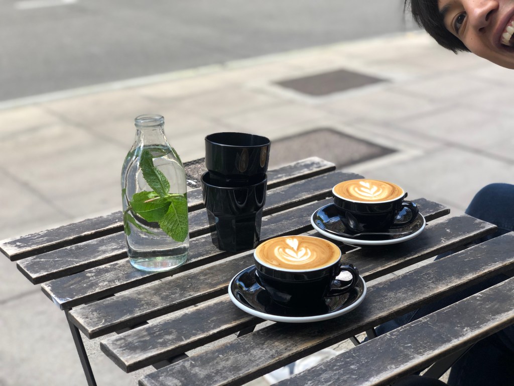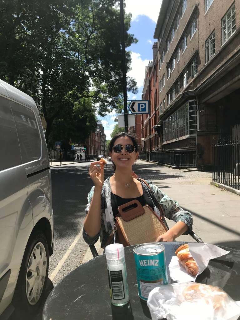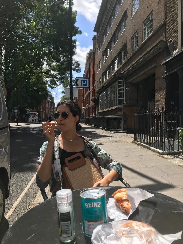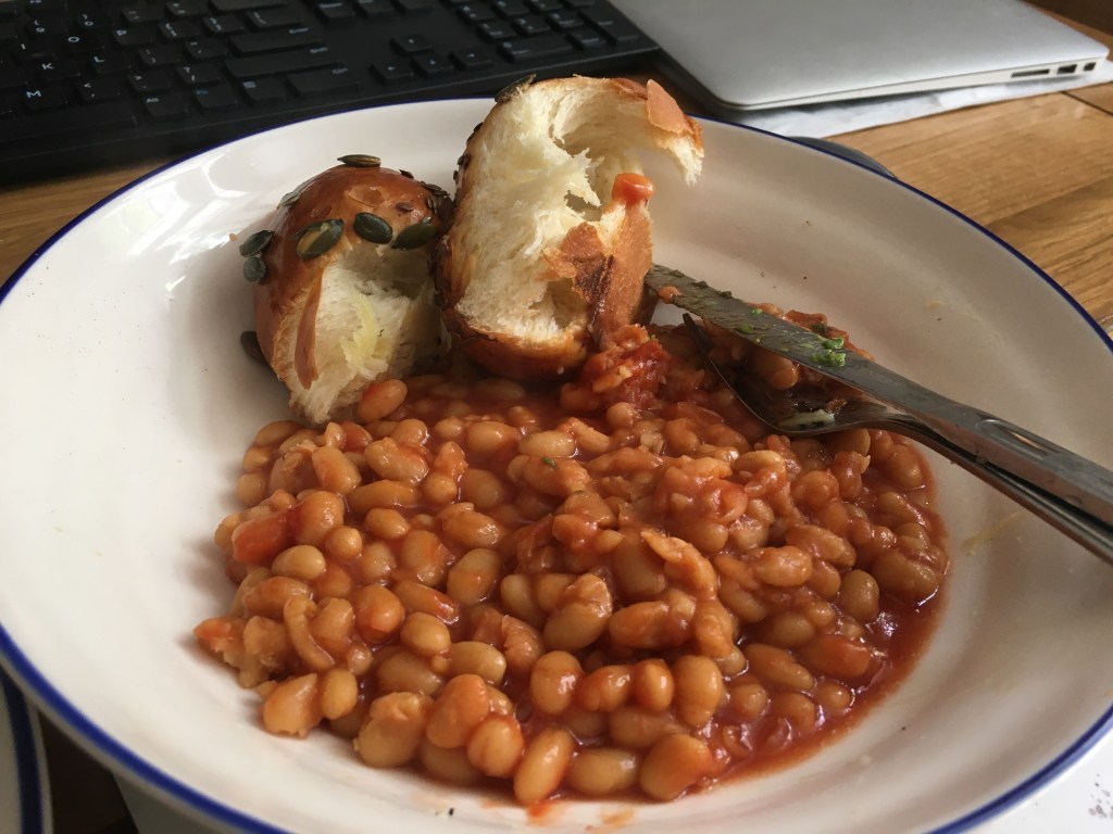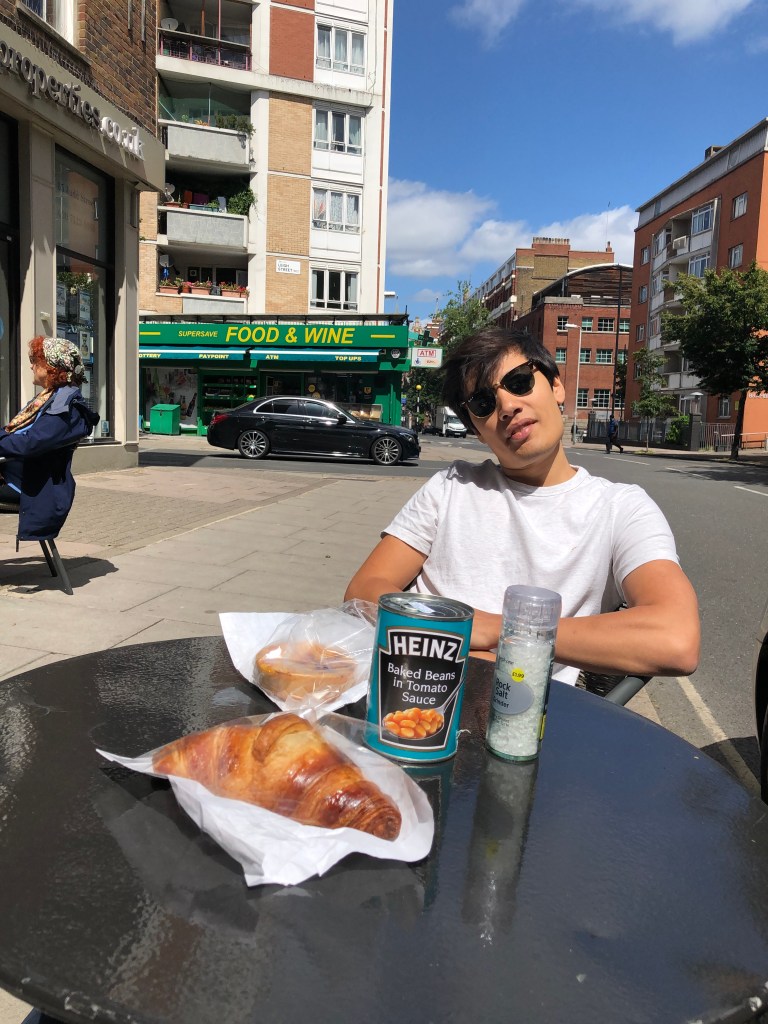 They had thought about heading to Angel to see Anish, but ended up having a lie in instead. A got up super early at 6am and spent a couple of hours trying to fix his laptop (it’d broken within a day) and then jumped back into bed with L at 8am. They dozed until 10 and decided to head southwards for a change for coffee. L felt like she wanted a walk in the morning so they went to Half Cup which had a few tables occupied (mostly inside – people are excited about being able to sit inside now) but not many considering how busy it usually is. They had a nice coffee and read an article in The Economist about Joe Biden. L suddenly craved a croissant and they went to the patisserie down the road run by a little old couple and she bought a croissant that was 10/10 and a little quiche for A. A went to the newsagents to buy baked beans and salt as he had big plans to make a full english inspired by Half Cup’s menu. L was sceptical as he had D&D later and she was sure he’d forget to eat, but was proved wrong.