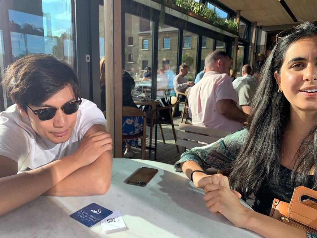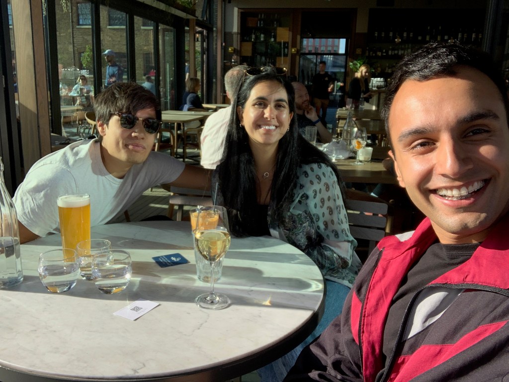 L then did some admin, emails and Croatia research before going on a walk to CDY to return something to Cos. She then came back to start her JFR call about secrets to success, which was nice but really long. Alex continued D&D upstairs and they snuck into a cemetery for 4 hours. L was texting Anish midway through the JFR call and they arranged for him to come over for a drink at 5.45pm. L logged off the call at 5.35pm because she was getting super tired by it, and Anish arrived 1 minute later! A finished his games and they headed to CDY for a drink and chose to go to The Lighterman to sit on the outdoor upstairs balcony (despite having brought a bottle of wine in a tote bag with them) The Lighterman was also super empty considering how busy it usually is. Anish saw lots of beautiful people (particularly the couple behind us) and seemed really happy. They told him they wanted to meet Daniel next time together and discussed race for quite a bit. They also discussed how they should go to all the restaurants on their lists now given they are all so empty. Anish had a Riesling, Leila a carrot & ginger juice and Alex a beer. It was quite windy (the plants were literally falling over) but sunny, so they moved inside after a bit.