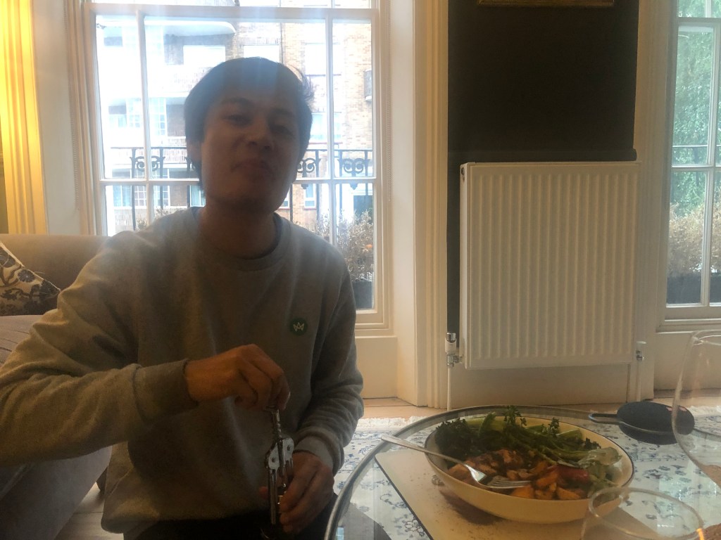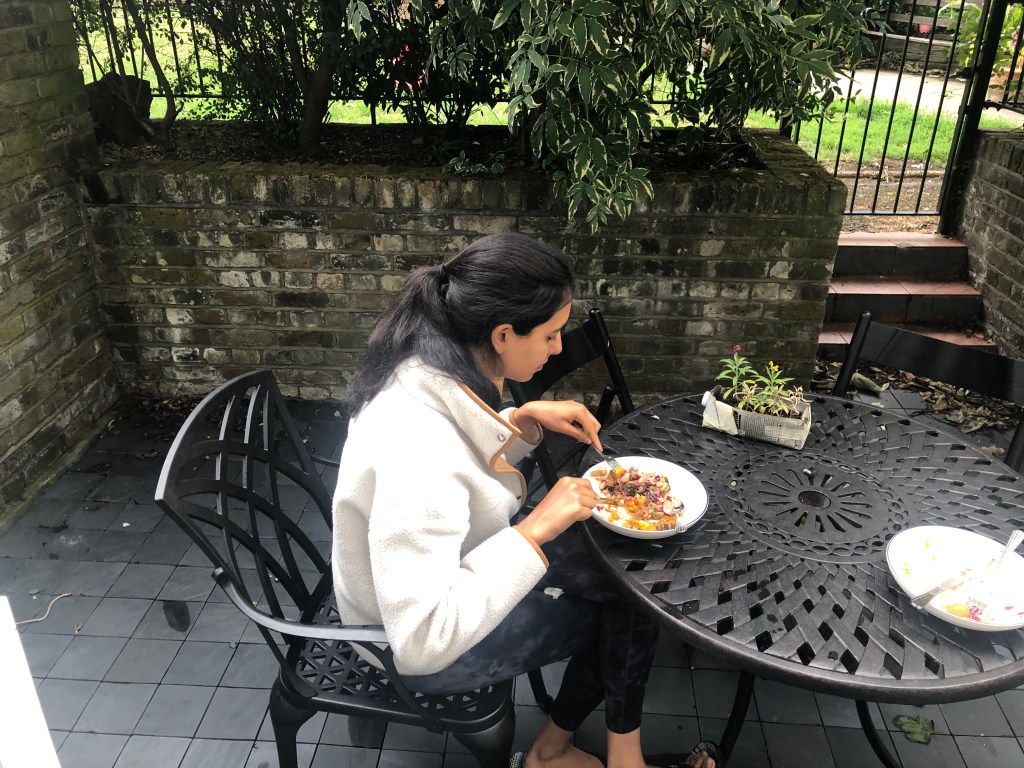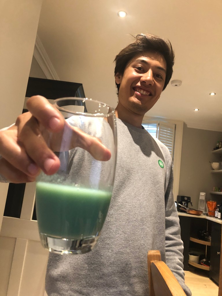 L slept much better in Kings Cross back with A but woke up really early anyways. A also got up quite early and they both started working. A was working on linking Myanmar datasets which is what he thought his job would be initially and feels much happier doing so. L made them both a lunch of sweet potato, spinach, leeks and cabbage and they ate it together outside. In the afternoon, A headed out to Waitrose to buy a nice bottle of wine for his godfather and came back with some genuine goodies (Belazu tahini, pumpkin seeds) and some not so genuine ones (a gross blue juice, see below). L took a break to talk to Ruki and went for a walk to CDY in the afternoon whilst chatting to her about how things were going at home and sleep.
