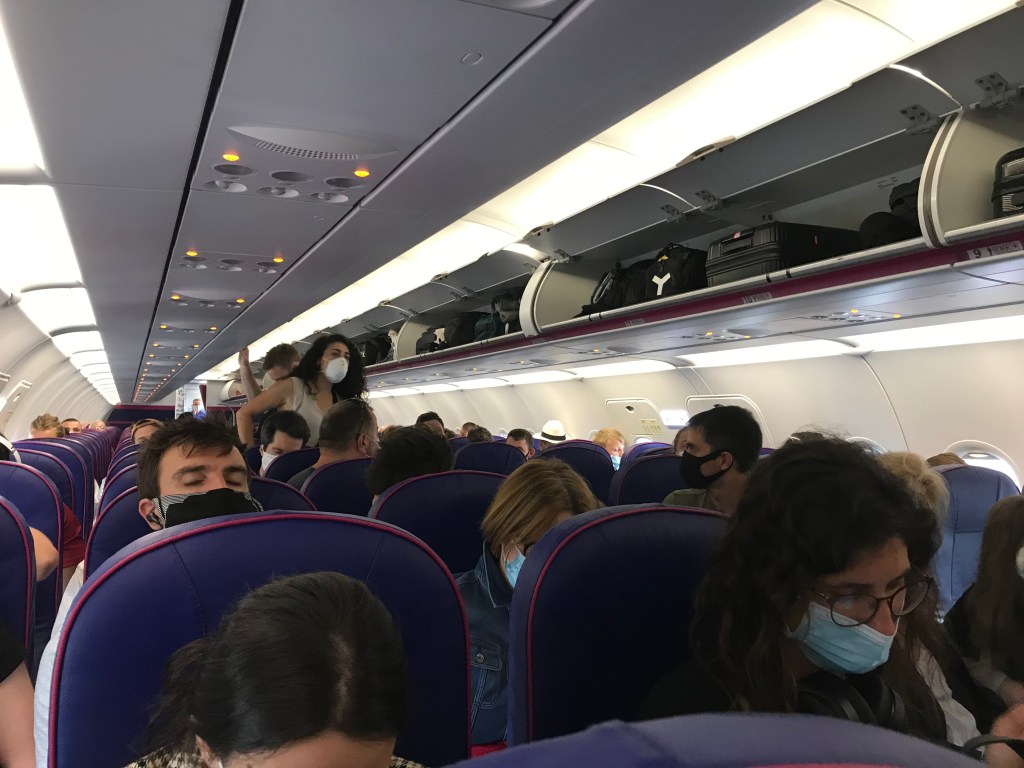 They boarded the flight which was actually running early (mainly because there are so few flights today) and they put their FFP3 masks on. L told A he couldn’t take it off the entire flight. Wizz Air did not put in place any social distancing on boarding or on the plane, it was fully packed and L and A both felt a bit weird. They listened to a podcast about mindfulness and then L read the NYT (which was free!) while A wrote a job application and then played a game.