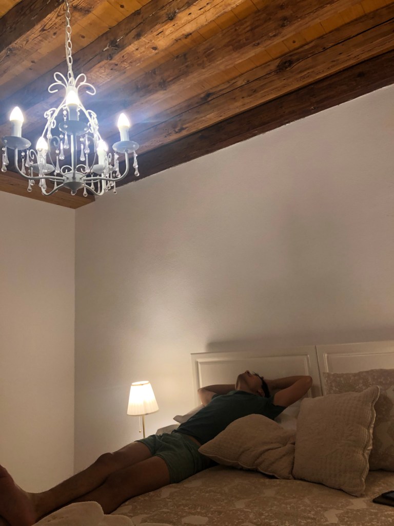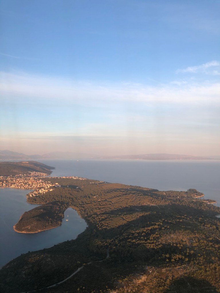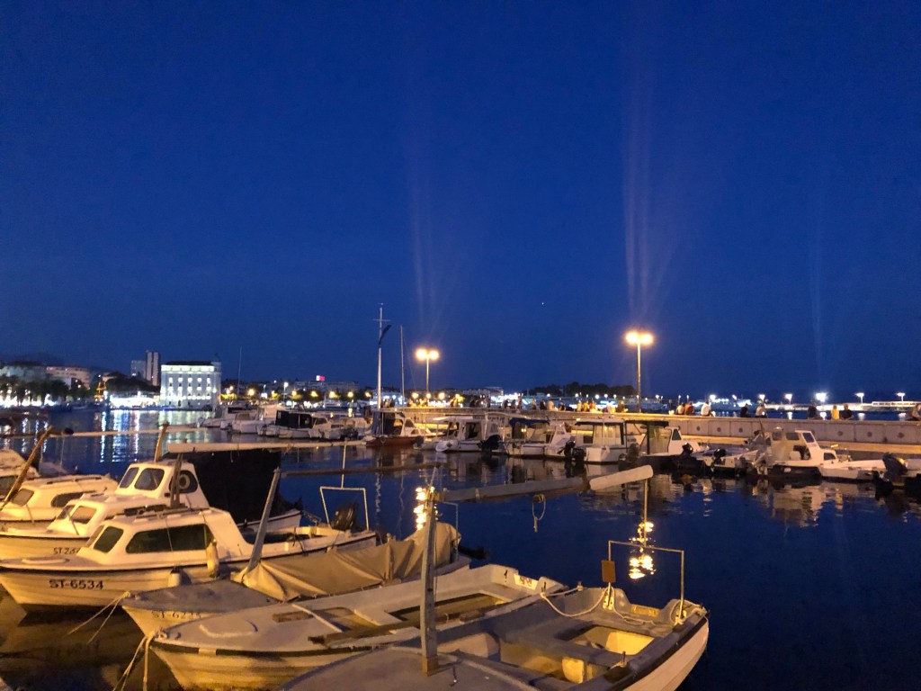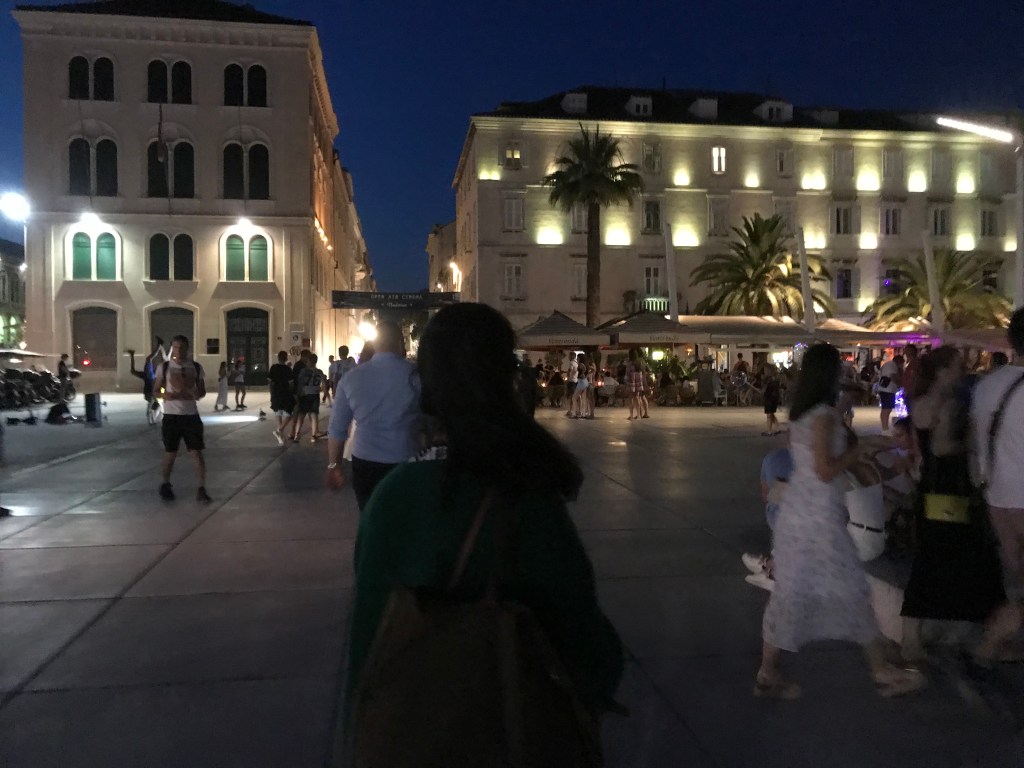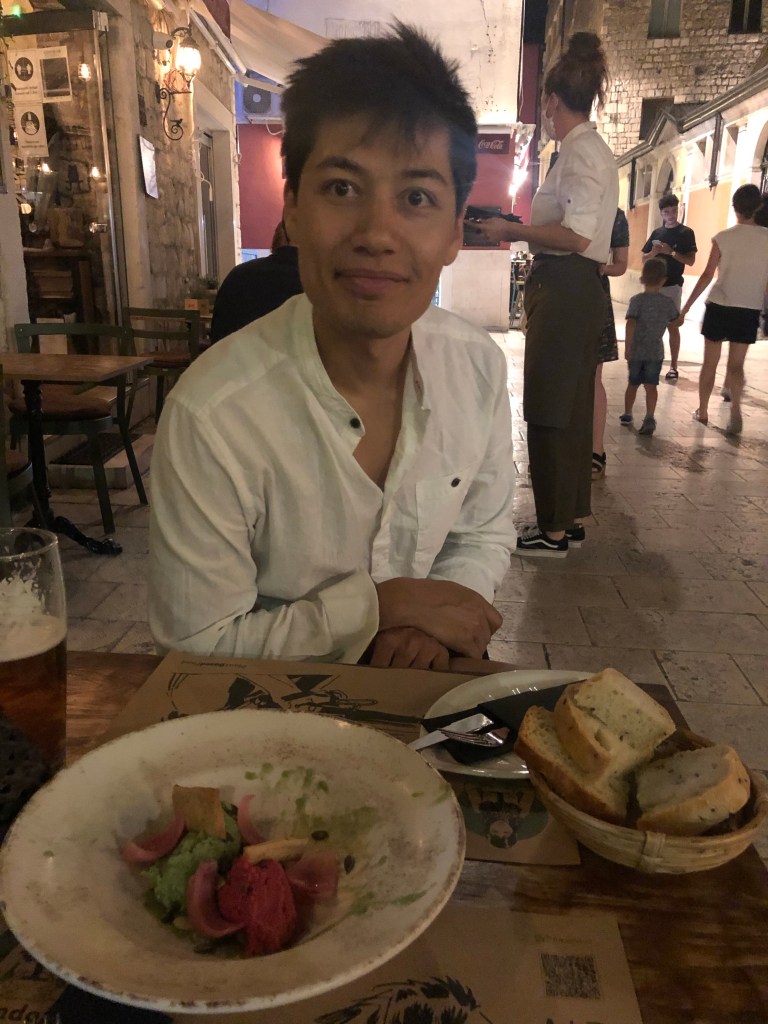 They arrived in Split and bag came out super fast and a guy from the hotel was waiting for them. The airport was really nice and new. They chatted to the driver/ hotel man who was really nice and gave us loads of recommendations and L was happy with the personal service. They pulled up in Split by the marina and walked into old town to find the hotel which was super centrally located and is a UNESCO heritage site. They were waking through the streets listening to music and watching street performers and it felt so different to London. Our hotel guy was the only one in a mask and no one was socially distant. They felt very lucky to immediately feel that they had escaped the virus. L particularly loves the ceiling in the hotel which is wooden and beamed. They had quick showers and headed on a wander to find some food. A’s stomach was a bit dodgy (probably the raw milk) and so they went to a vegetarian restaurant which looked really nice and had a man playing the guitar outside. They immediately felt on holiday and there were lots of people sitting in the small cobbled streets eating. They shared a vegan burger and vegan truffle pasta which was amazing. L had a £3 Croatian red wine and A had a Staropramen (cheekily from Chzechia). The waitress was lovely and they wanted to tip her so they went to an ATM and A by mistake took out £500 of Croatian currency (he thought he was taking out £50) and then told Leila to tip the waitress £30. Luckily she was confused and then they laughed about all the cash he was holding and planned how they would spend it as they walked along the marina which was really busy and lively. They noticed that the Croatian women all seemed to be quite dressed and made up and the men were quite casual (A was actually overdressed for once in a white shirt and L was undressed). After a walk they found another bar outside where there was live music and A had a second beer. L was a bit tired and her eyes were hurting a little but she enjoyed the music, especially Purple Rain. They headed back to the room discussed breakfast with the nice man in the hotel who asked them what time they wanted to eat and specifically how many croissants they eat breakfast and what time. L went to bed thinking of the croissants but couldn’t fall asleep. A fell asleep immediately.