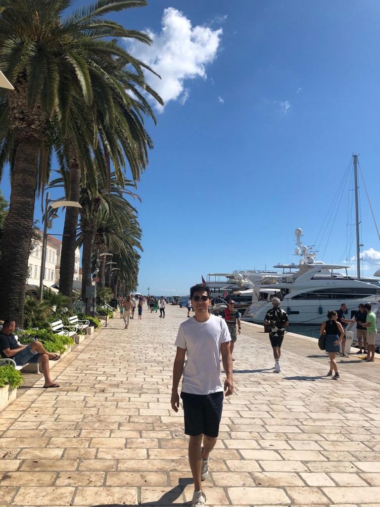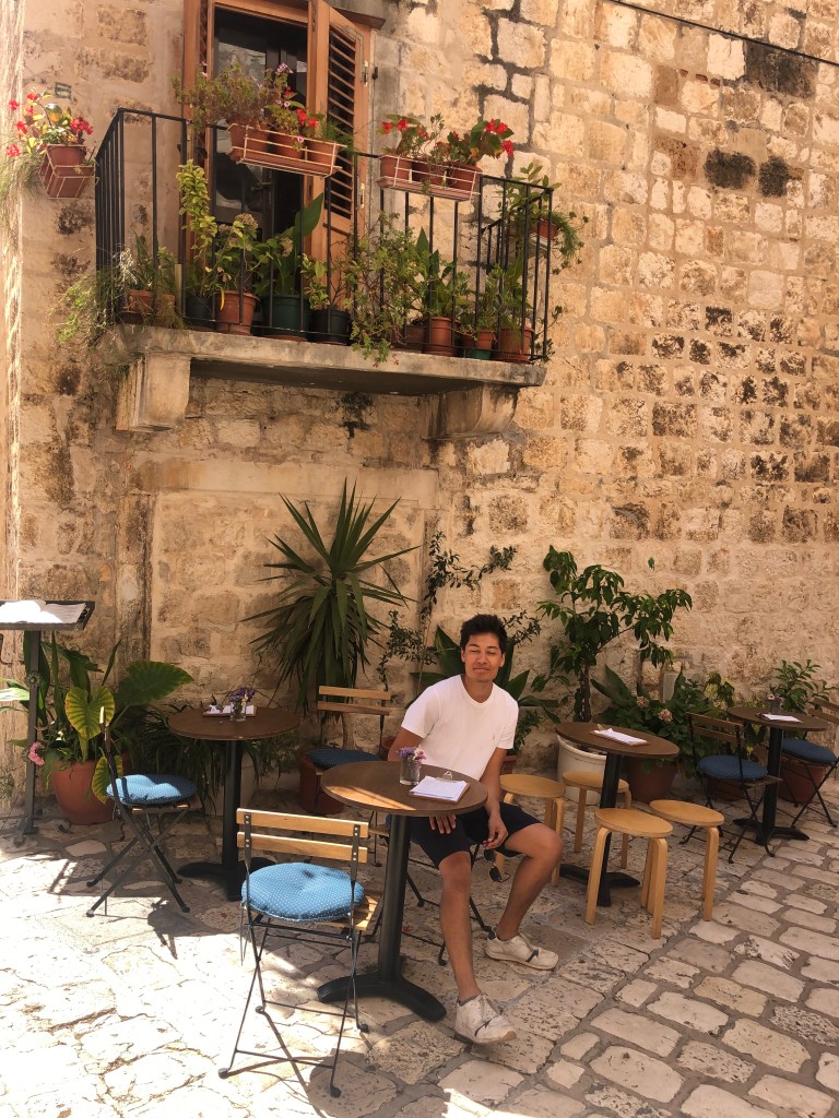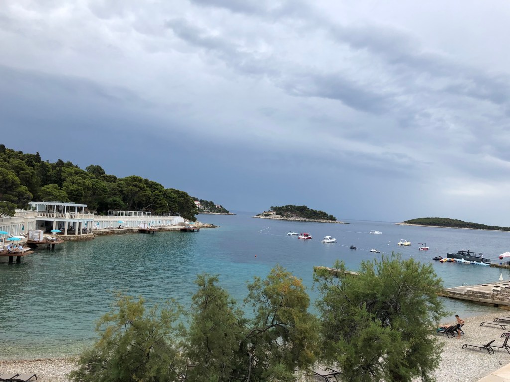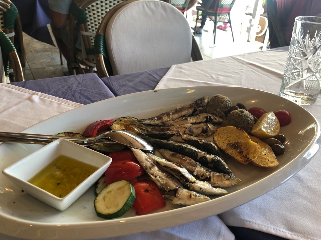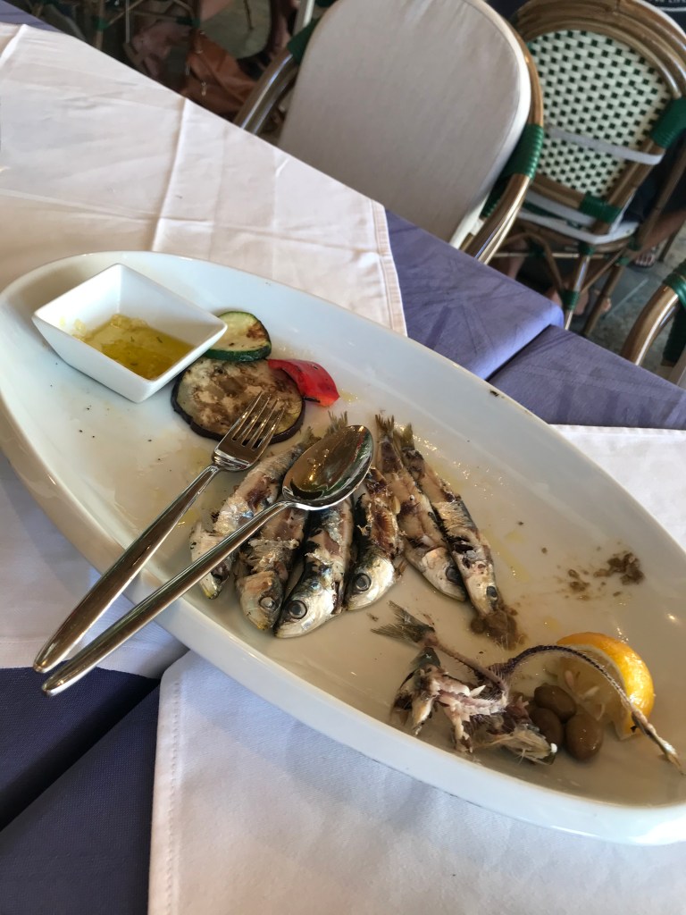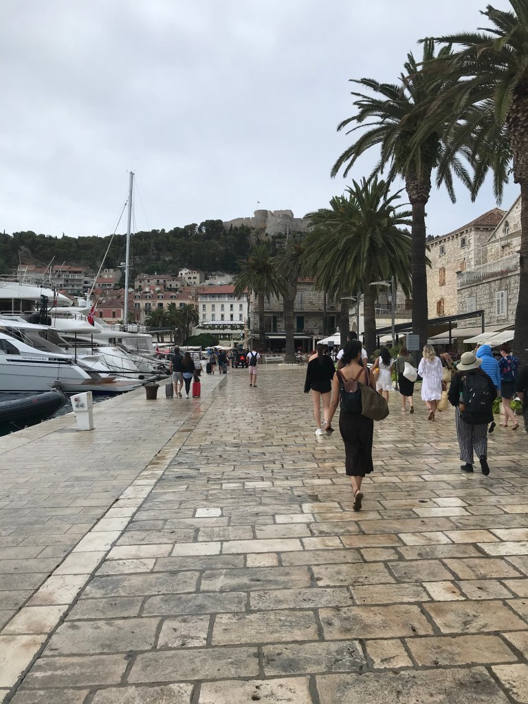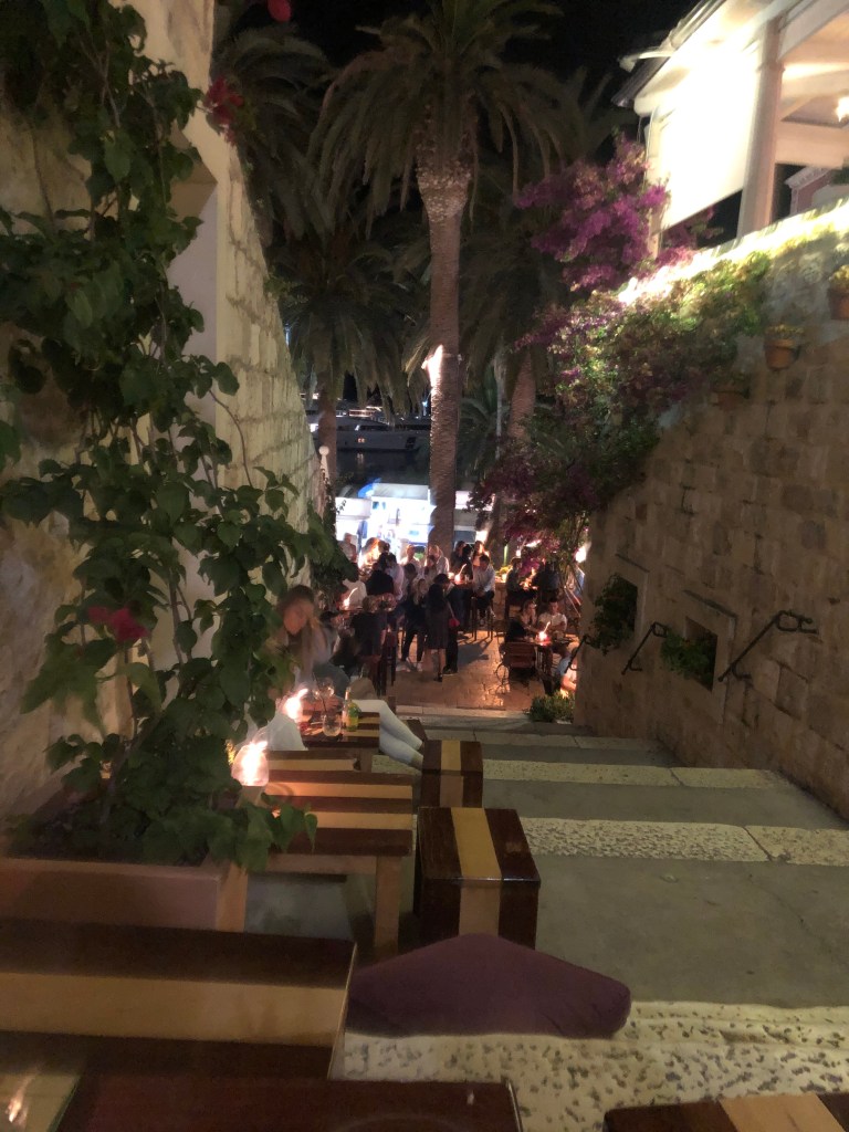 They arrived in Hvar 1h15 later and it was spitting with rain, but they decided to plough on to their B&B instead of stopping at a promenade cafe. The old town is beautiful with lots of steps, small alley ways, coves and white cobbled streets. There were a lot more tourists vs Split and they heard more English accents. They walked along the coast on a path that was resort – like to their apartment. They were greeted by their hosts who were super welcoming and gave them homemade lemonade and a long description of the house and surrounding area. L was really impressed by how clean the place was and loved the extra space compared to the hotel room. They had a quick turnaround before heading into town to have an explore, they went to backlane, the no.1 restaurant on Tripadvisor, which has amazing beer but didn’t serve food, they found it super hard to find anywhere still serving but they finally found a place open along the harbour where they bought sardines (not on the menu) after having spotted an old couple eating them a few tables over.