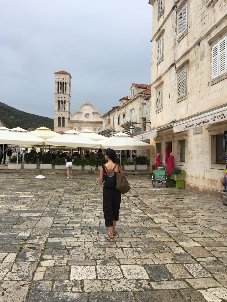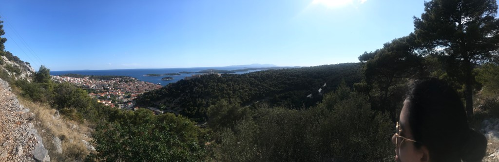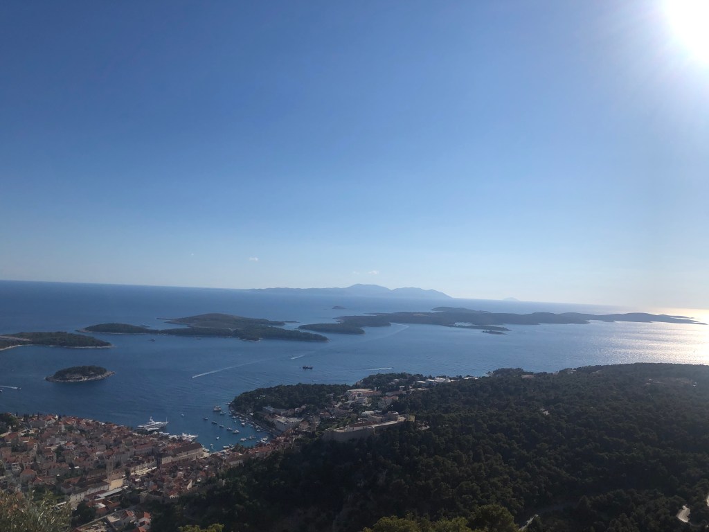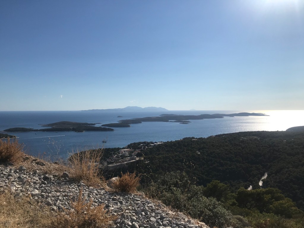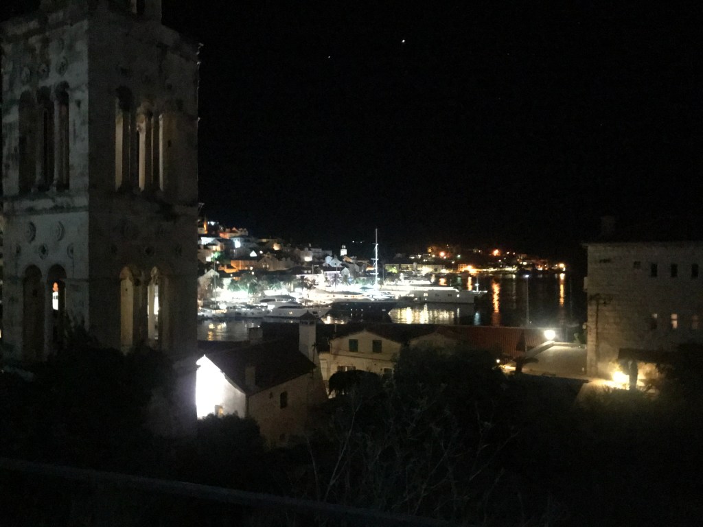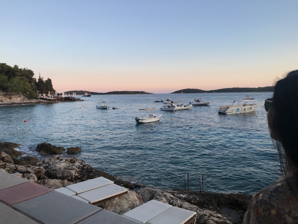 They loved the sardines, another fish to add to L’s new foods list, and then headed for a long hike up the mountain to the Napoleon fort. On the way we chatted about Marxism again and whether their end goal is a Utopia and it’s relation with the state. They only passed 2 girls on the entire route and ended up really high up after 40 minutes with a beautiful view of Hvar and the Pakleni islands. They chilled on the bench for a bit then headed back, which L found way harder and fell over (minor) and chatted about gender and sexuality. They walked back to the apartment through old town and freshened up before heading out for dinner walking along the seafront wearing shirt and dress. They arrived at a seafood restaurant recommended by their host where the guys that own it go out and catch the fish and octopus with their hands that day. It was busy but not touristy and they sat on the quiet street. There were only 6 things on the menu of which 4 had octopus. L ordered a seafood stew which ended up being a giant seabass not carved with potatoes and A had octopus risotto with chips on the side (despite the waitress telling them they had too much potato). They both had nice wine and made a list of the things they’d learned to love from each other e.g. seafood. Food was beautiful and they licked the plates clean. Then they headed to a bar and sat on the steps seats and listened to live music. A had a negroni and L a grapefruit G&T. They had to stop being cutesy because the waitress kept appearing and they felt awkward. They wandered home and headed to bed and slept late.