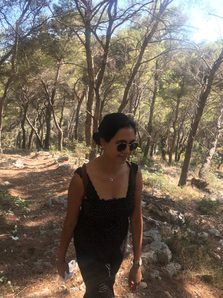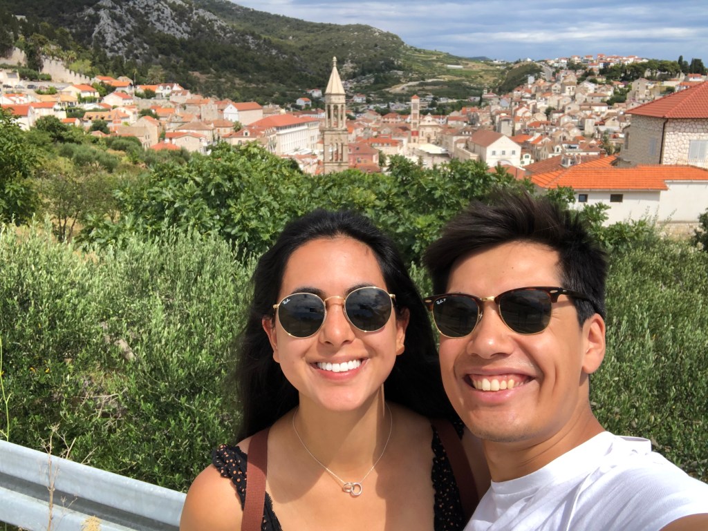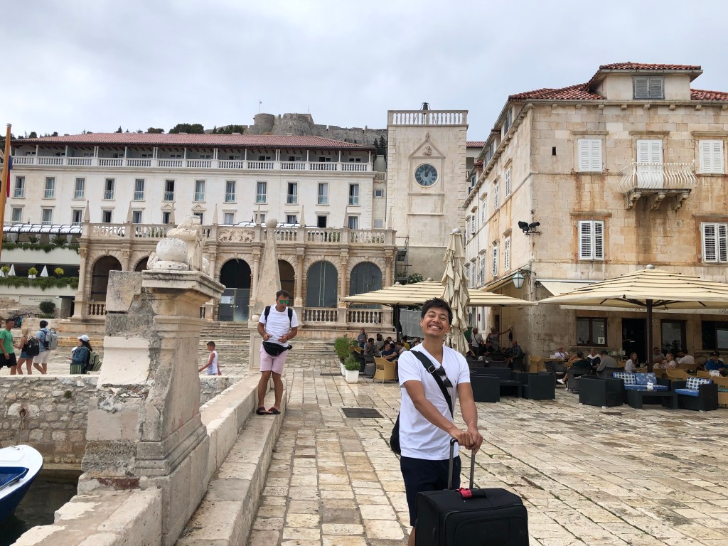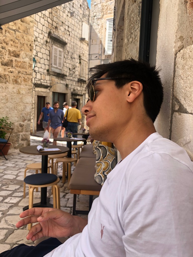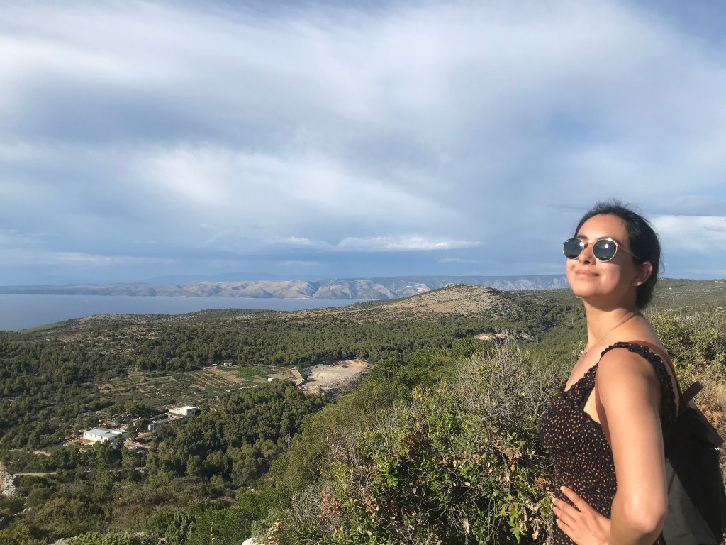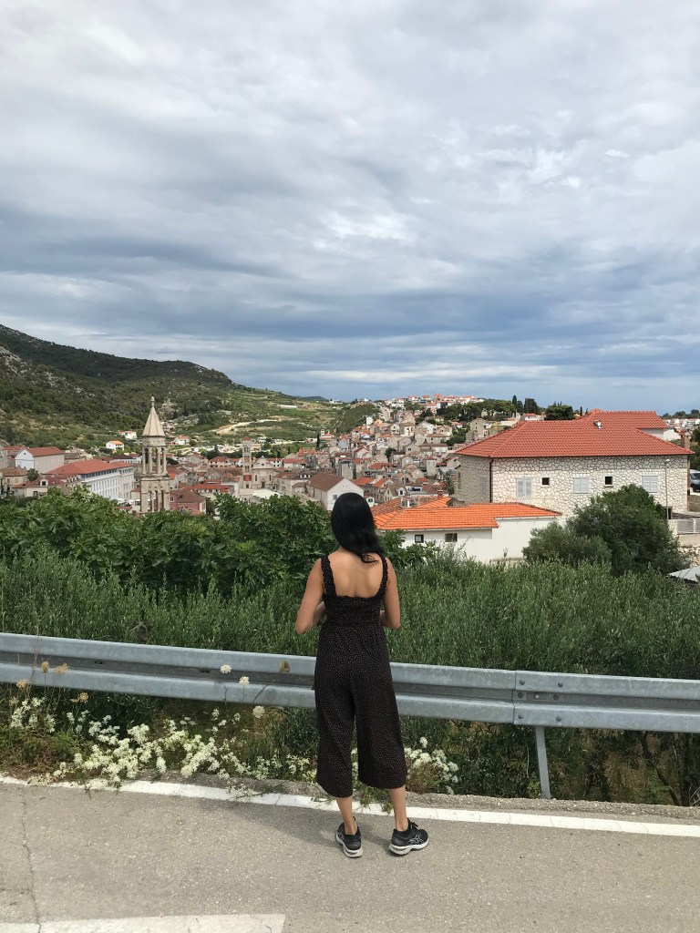 They loved the sardines, another fish to add to L’s new foods list, and then headed for a long hike up the mountain to the Napoleon fort. On the way we chatted about Marxism again and whether their end goal is a Utopia and it’s relation with the state. They only passed 2 girls on the entire route and ended up really high up after 40 minutes with a beautiful view of Hvar and the Pakleni islands. They chilled on the bench for a bit then headed back, which L found way harder and fell over (minor) and chatted about gender and sexuality. They walked back to the apartment through old town and freshened up before heading out for dinner walking along the seafront wearing shirt and dress. They arrived at a seafood restaurant recommended by their host where the guys that own it go out and catch the fish and octopus with their hands that day. It was busy but not touristy and they sat on the quiet street. There were only 6 things on the menu of which 4 had octopus. L ordered a seafood stew which ended up being a giant seabass not carved with potatoes and A had octopus risotto with chips on the side (despite the waitress telling them they had too much potato). They both had nice wine and made a list of the things they’d learned to love from each other e.g. seafood. Food was beautiful and they licked the plates clean. Then they headed to a bar and sat on the steps seats and listened to live music. A had a negroni and L a grapefruit G&T. They had to stop being cutesy because the waitress kept appearing and they felt awkward. They wandered home and headed to bed and slept late.