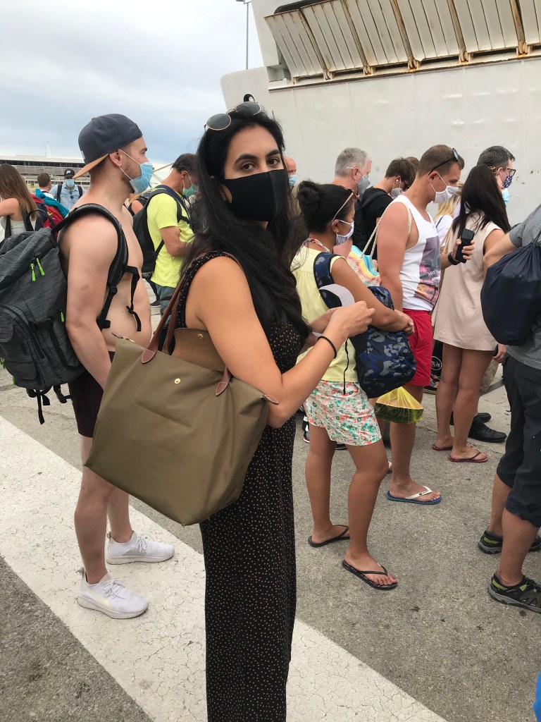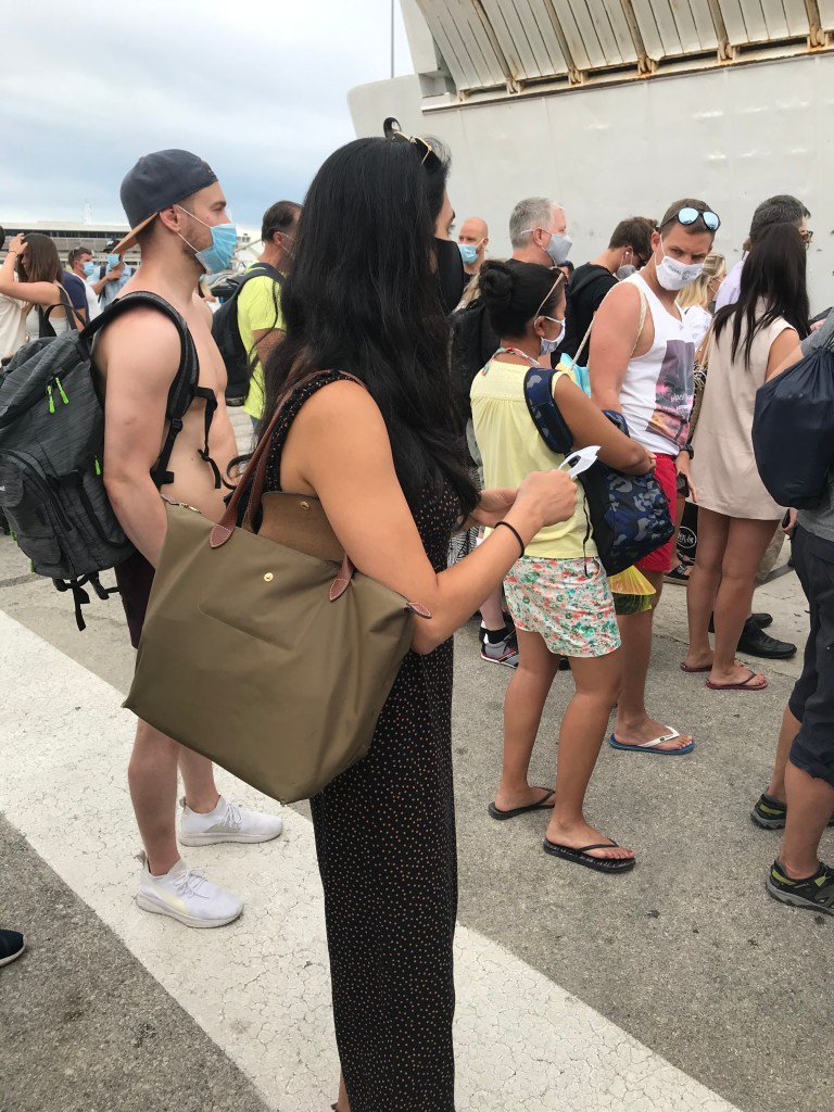 The alarm went off at 9am. L hadn’t slept that well again but they needed to get up to have breakfast before checking out and making the ferry at 11am. They packed quickly and headed down to breakfast, which was the usual scrambled eggs, croissants, juice and a surprise addition of yoghurt and granola for A. More people checked into the hotel for the weekend and there was a group of 4 at breakfast. They then checked out and headed to the ferry (stopping by a pharmacy on the way), stopping for a gross coffee nearby where they didn’t know what a flat white was. They sat on the deck on the ferry listening to Talking Politics about Fanon on Colonialism and A explained Hobb’s theory to L and they chatted about Marxism and the idea of small vs. big states. A remembered all of the reading and thinking he’d done about this before. They both really enjoyed the podcast and it will probably become a fave going forward.