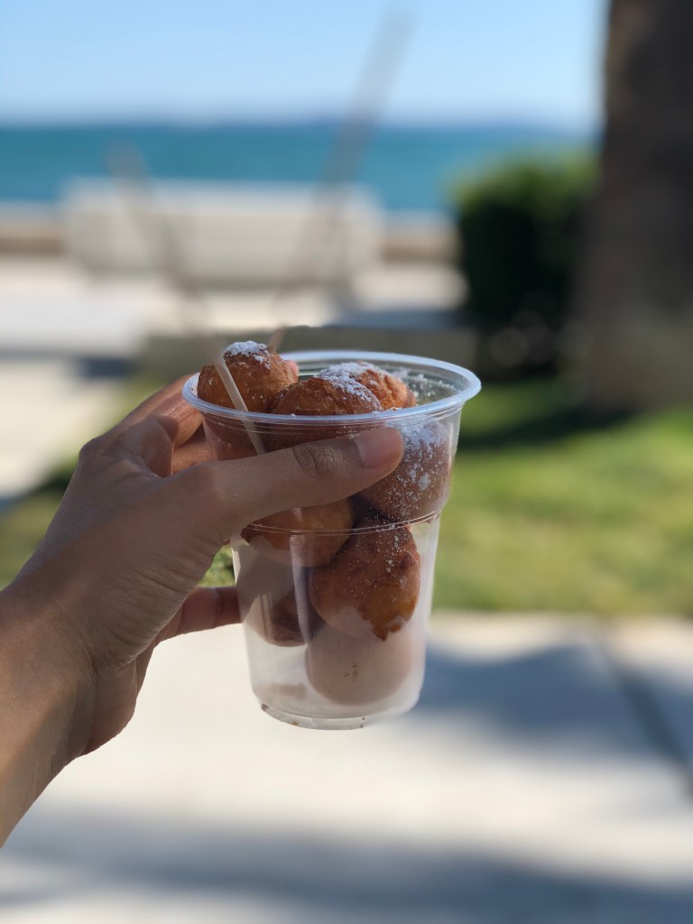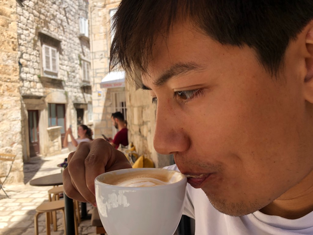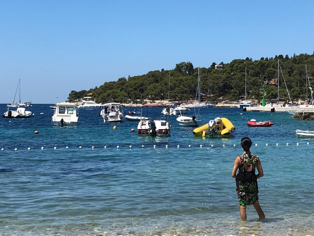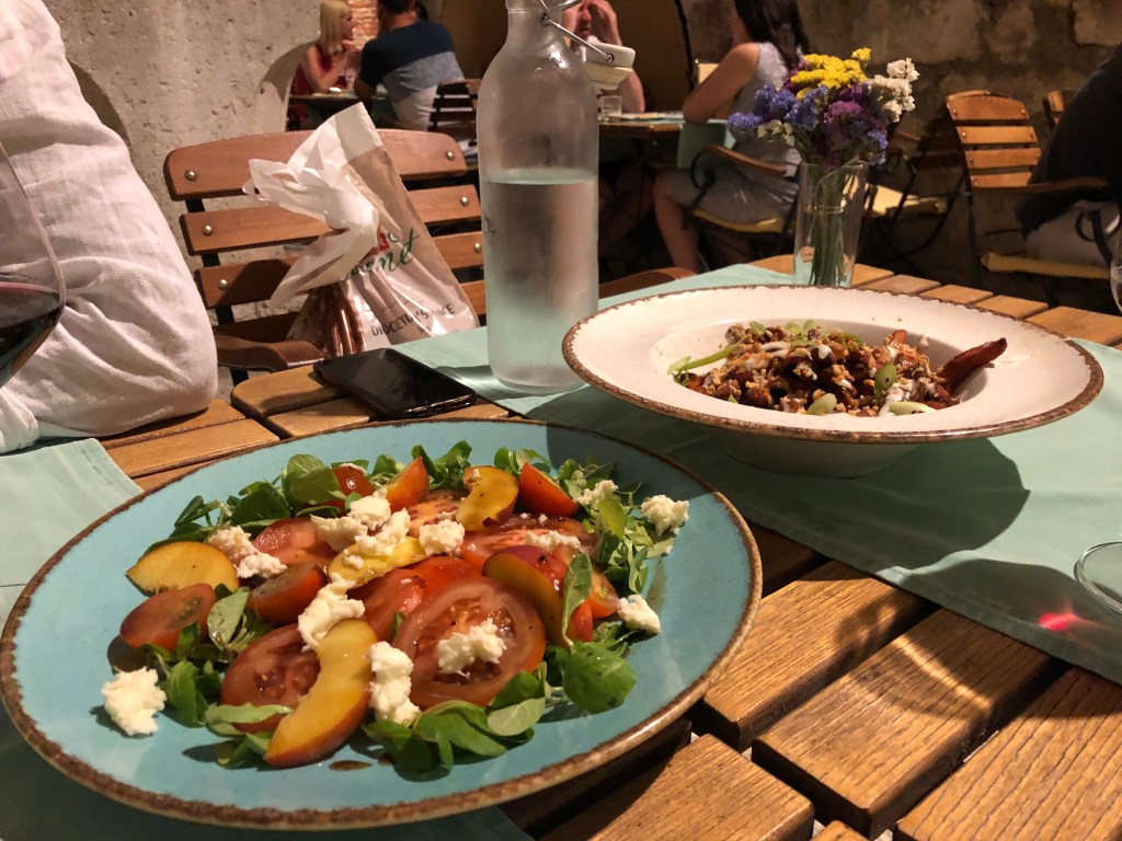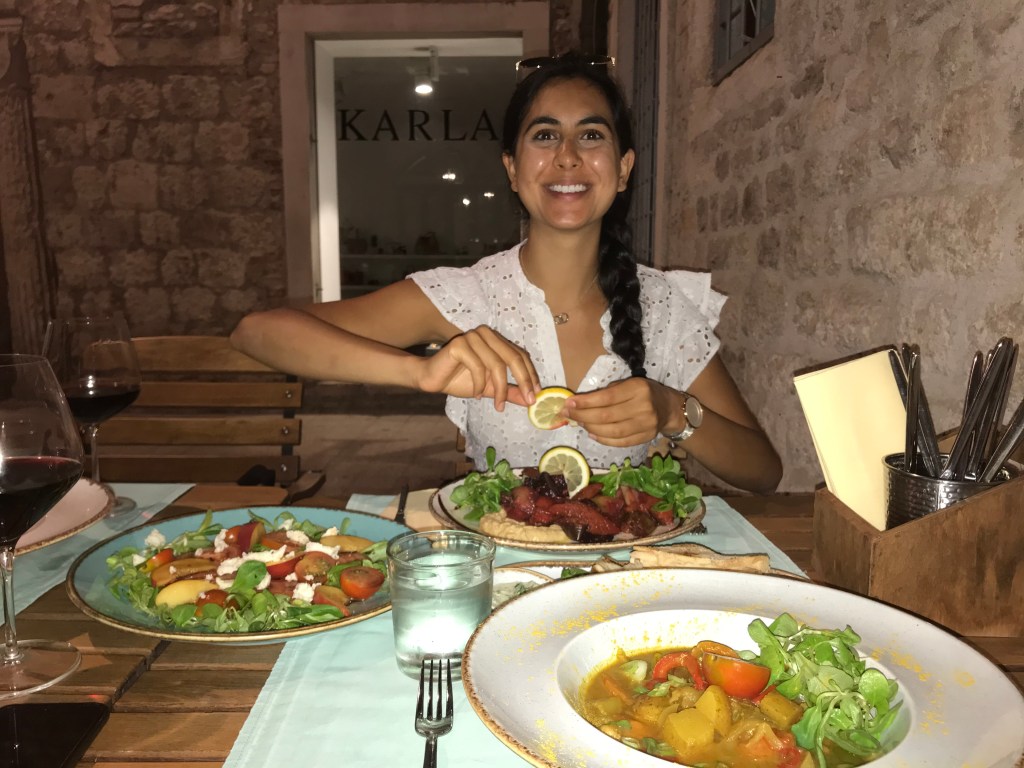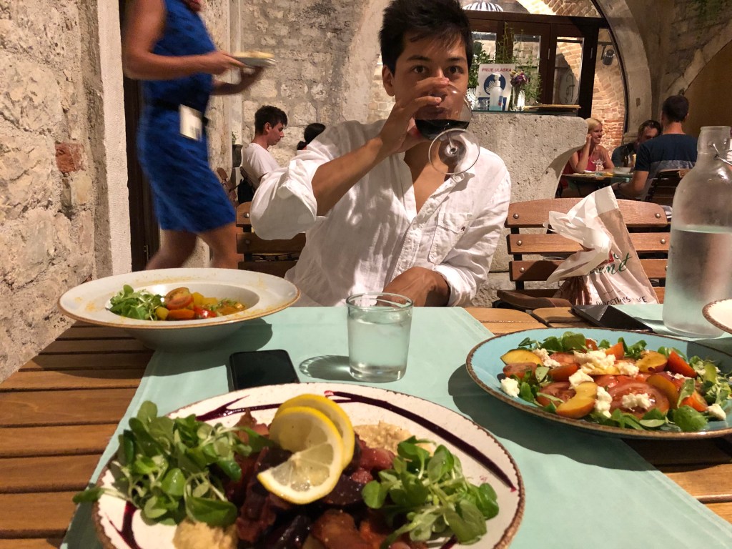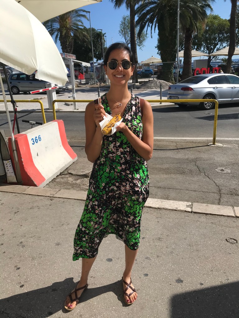 They woke up at 9 and packed up to leave the apartment. A showered whilst L made a breakfast of all their leftover food to eat on the terrace – brown bread, tomatoes, cheese, honey, berries and pear. Then they headed with the suitcase towards the sea promenade and it was hot. L couldn’t swim that day so she sat in the shade next to a boat with load music and read whilst A had a dip in the sea. Then they headed to back lane bar again (3rd time) and had a coffee. L tried rice milk which was super sweet but quite nice. Then they hung out until the ferry at lunch time and dipped their feet in the sea. On the ferry they read Alex’s CV and cover letter and arrived in Split. L was feeling a bit nauseous still so they headed straight to the hotel (which had given them an upgrade) and had a chill for a bit. They then tried to get a bite to eat but the whitebait place had no whitebait, they couldn’t find a beach hat, and then the veggie place on Tripadvisor didn’t exist. They ended up wandering to Fig Split which was also shut and then went to get a grilled sweetcorn and some doughnuts (which were superbly savoury, A added Nutella) and ate them on the promenade. L had spent some time googling Croatian Gin because A really wanted some and the place online looked quite far. Luckily she found a bar that served Curzola 1298 so they headed their for a G&T and a pale ale. They sat there and worked / read for a bit but L still wasn’t feeling great so she headed back early, but got distracted by the olive oil shop and got chatting to the lady and tried her tuna and mussels (which she then bought for their picnic the next day). They rested in the bedroom then headed out to try Kurbuna gin in olive oil bar and then A found Old Pilots in the cigar shop right next door! Then they rushed to SPAR to get more food for the next day, L had found a super deal on their trip to Kyrka the next day with grey line so they booked online and rushed to the store to check some details. Now settled for the next day they went to Fig Split where they ordered a feast (All veggie for the first time since they arrived). There was an opera going on nearby so they ate and listened and it was super nice. They then came back for just past 10 (May have forgotten something here)