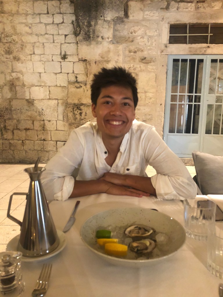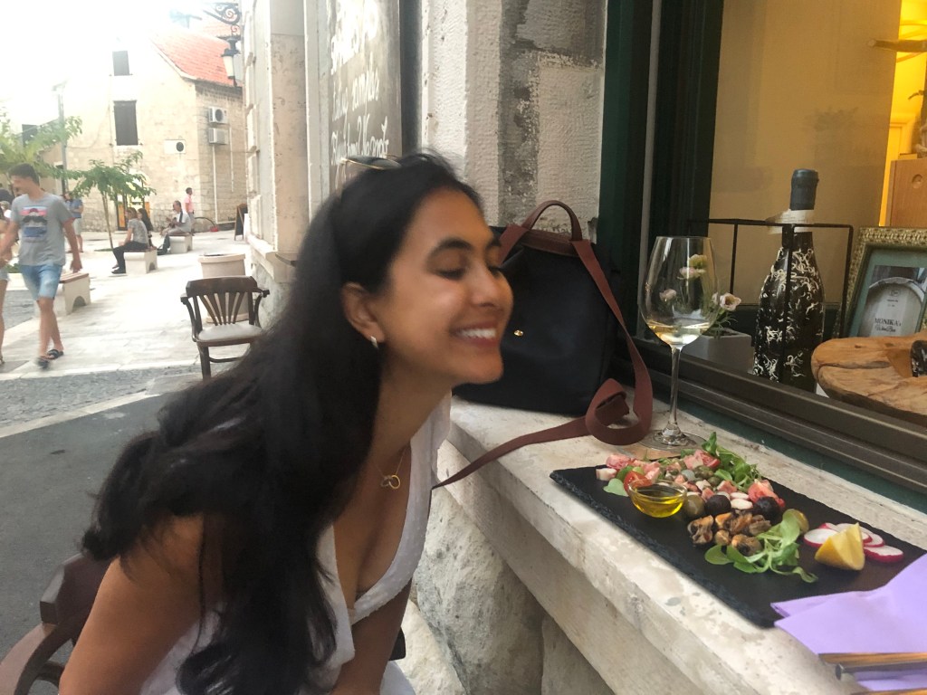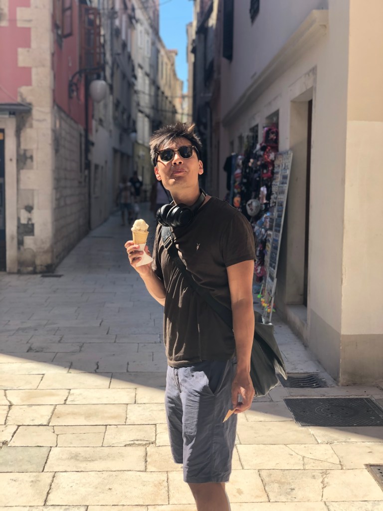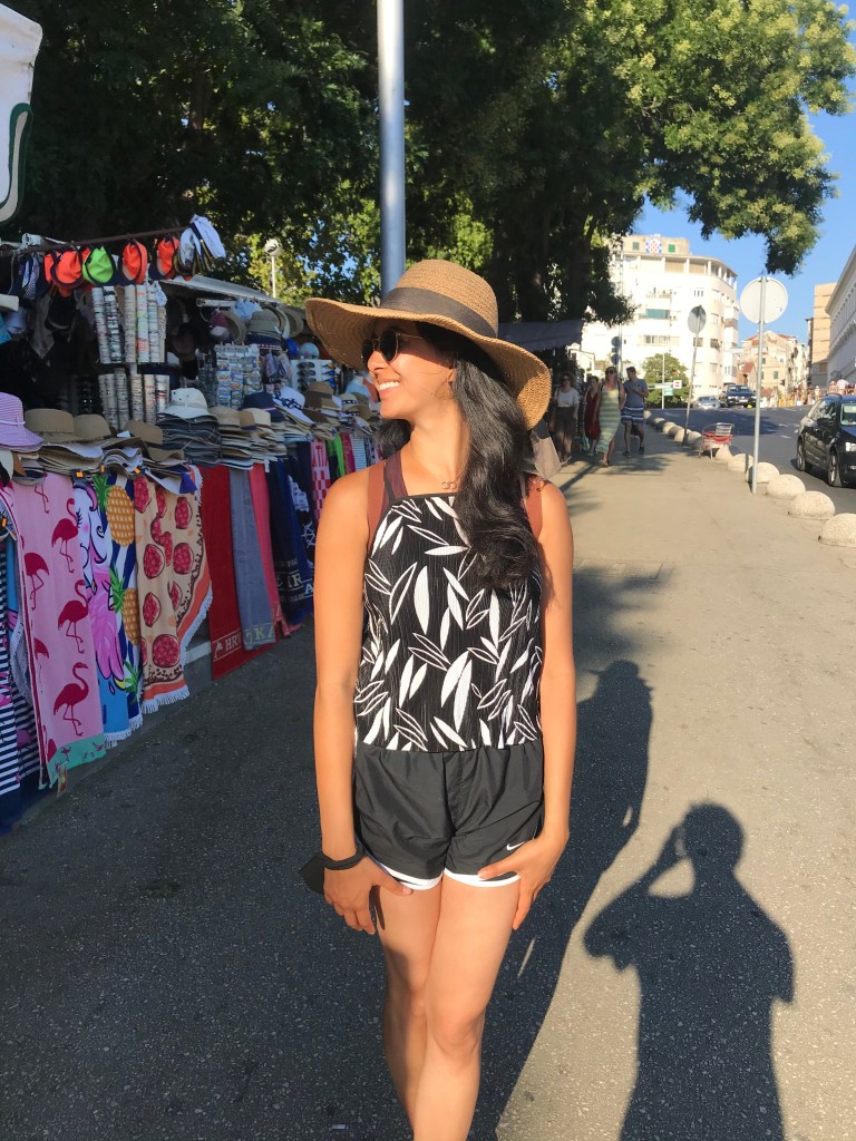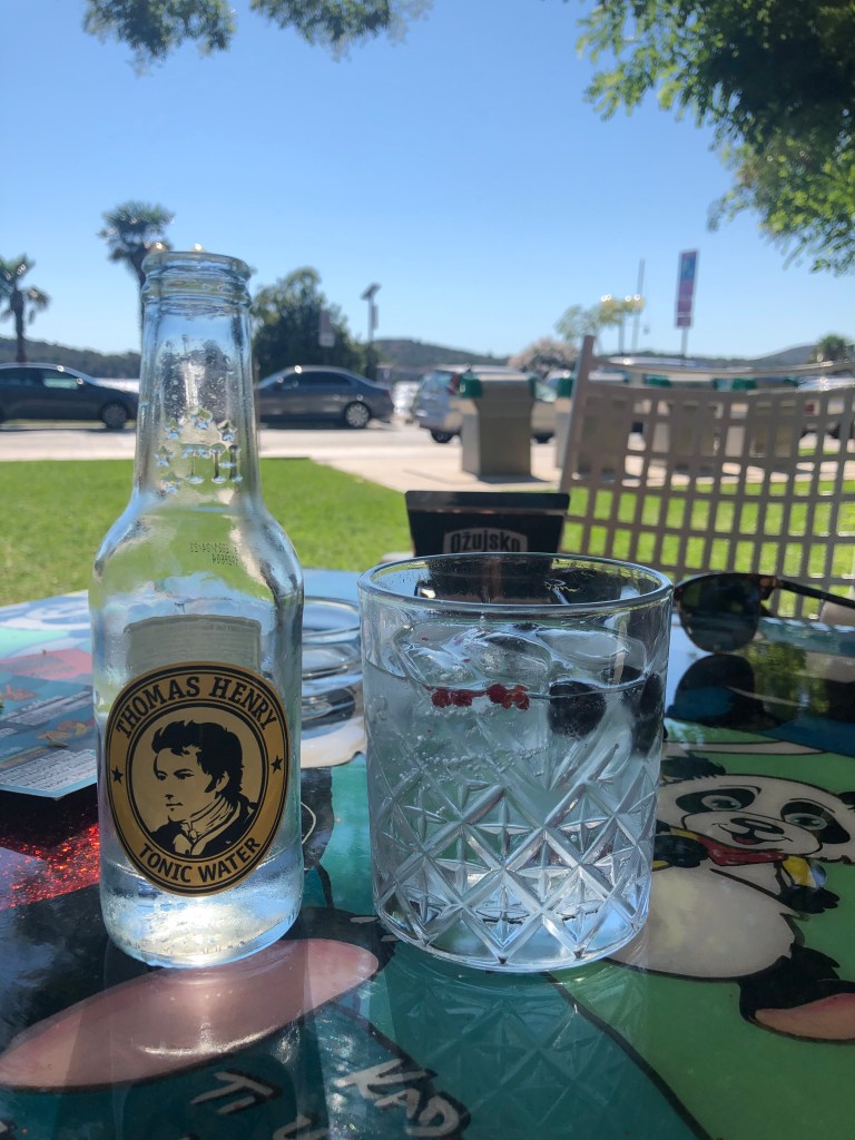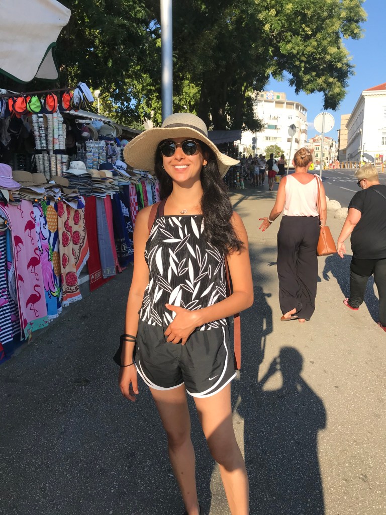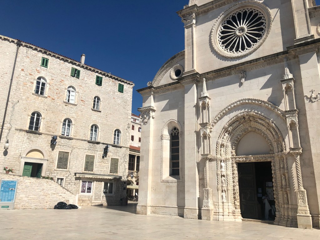They then got back on a very hot bus (it was 35 degrees by this point) and headed 30mins to Šibenik (they hadn’t booked this tour but somehow managed to be on it). On arrival they learnt about the city and its foundation and defenses in the 11th century but it was really hot and they were flagging a bit, so they went for ice cream instead of following the tour to the church. A had an amazing hazelnut ice cream that L loved too. Then they walked through the pretty small town, saw the cathedral and ended up finding Old Pilots Gin again and having a drink before getting back on the bus to go to Split. They found a hat stall right by the bus stop and L tried on some hats but didn’t like the cheap looking rim so didn’t buy it, but it was the closest they came to finding the perfect hat.