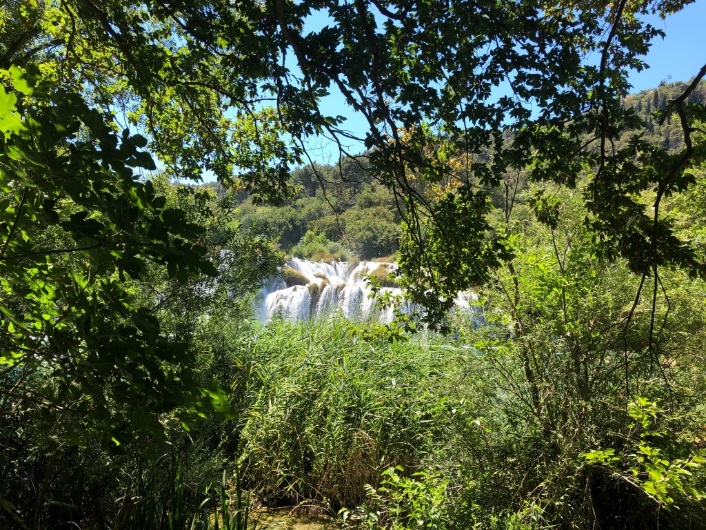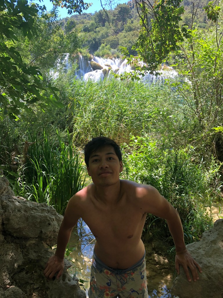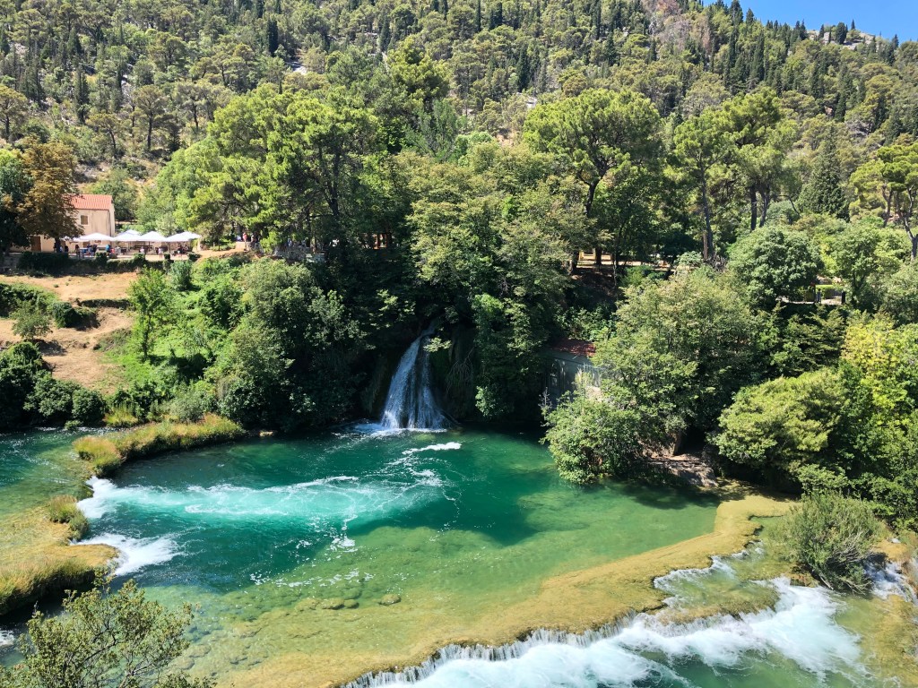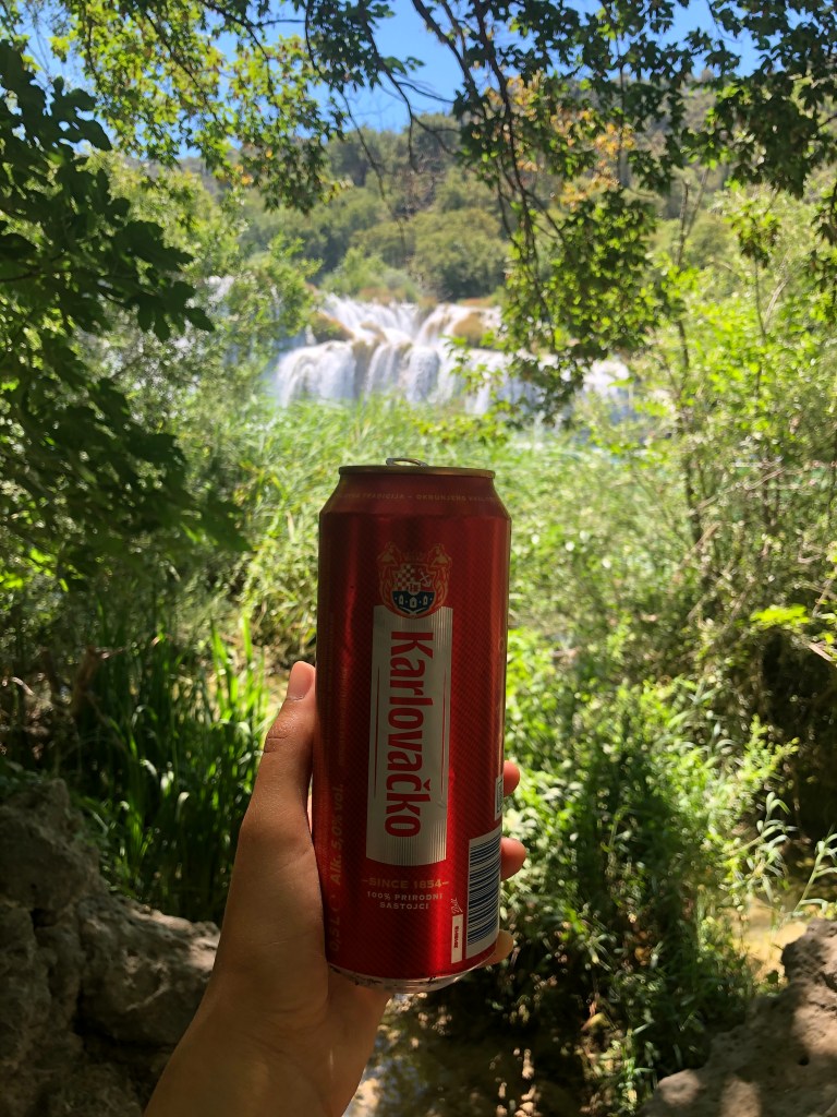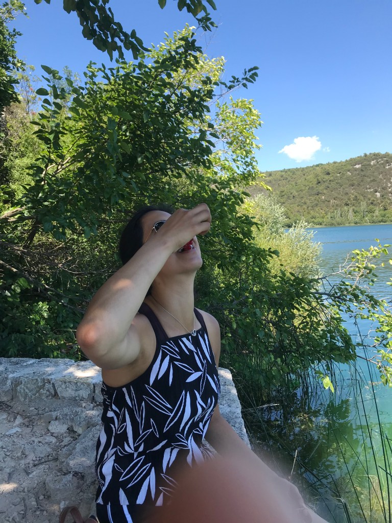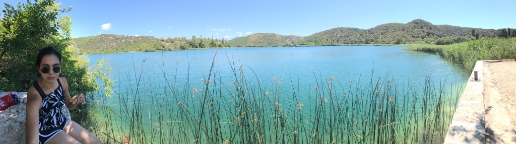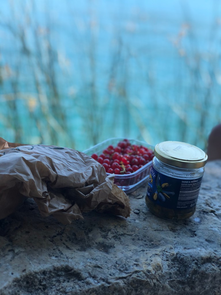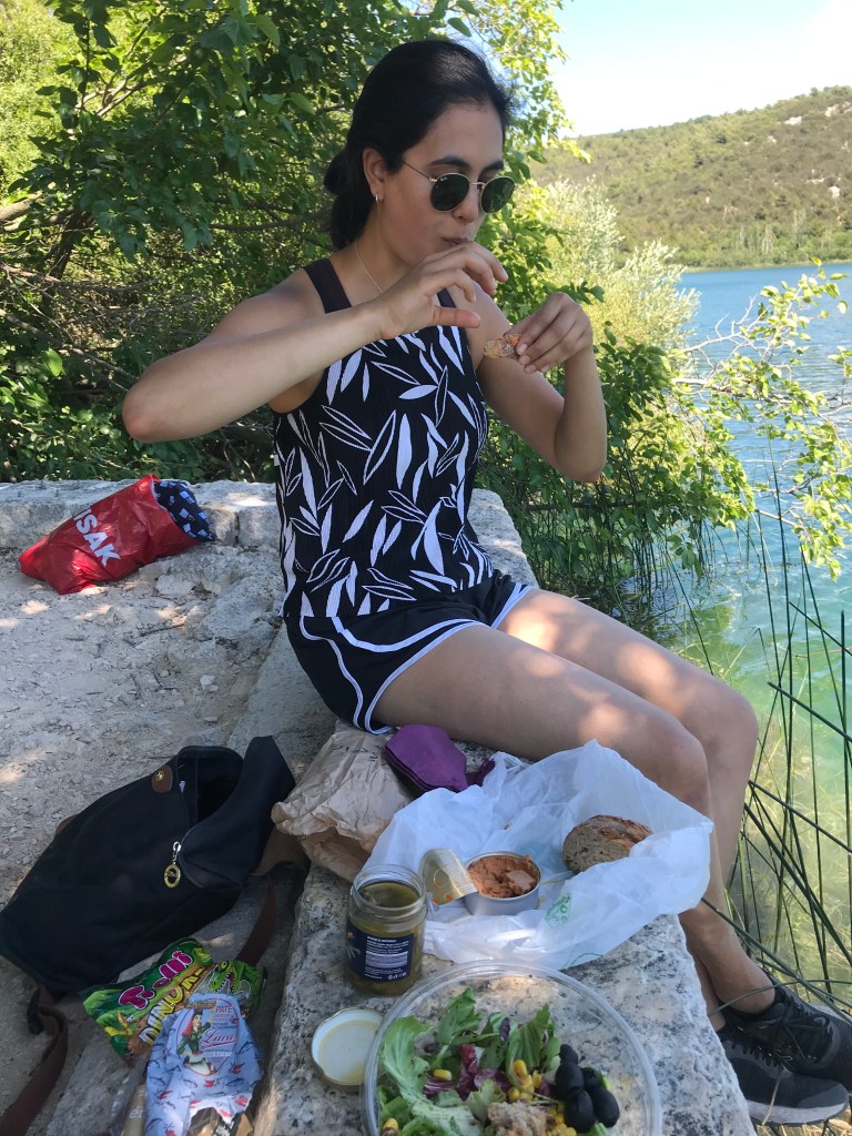 After a quick loo break, they had a breakfast of 2 cheese pastries, banana and brown bread for Leila. The boarded the boardwalk and walked into the semi forest area with fish on each side. There were quite a lot of tourists and it was crazy hot – 35 degrees. L wasn’t feeling great and they were both quite lethargic but it was pretty. They arrived at the main waterfall area and found the best seat on the rocks to set up camp where they could see the waterfall but not the hundreds of people around them or in the water. L couldn’t swim so she sat with the stuff and A went off swimming. He made it to the waterfall and then went right to an uncrowded area. When he returned They chilled and A had a beer, before they tried to leave the business behind. A found a back-route on maps.me (has he mentioned he loves maps.me) and they walked for a while on a quiet trail and ended up at a beautiful lake in the mountains.It was empty, contrasting massively to the busyness of the waterfall area. They had a beautiful picnic of fancy bread from Kruscic, mussels and tuna from Uje deli, sour berries, salad. L was really glad she listed to A and his maps me ventures.