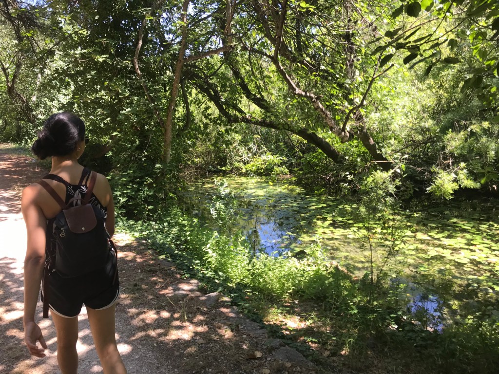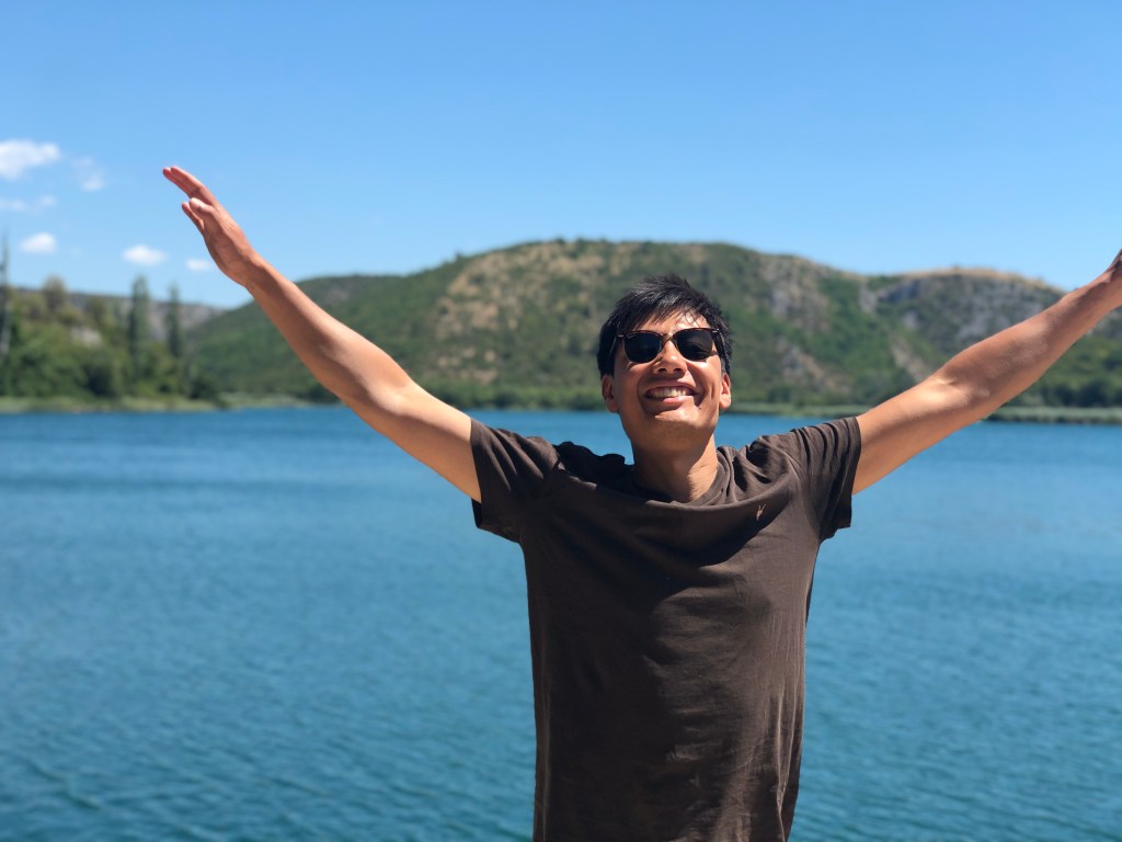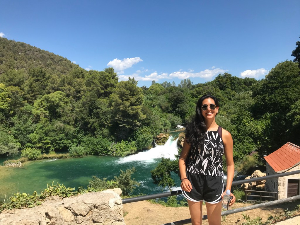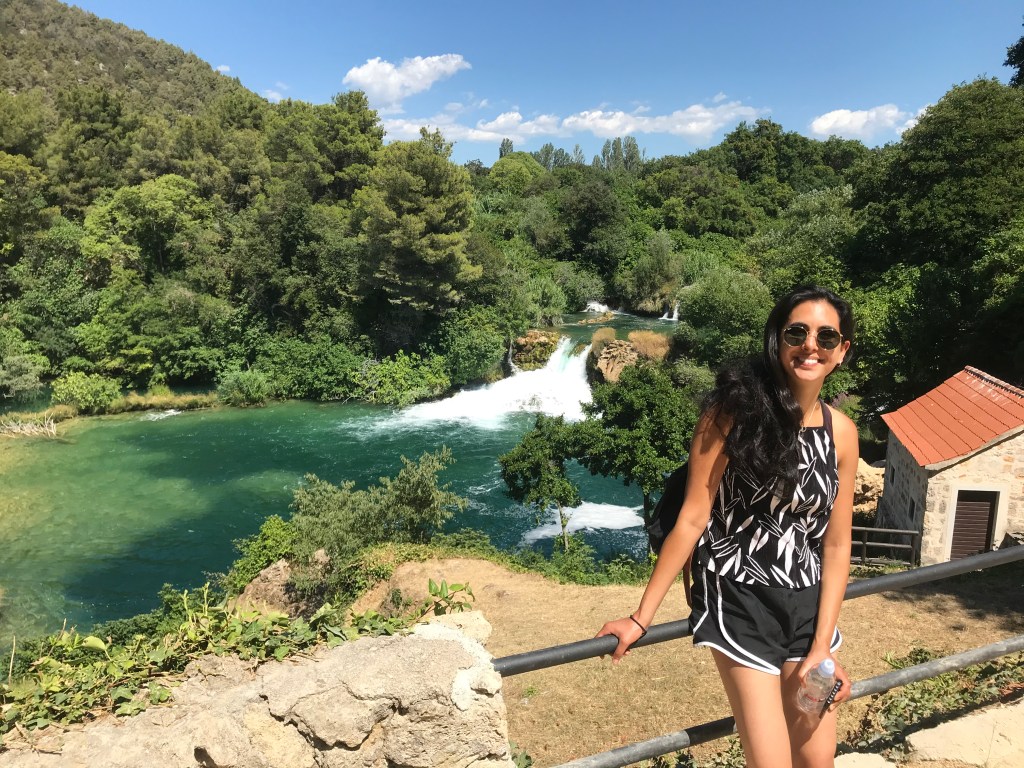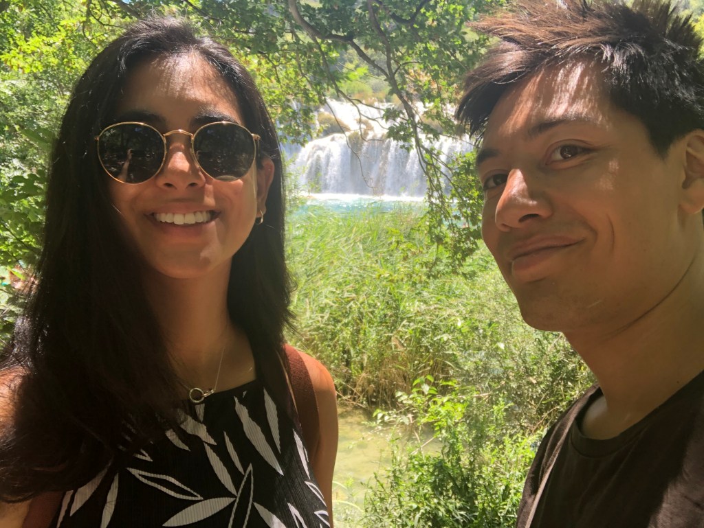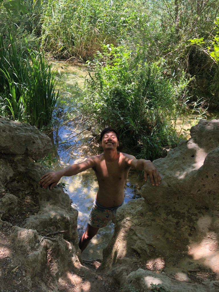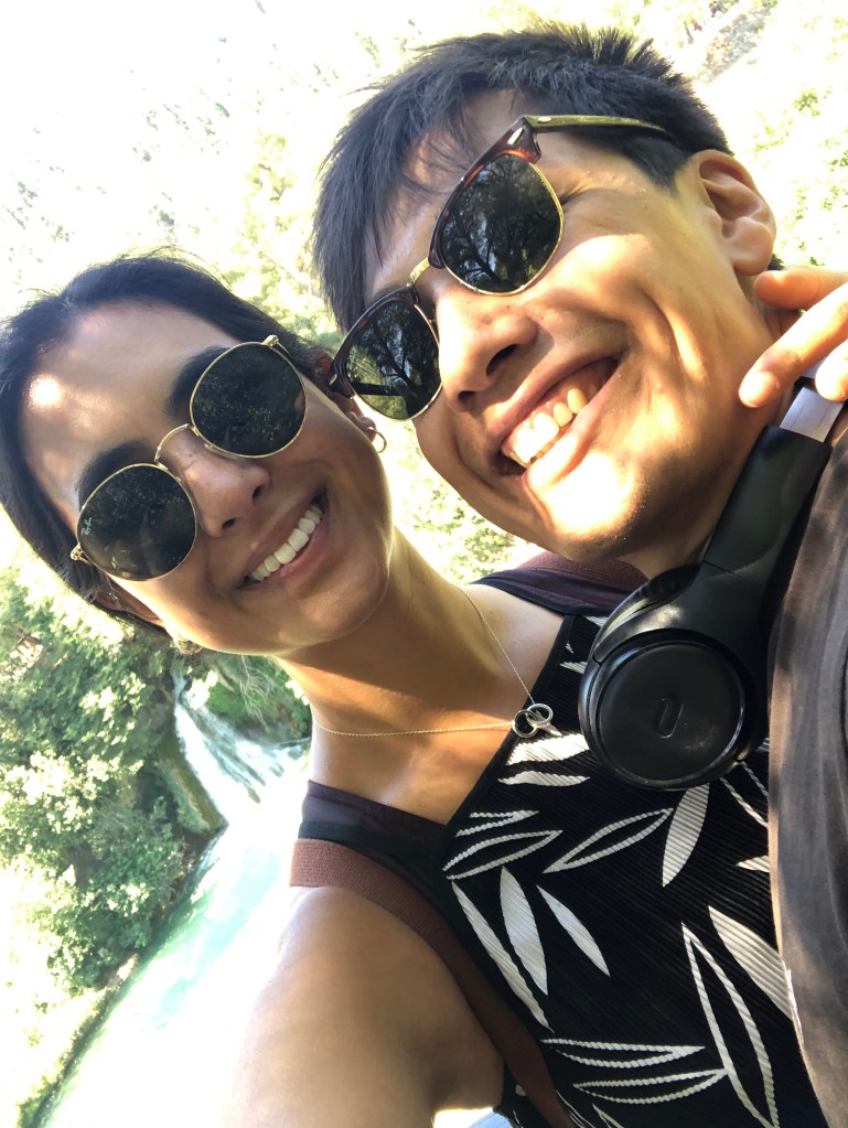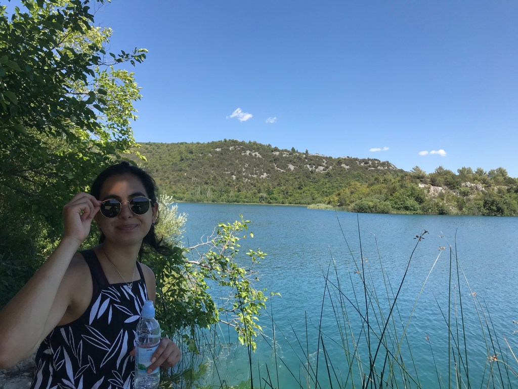After a quick loo break, they had a breakfast of 2 cheese pastries, banana and brown bread for Leila. The boarded the boardwalk and walked into the semi forest area with fish on each side. There were quite a lot of tourists and it was crazy hot – 35 degrees. L wasn’t feeling great and they were both quite lethargic but it was pretty. They arrived at the main waterfall area and found the best seat on the rocks to set up camp where they could see the waterfall but not the hundreds of people around them or in the water. L couldn’t swim so she sat with the stuff and A went off swimming. He made it to the waterfall and then went right to an uncrowded area. When he returned They chilled and A had a beer, before they tried to leave the business behind. A found a back-route on maps.me (has he mentioned he loves maps.me) and they walked for a while on a quiet trail and ended up at a beautiful lake in the mountains.It was empty, contrasting massively to the busyness of the waterfall area. They had a beautiful picnic of fancy bread from Kruscic, mussels and tuna from Uje deli, sour berries, salad. L was really glad she listed to A and his maps me ventures.