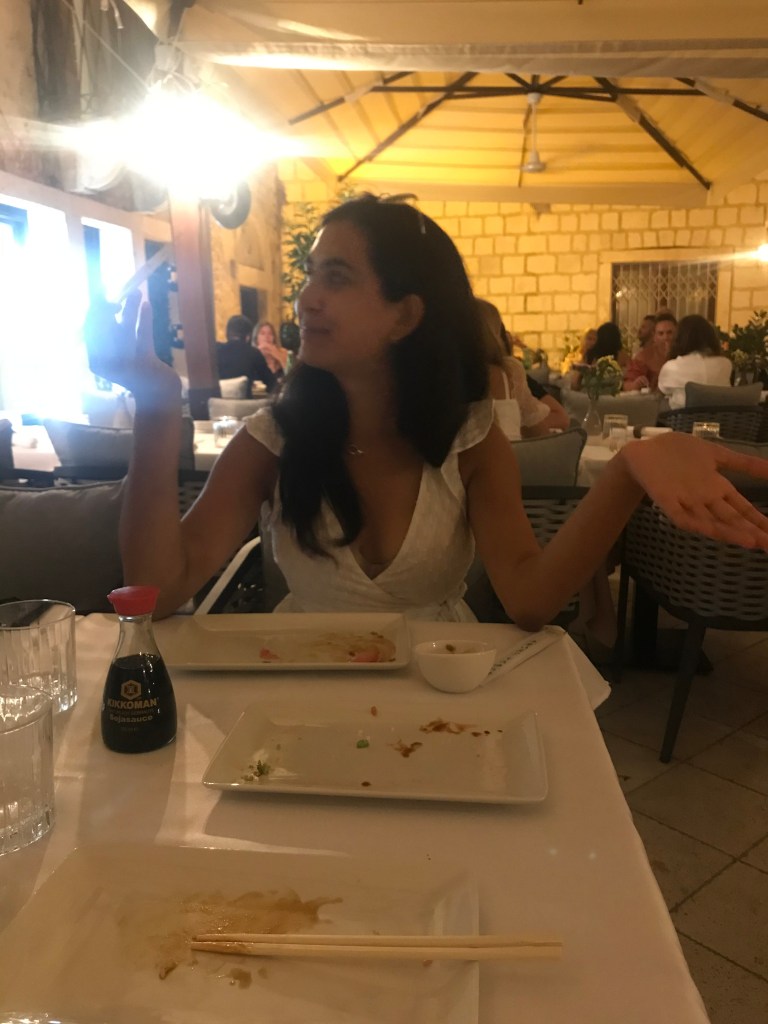 After a quick chill, they headed to Monika’s wine bar for their final night and sat outside and had their favourite white and red, with some bread, mussels and squid. Monika was quite busy and stressed as they had a big wine tasting going on but L and A had a nice time but ate way too much considering it was a starter (including extra portion of oil) and then realised they probably couldn’t eat dinner properly at Bokeria, which they had booked. Instead they went on a hunt for sushi and found themselves in a nice place outside and ate salmon skin sushi (which was the best), california rolls and spicy tuna rolls. They really noticed a change in the atmosphere with many more tourists in groups and less locals. They were glad to have come a week early when they did. After sushi they headed back and slept late.