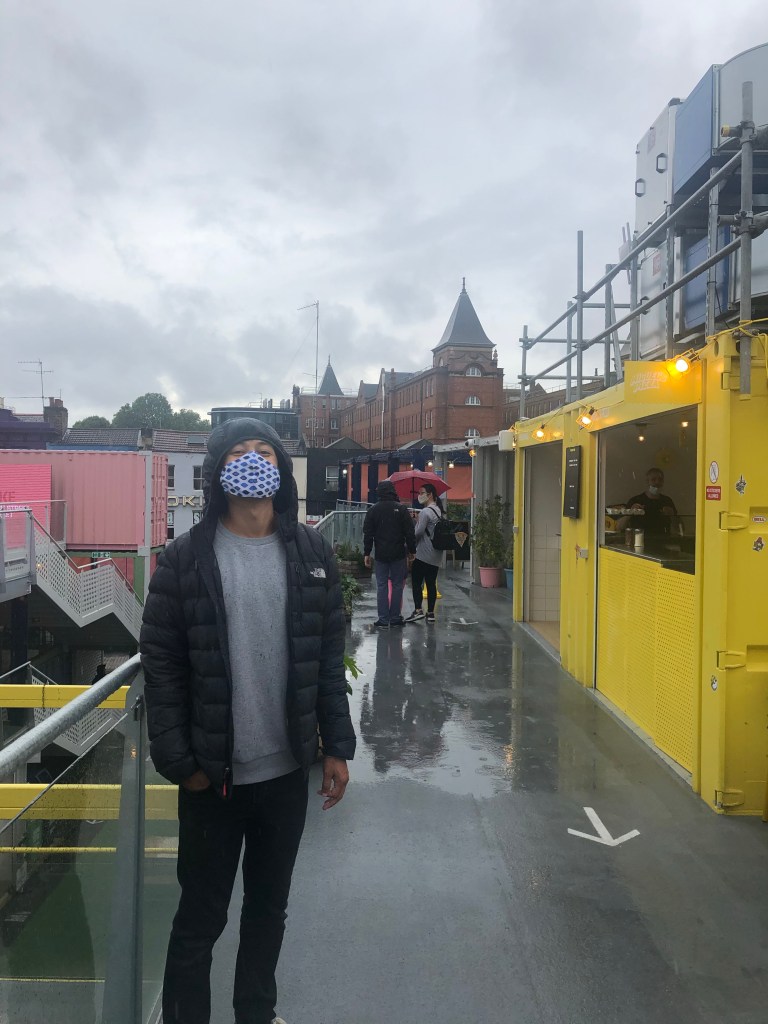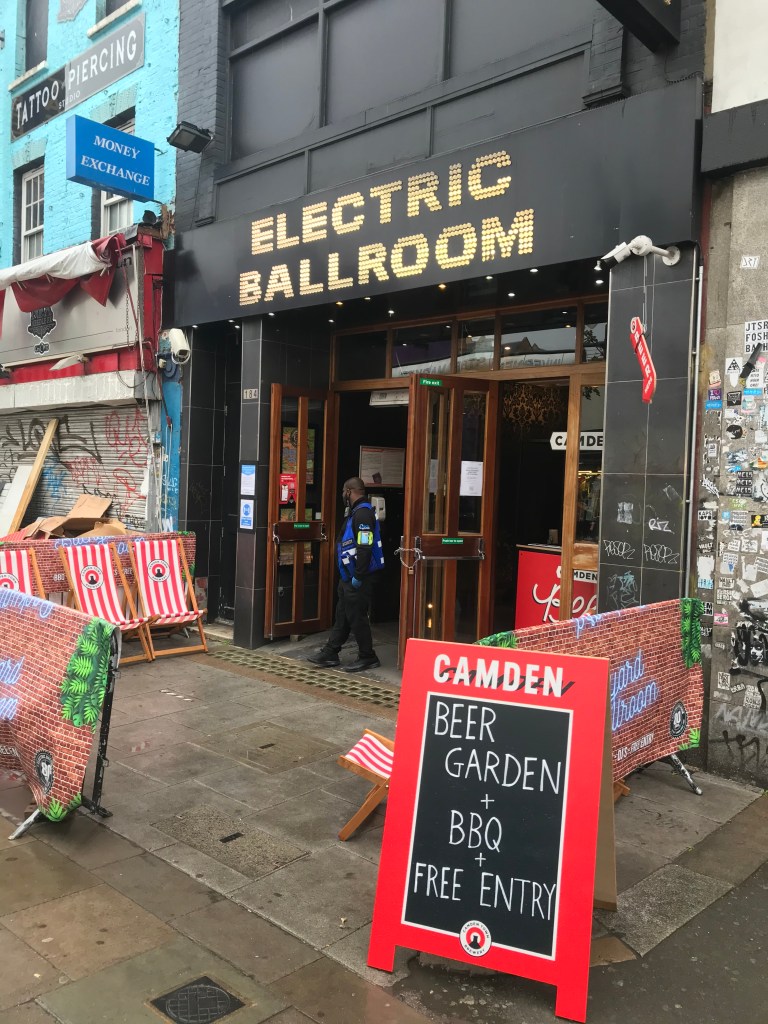 They sat on the sofa for a while and it was grey and nasty outside. L was googling holidays, and A did a little work. A felt itchy feet about being inside all day and quite literally dragged L out of the house to Buck Street Market in Camden where they had a voucher for cheap food and semi-cheap things. It didn’t rain at all (despite what it looks like in the pictures and Alex getting wet) and they ordered Quinoa Arepas from a Peruvian lady who looked incredibly confused that anyone had ordered anything from her, she then took a further hour to prepare them. They found glass coffee which was actually really cool, and A had a juice out of an orange. On the way back they popped into Electric Ballroom to reminisce about drunken times that they had had there, and were both impressed by the innovation to turn into a bar.