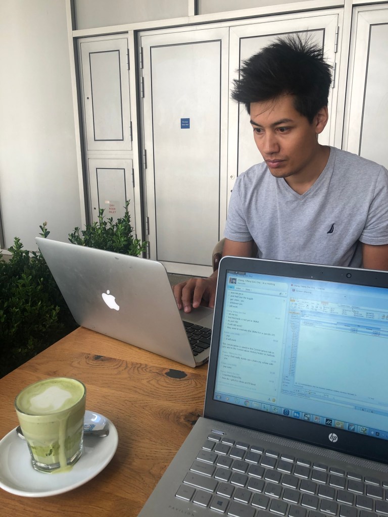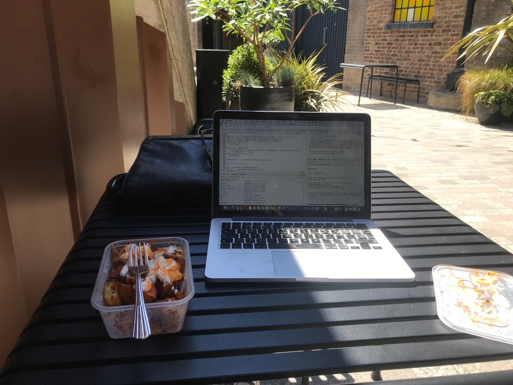 L woke up early again as she had loads of stuff to do, and headed off to Granger and Co while A was still in bed to get an early morning coffee. It was basically a fire outside and L was sitting in the sun. A came to join her but immediately had to move because in a few moments his skinny black jeans were a sludge of burning material. L was spending her time covering other people when she should have been working on her diversity stuff. They chatted a bit about finances and how they think about money differently. A was doing a bunch of dData and trying to solve how to bring in daily data in order that he could actually do the nowcasting he promised. They settled into a thankfully shady Notes, and ordered (all digitally) a Flat White and matcha latte, which L loved. They sat there for a bit until L had to head back and A ran out of battery because he forgot to charge his stuff like an idiot.
