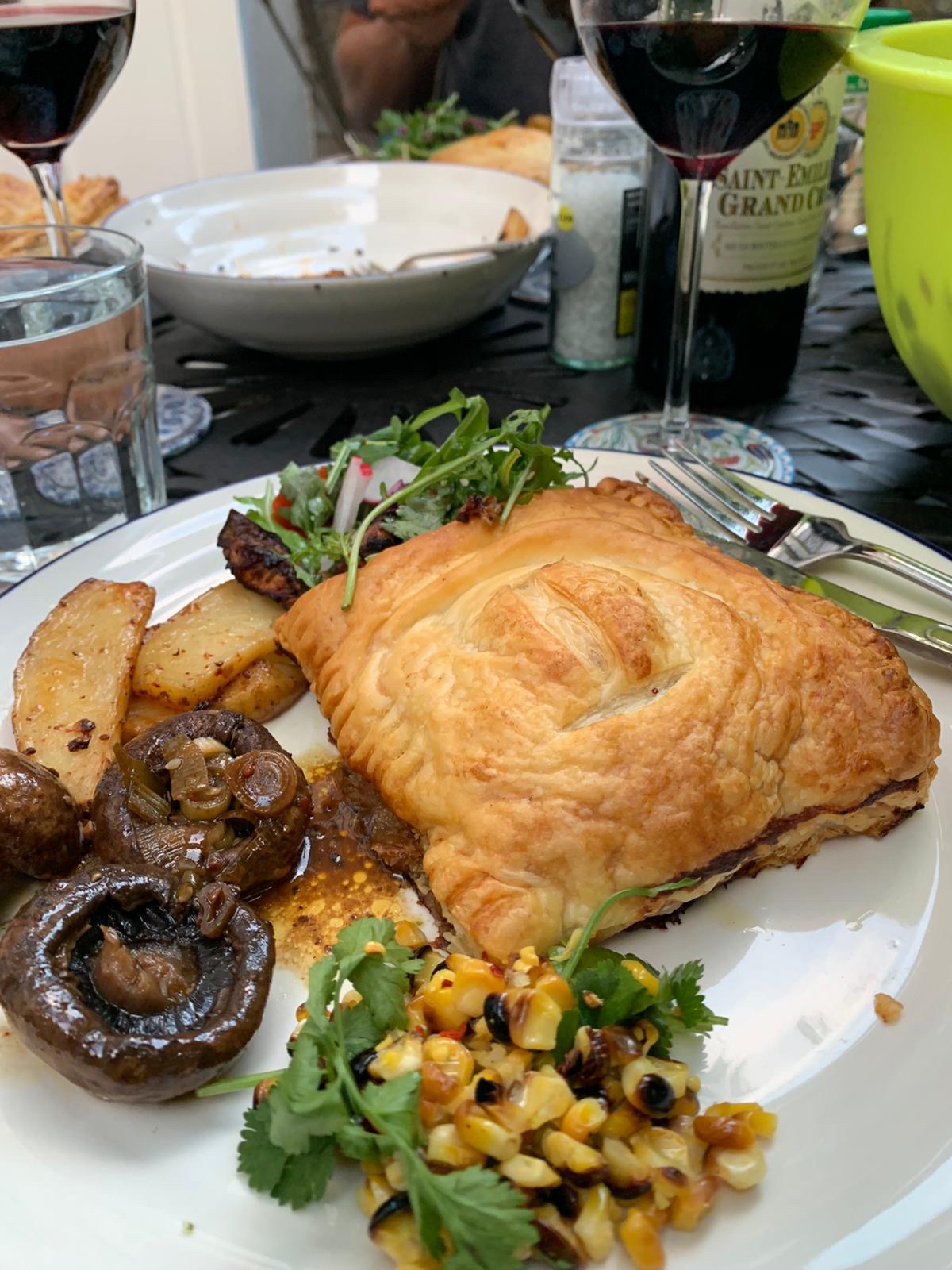 Leila woke up having slept a lot better, but had still woken up loads in the night. Alex lay in a little bit but not for long as he had to get started on some work for the WB. L set off to Granger & Co because it was sunny. She (supposedly) found a spot in the shade but by the time A arrived, it was a furnace again. They sat there happily anyway with their laptops topping their laps and had oat flat whites each. After a while, they decided to get some brunch given EOTHO and settled on some sweetcorn fritters (confirmed no dill) and halloumi, plus avo salsa. It took the a while, and once again the staff there seemed amazed by their niche detailed requests, but they love them and L made friends with the waitress. Whilst eating they chatted about A being far from his friends in America and next year’s living situ. A then ran back to the house to send off some WB work and L followed shortly after, did a quick pilates and then settled in for another hectic afternoon of b2b calls. A went to meet Paloma in Caravan for a few hours where he helped with her McKinsey interviews and they then came back to the house to finish off. They convinced Caravan to give them 50pc off drinks too. L took a break from calls to chat to Paloma and A for a bit and realised they have a similar background. They also bonded over A’s lack of knowledge of cultural sites/restaurants outside of West London but including Petersham Nurseries in Richmond Park. Then A and L both started cooking. L did miso aubergine in a salad with some juicy mushrooms and a grilled corn on the cob salsa thing. Also she had made potatoes earlier for A as she was freaking out that she’d have to eat them alone when he went away. A made 3 beautiful pastries with more mushrooms, cheese and spinach with our first initials on the top. Iman arrived at 7.30 and they started with some red wine and padron peppers and then brought out the feast.