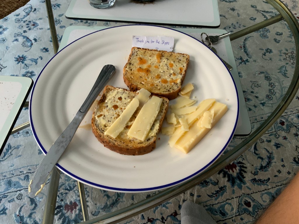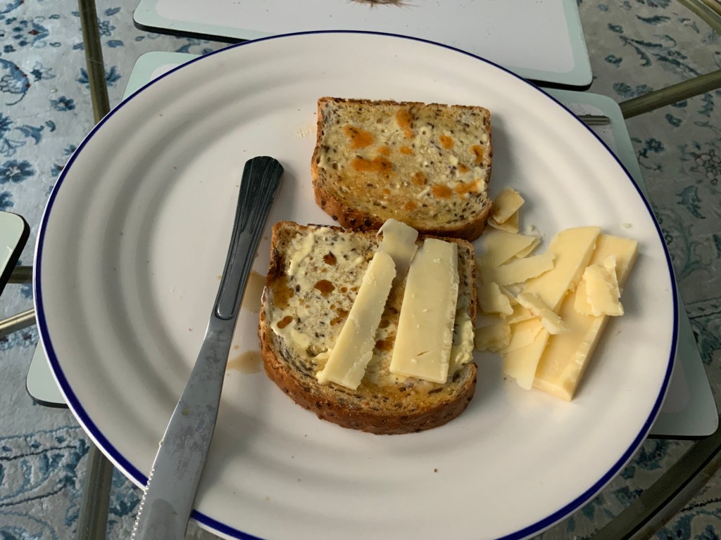 Chaos reigned in the afternoon when L tried to get onto a work call but O2 have collapsed in North London and none of our calls were working, A managed to get a Skype call through wifi going and L joined her call 15 mins late, she brought him up some toast and cheese as a thank you.
