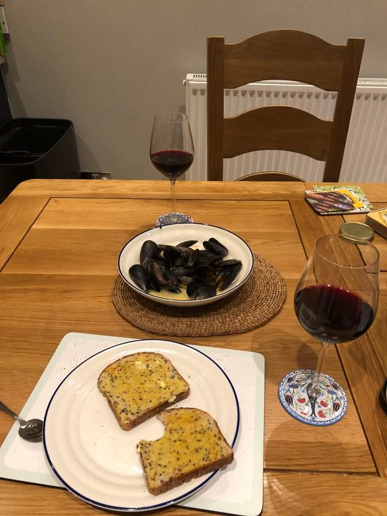 After a busy day of work, and L finally putting her OOO on, A made a dinner starter of Lidl mussels and Vogel’s bread with coriander. It was yummy and L was quite please A was enjoying the Vogels. They then made a stir fry dinner – L made a miso marinade and A did veg and noodles. They sat outside and drunk it with a nice bottle of a full red bodied wine from Waitrose.