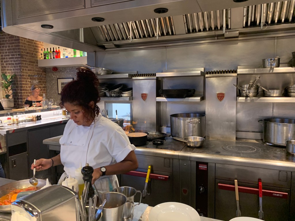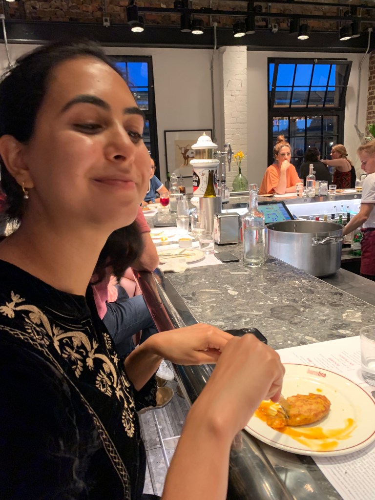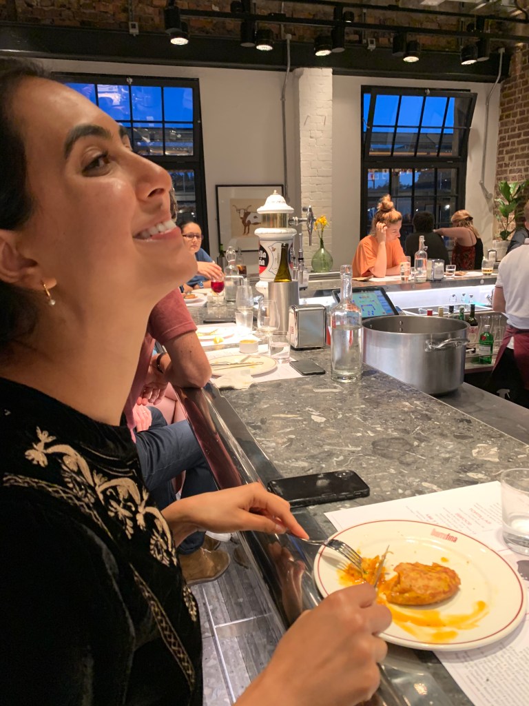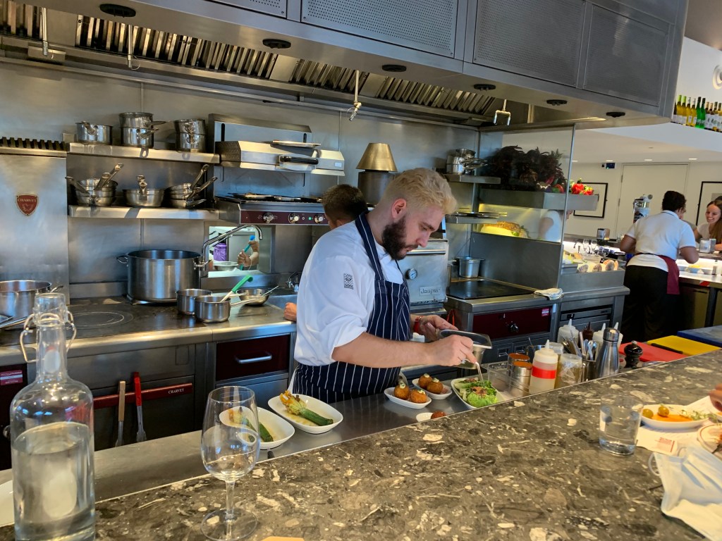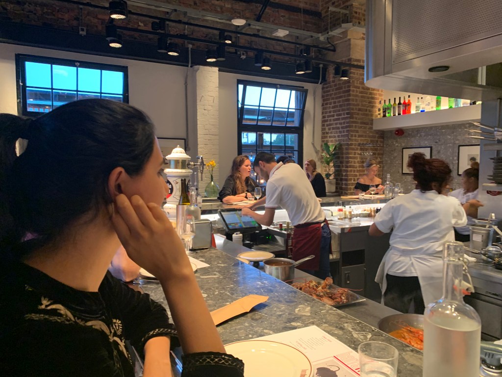 L put a dress on and A a white shirt and real trousers. It was the first time L had ever seen him dressed up like that. They headed to Barrafina and got the best seat in the house at the bar right in front of the head chef who was blonde on the top and brunette bearded. He was amazing and L was so impressed. They spent ages listening to him order everyone about in Spanish and saw how everyone clearly respected him. They were surprised that he literally signed off on every single dish that left the kitchen and put the finishing touches on each of them. He moved at such pace and didn’t look up at all. Any questions went straight to him and he looked like his was in a flow zone. They ate: a courgette flower with cheese, some little balls with cod and potatoes, hake with a nice sauce and bread to mop it up, and prawn tortilla. £30 for both for a michelin star restaurant, quite amazing. They also drunk unlimited sparkling water which L regretted a few hours later in the middle of the night. L was happy she was with A because she didn’t need to talk to him and could instead just watch what was going on in the restaurant and listen to the Spanish. They did chat a little bit and L got excited for a potential Vancouver trip. When they came back they talked about type 1 and 2 relationships before going to bed. L was very very pleased before bed and she felt really lucky and like she was on holiday. They did a little reading together in bed before falling asleep happy and full.