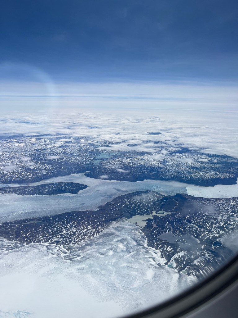 Alex had a LONG flight to come see Leil in Montreal (he flew over greenland, pictured). He was meant to arrive at 2.15pm but it was more like 5.30pm by the time he got to her aunty’s house. His flight took off an hour later than planned and when he got in they had to be transferred from the domestic to international terminal. He then sat for 1.5 hours in the work permit office (esssentially a waiting pen for anyone who needed extra security), waiting for his docs to be assessed.