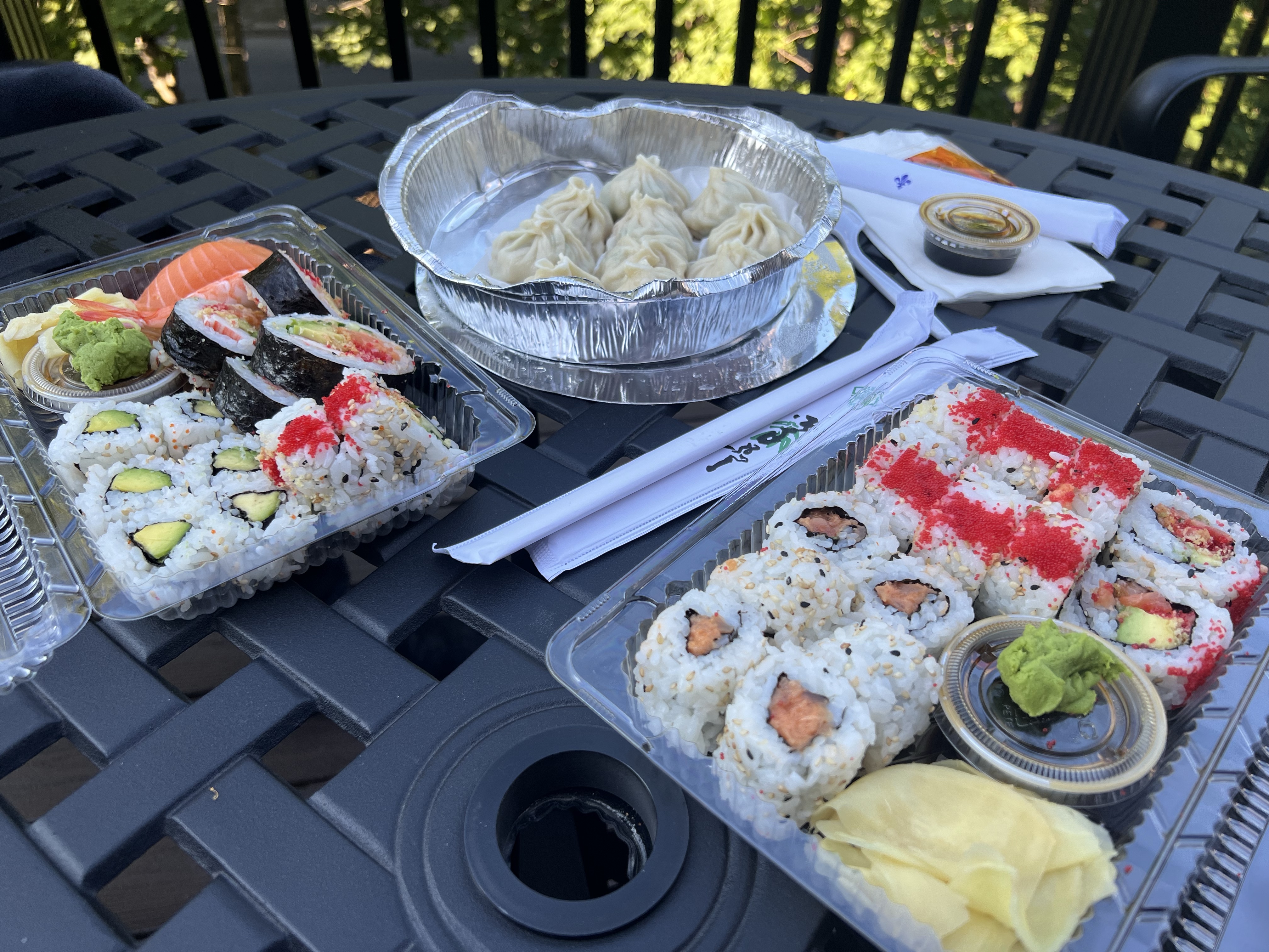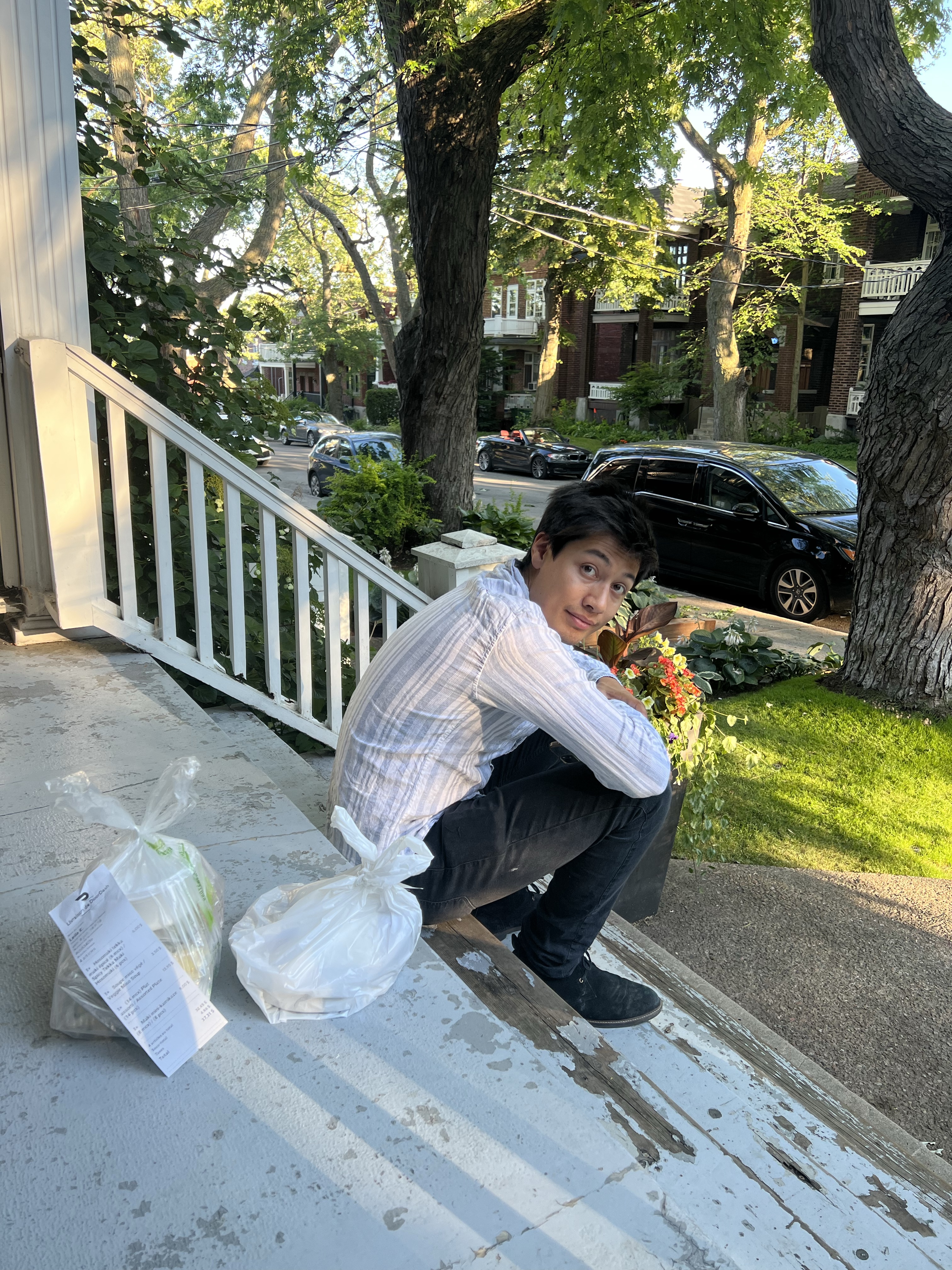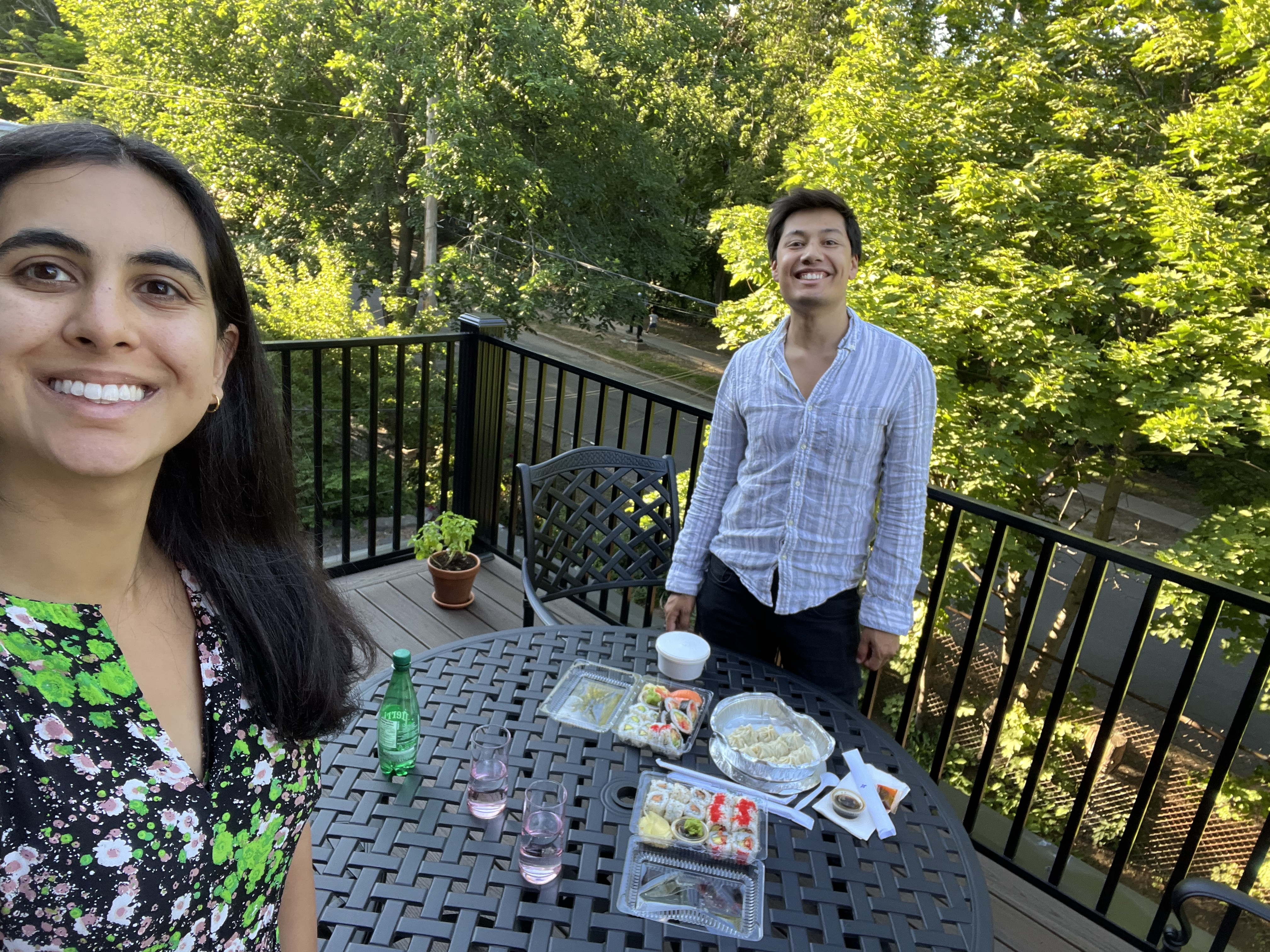 After work they decided to order DoorDash and spent way too long deciding between Sushi places because Leila wanted salmon and avo meanwhile Alex wanted to support the little locals. In the end they chose an OK sushi place but doubledashed with some very expensive but nice dumplings and ate the dinner on the terrace.