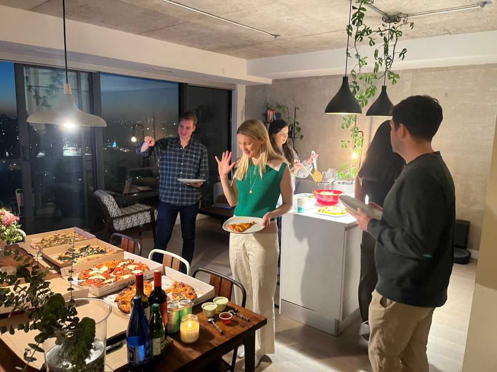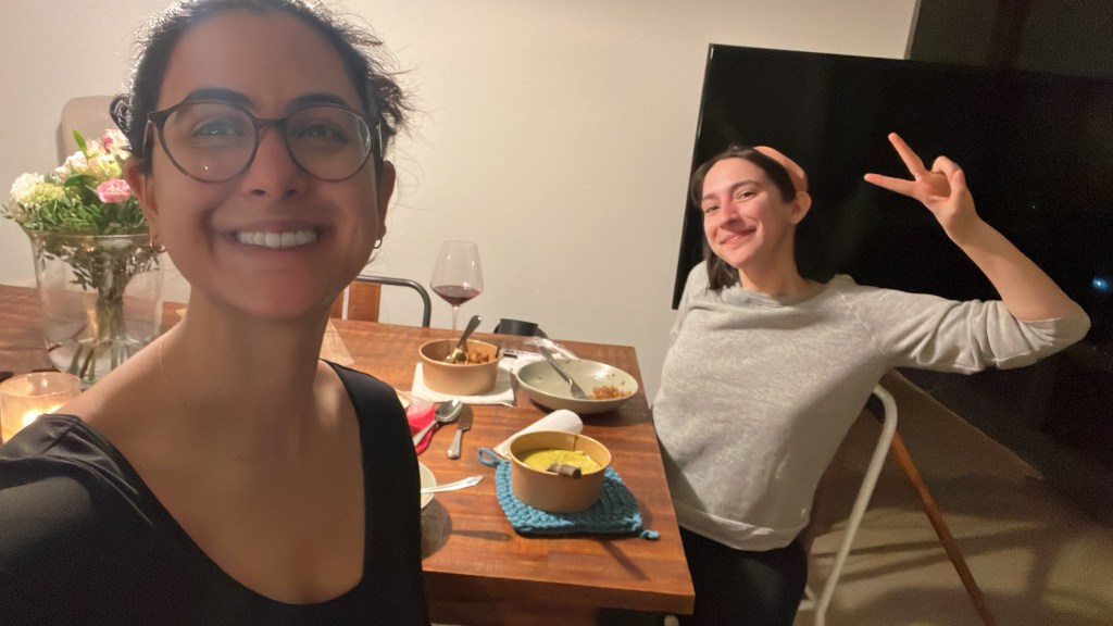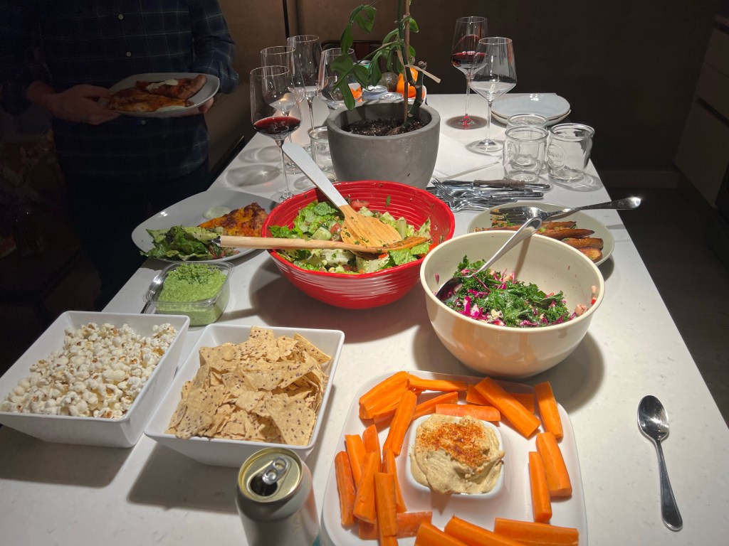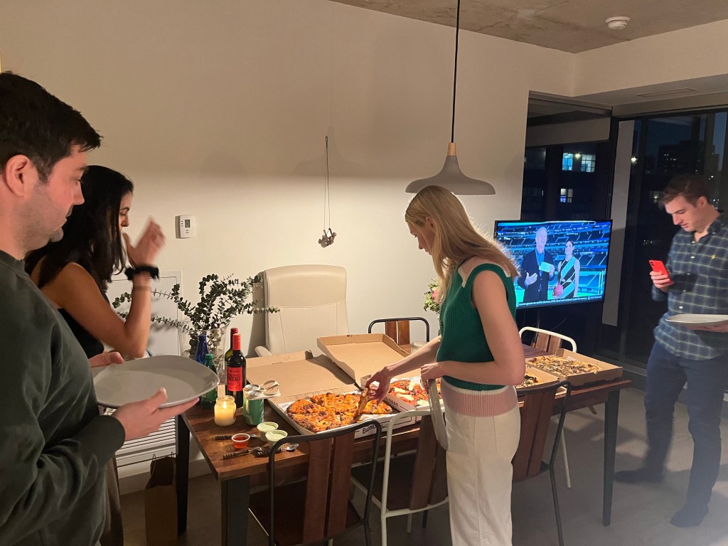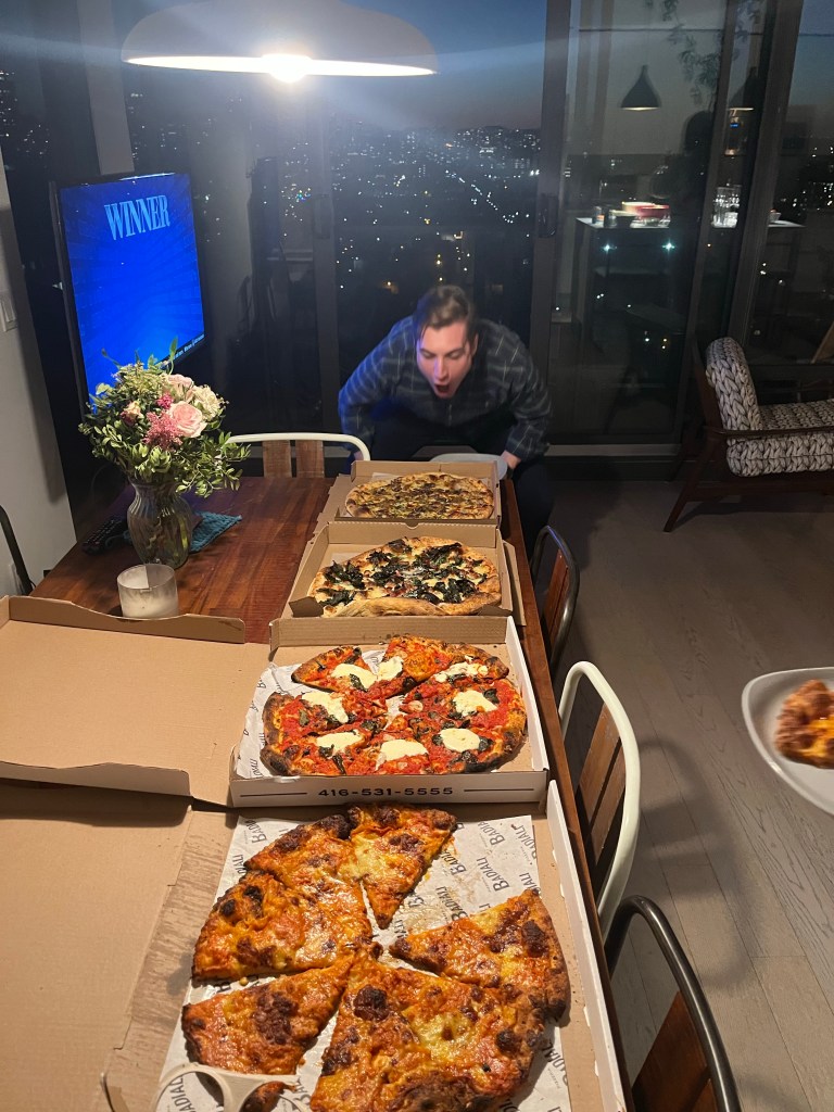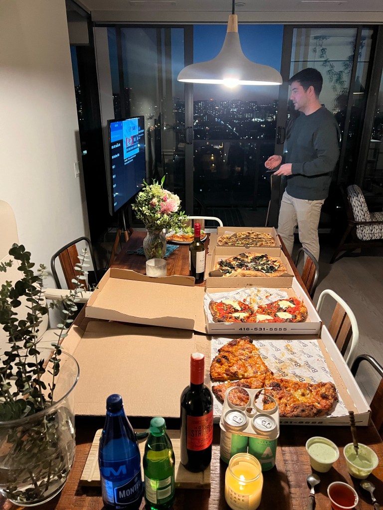 On Sunday he was feeling much better and they organised. They spent the day cleaning ahead of Super bowl Sunday. L was so so happy after they cleaned. They went to Badiali to pick up pre ordered pizza (L felt very good about it because the queue for pizza was so long and they had pre ordered). In the evening Tamara, Will, Paddy and Annie came over for Super bowl and they made some snacks and got more pizza from North of Brooklyn (not as good as badiali). It was so fun to host again, and Land A are great at hosting together! Flat loooked amazing and L was very proud of them. She didn’t watch any football but she loved watching the ads. All the other brought drinks and food and snacks etc, and she felt very lucky to have good friends in TO.
