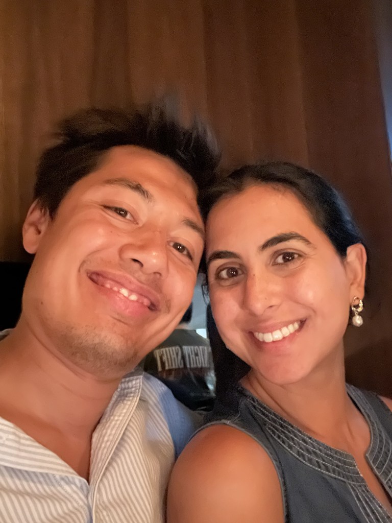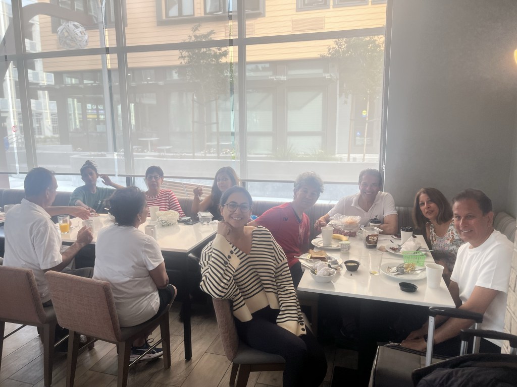 The next day they went on a long hike with the Esmail family but not before L’s dad took A shopping and he bought shorts and the same white t shirt that dad has. The hike was lovely through Redwood park and they all had deep chats in 2s. A spent a lot of time talking to L’s mum and they also spoke to the parents about weddings. Then they went to Sweetgreen which L loved but dad ordered wrong and didn’t love so much. They got ready in indian outfits then headed to the Sangeet. They learned the dance last minute and taught everyone else, then performed it with the whole family to Chaiya Chaiya and even Karen joined in. There were lots of dances by all of Noureen’s friends and they ate indian food.